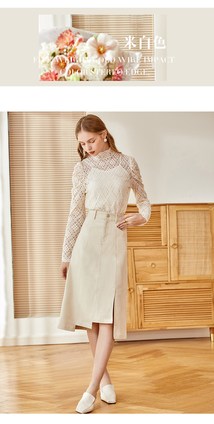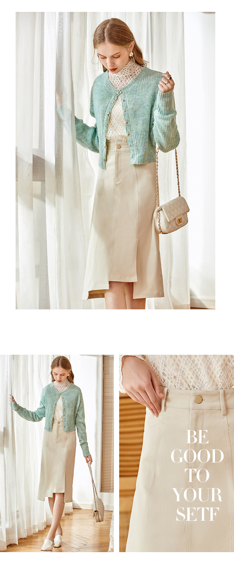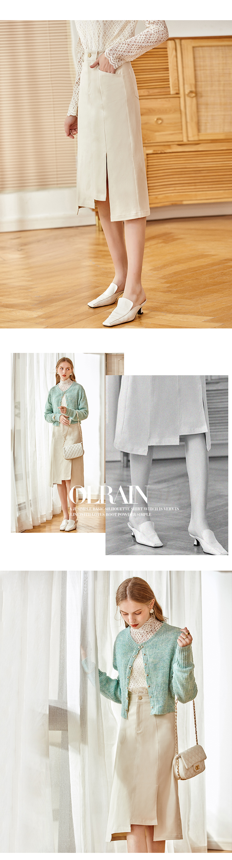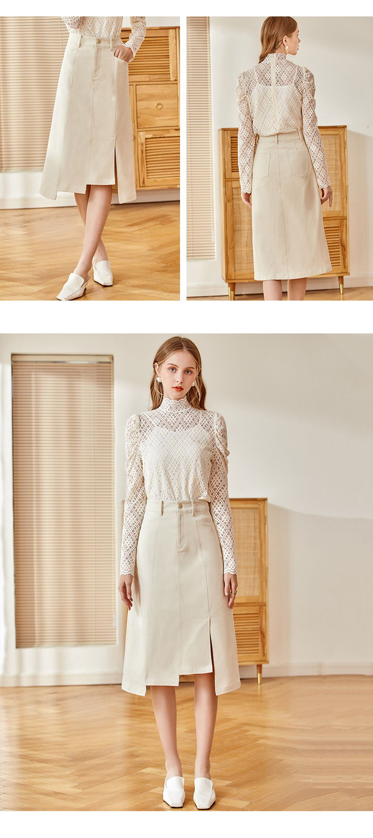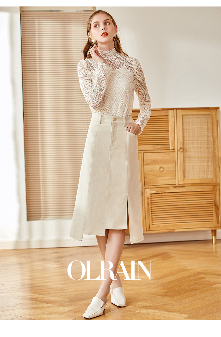 欧芮儿杏仁白半身裙女春季新款气质复古显瘦不规则开叉牛仔铅笔裙