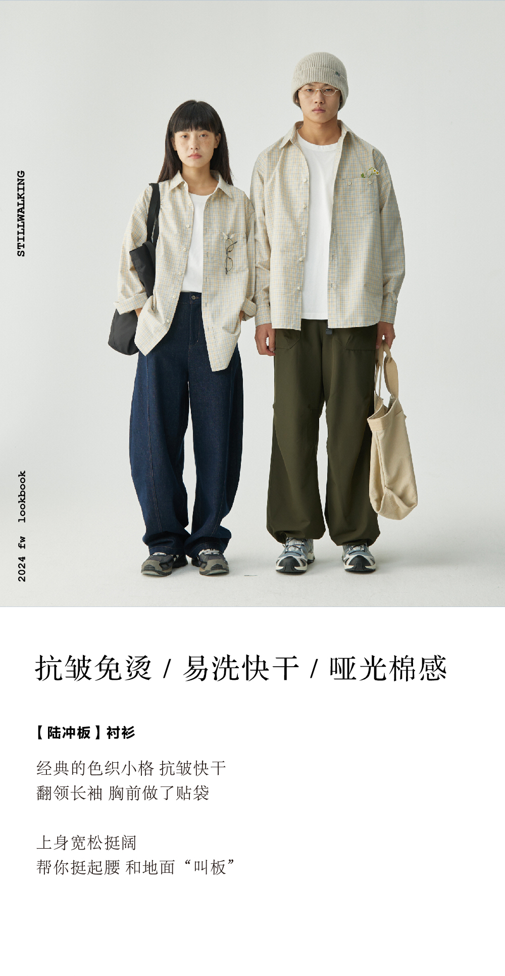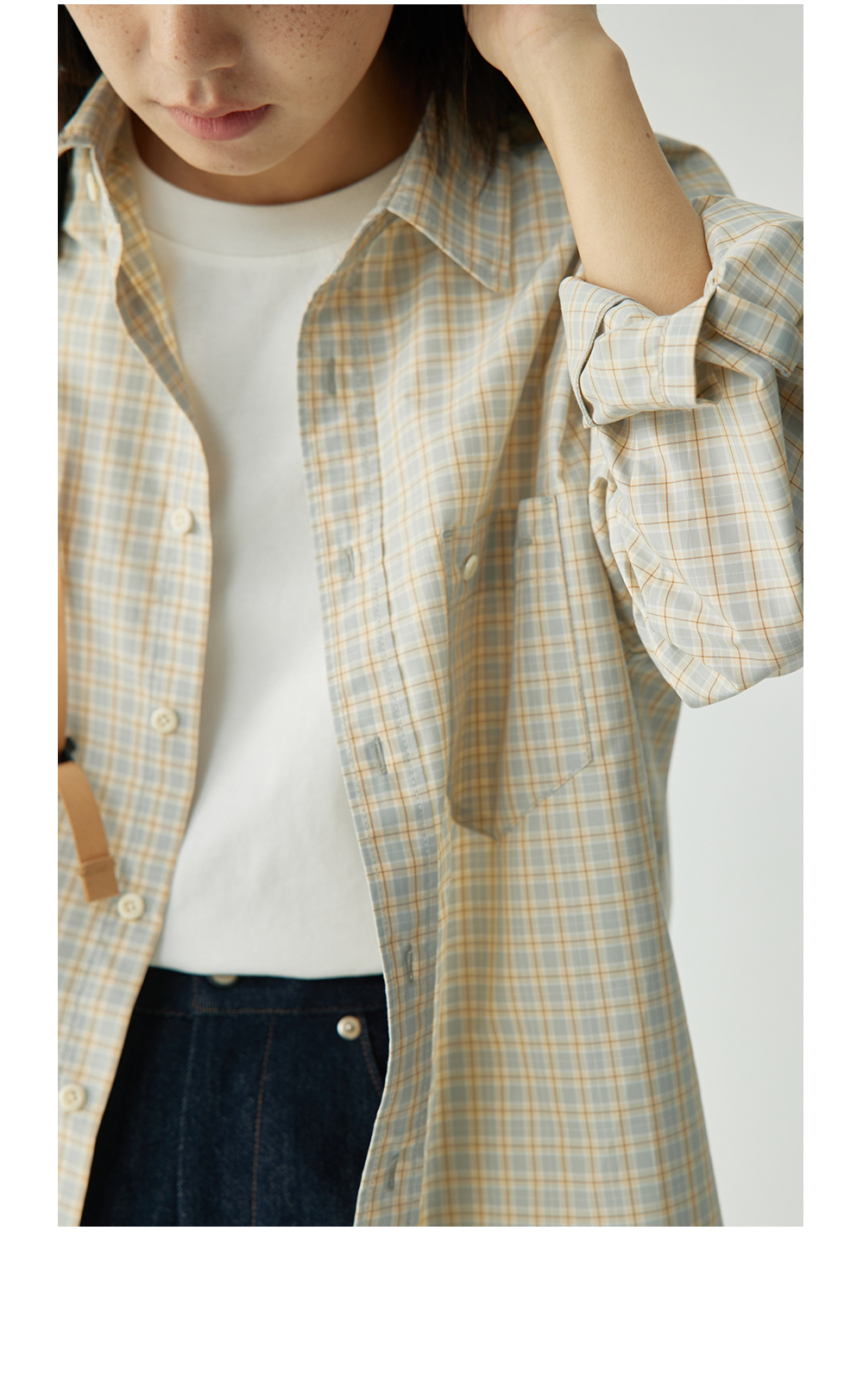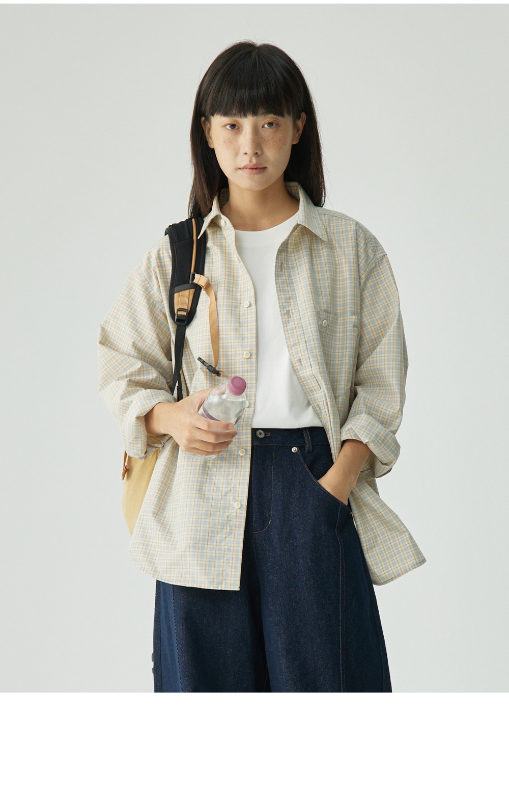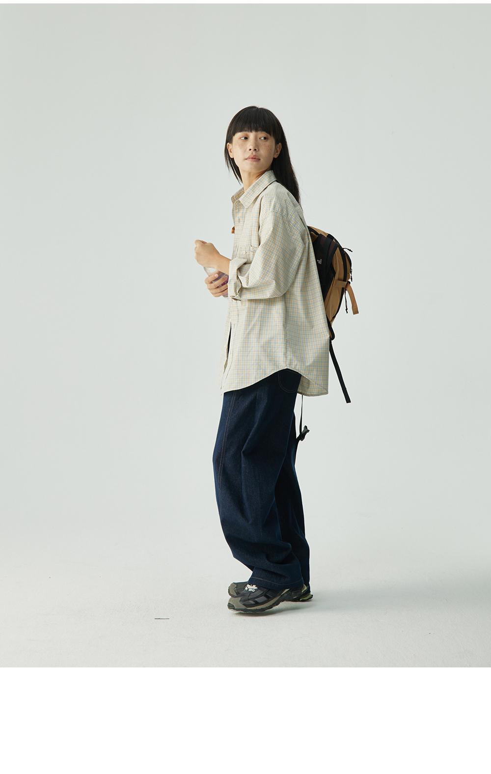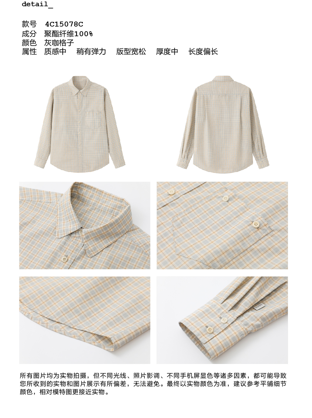 步履不停/4C11204C/复古清新翻领灰咖格子长袖衬衫