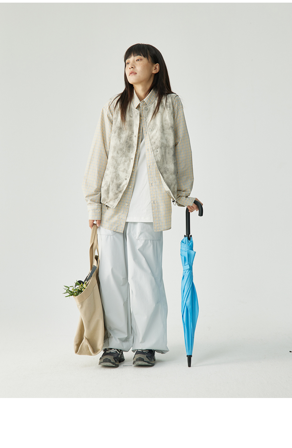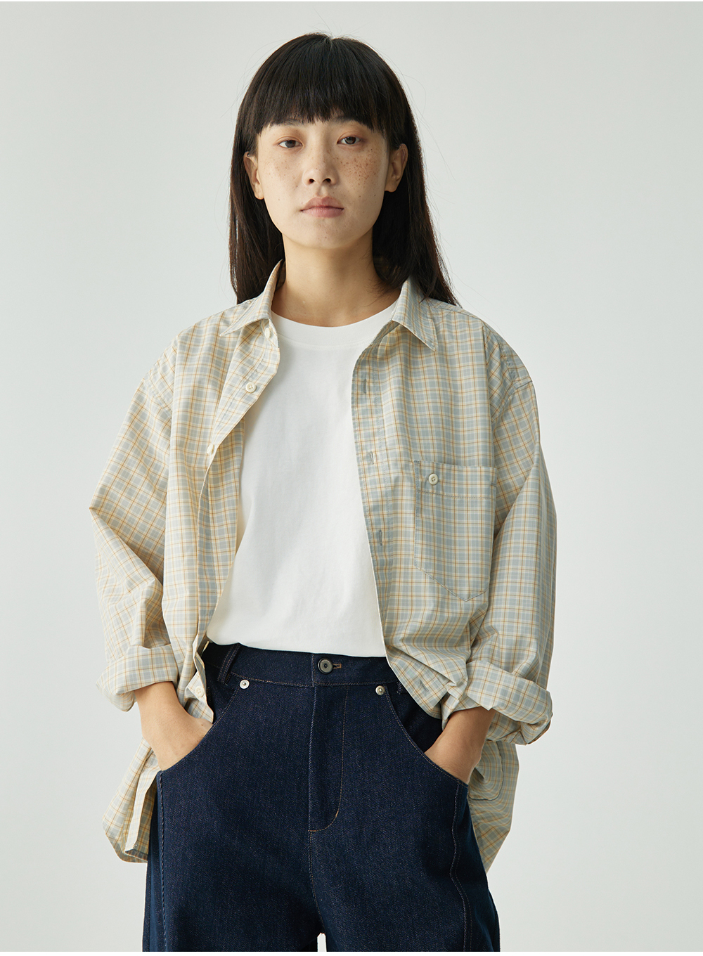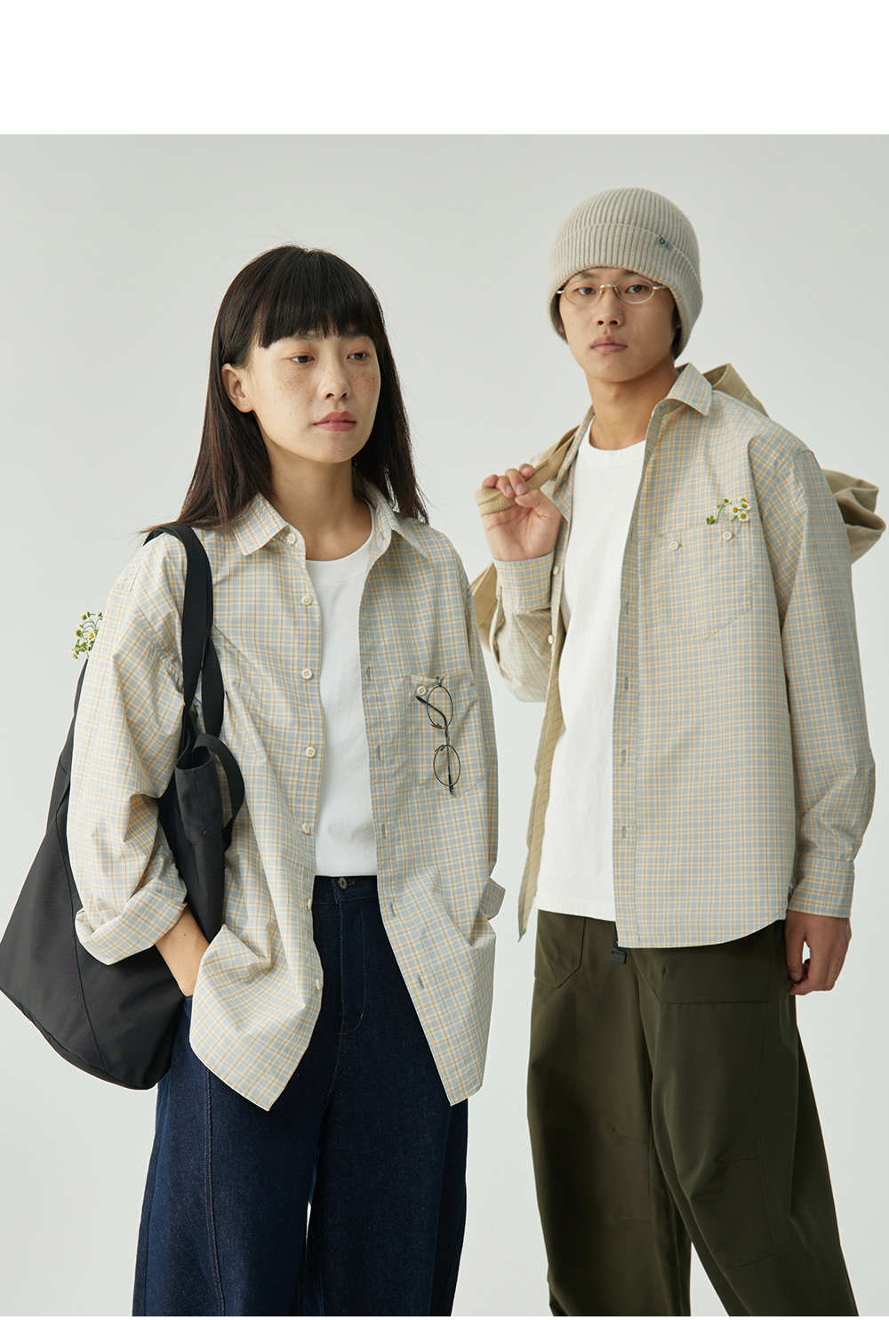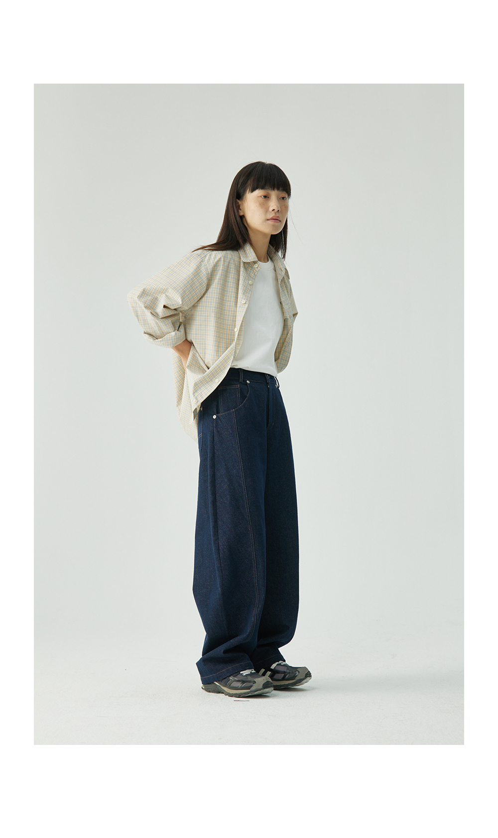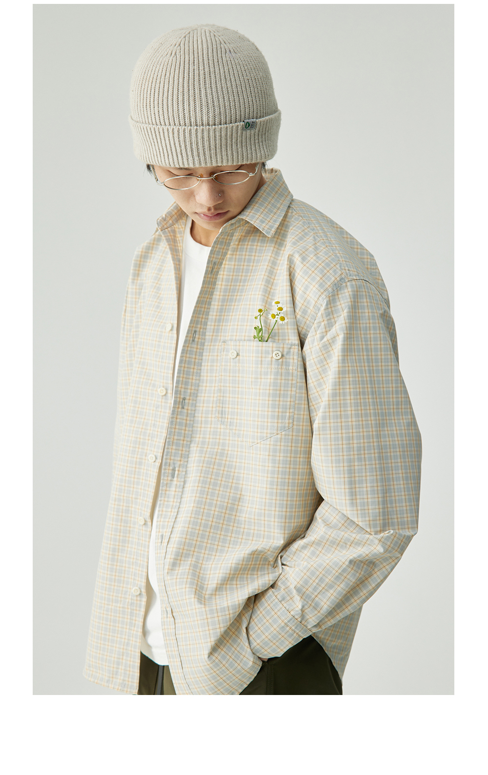 步履不停/4C11204C/复古清新翻领灰咖格子长袖衬衫