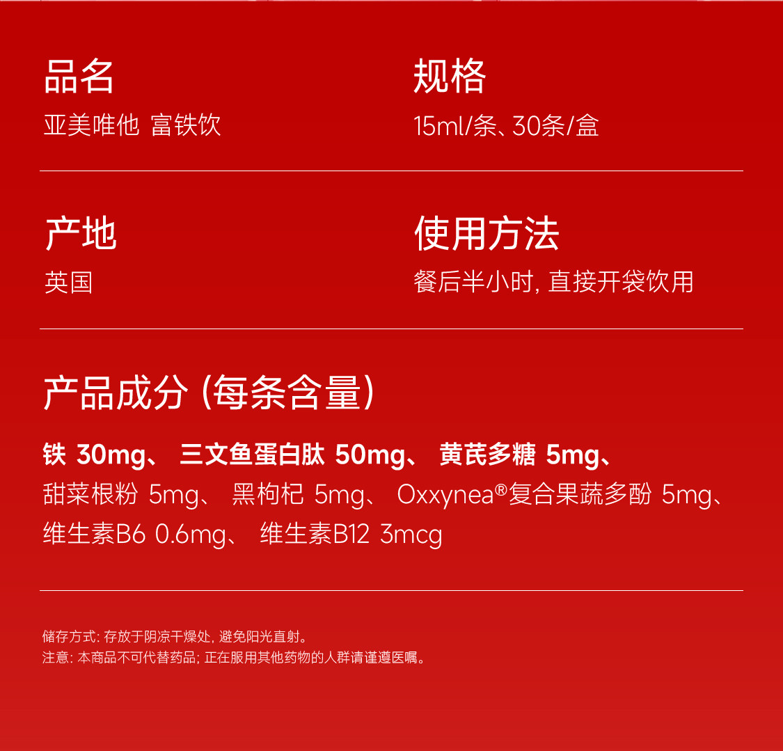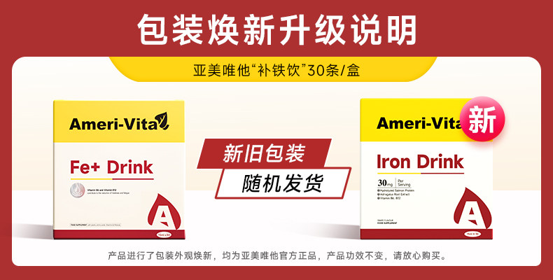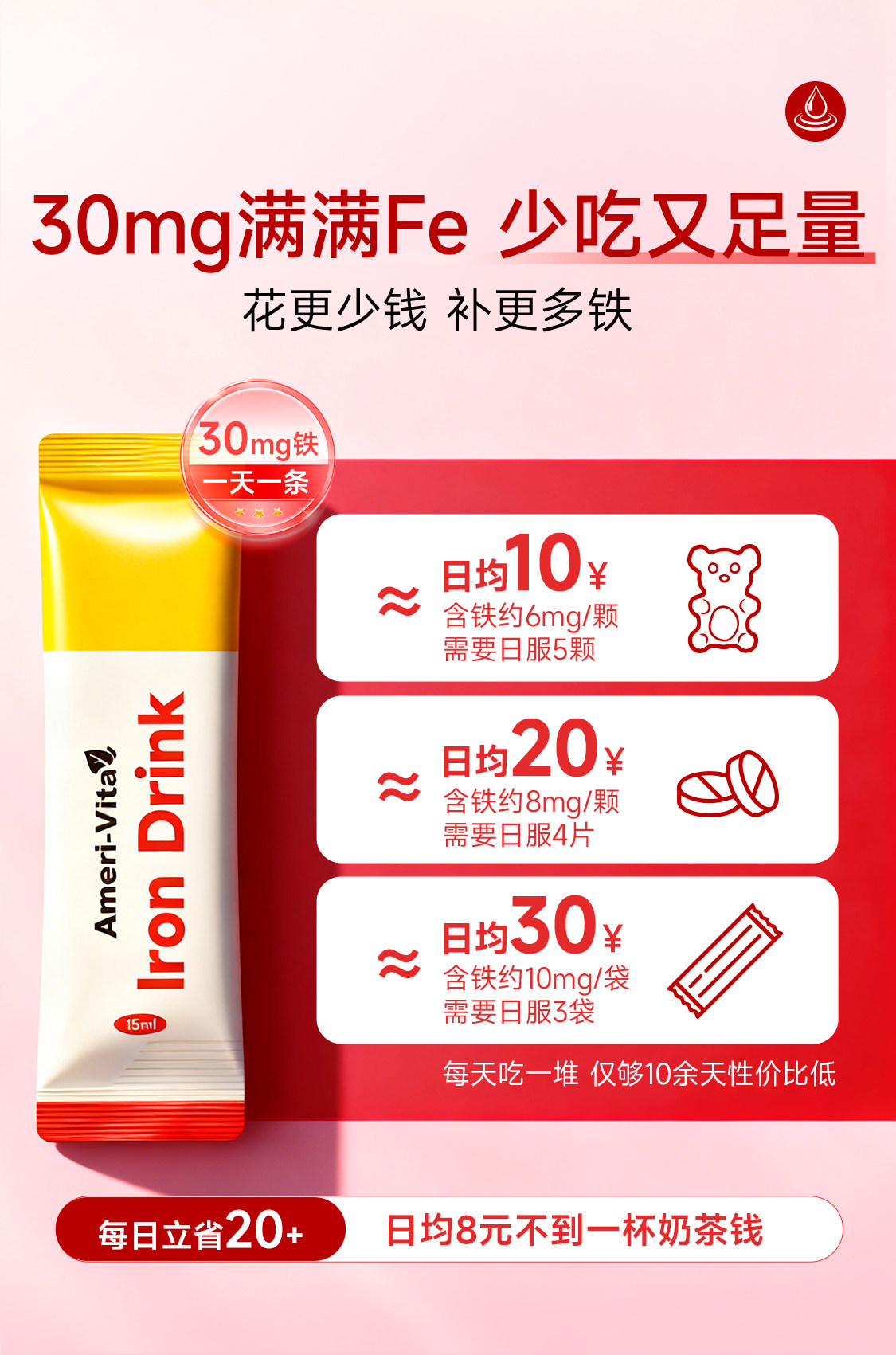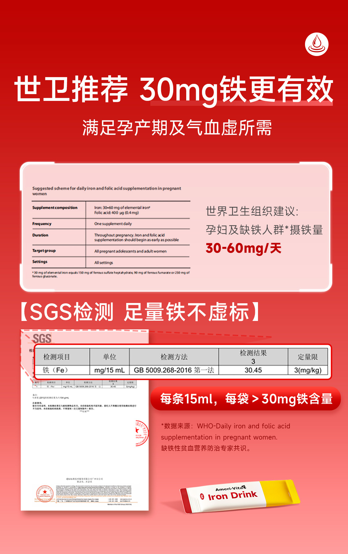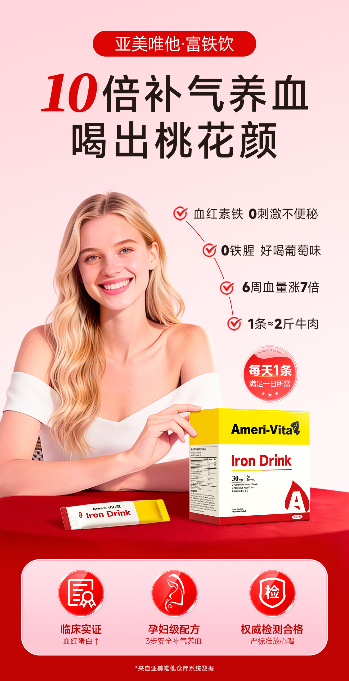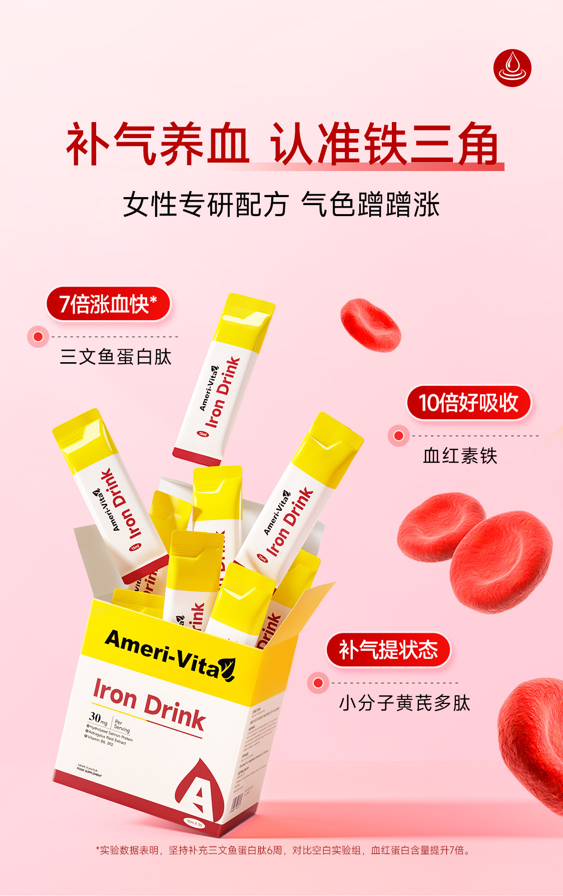 【周期见效 指标提升UP↑】Ameri-Vita亚美唯他 富铁口服液小A条 30条/盒 孕妇贫血女性经期便携铁剂铁元素口服液
