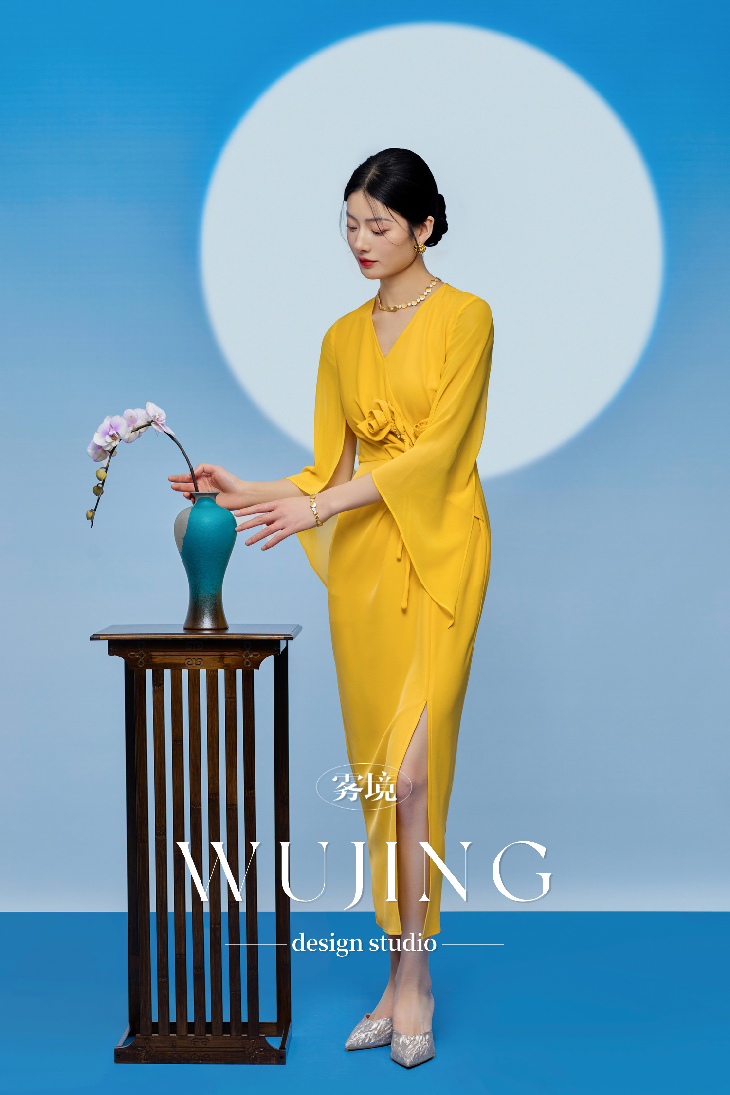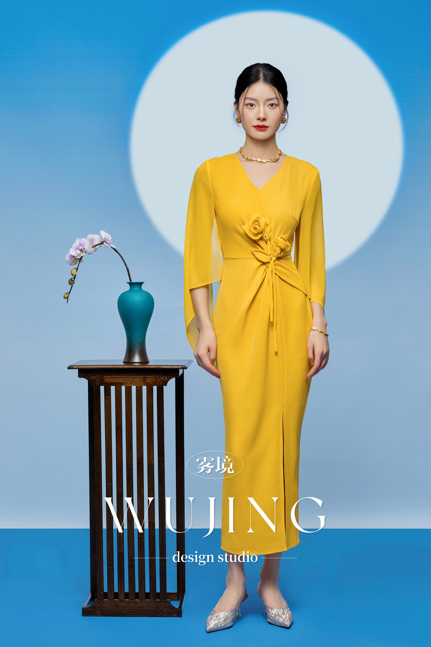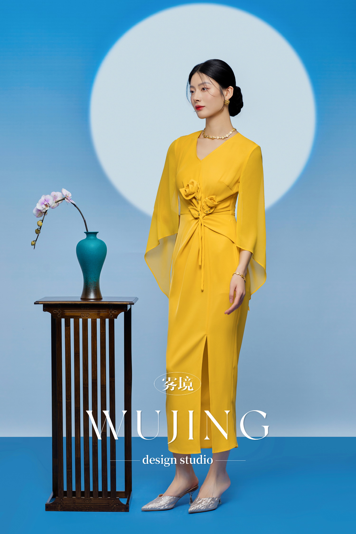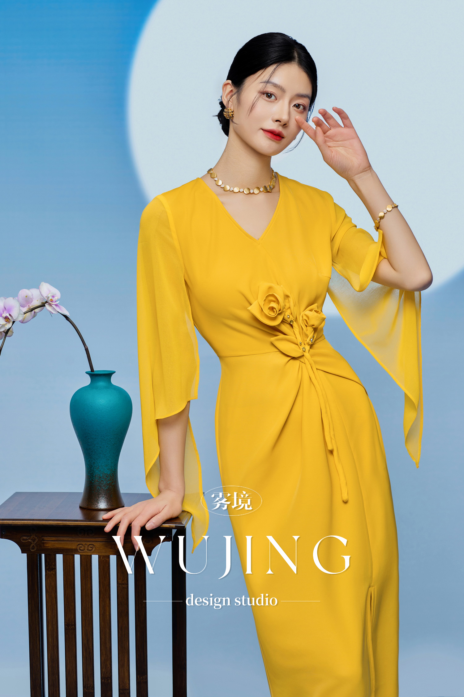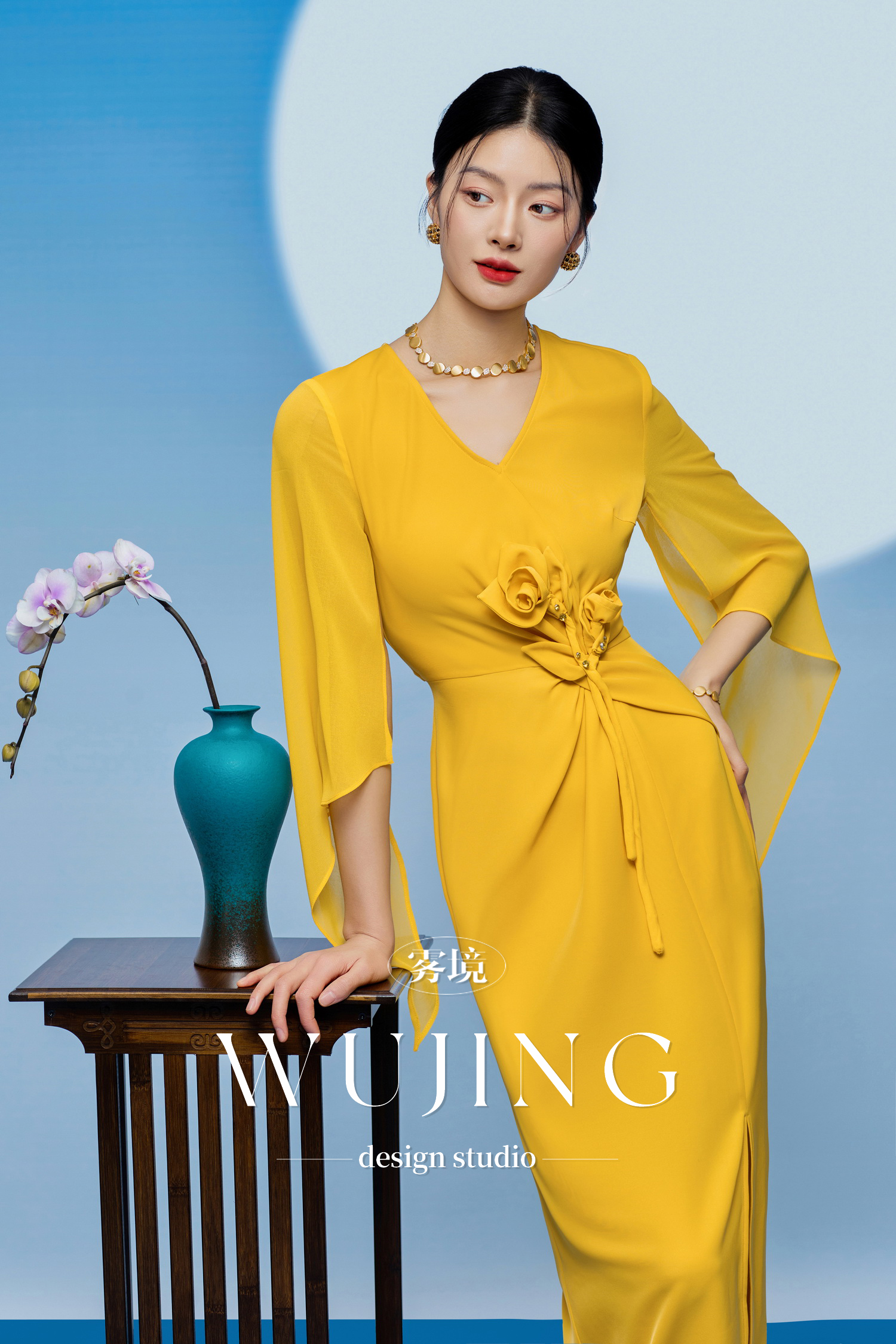 3205002 黄莺凝香 进口纹理蜂窝缎/韩国进口水晶乔其纱连衣裙 雾境