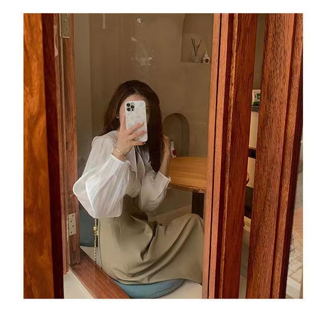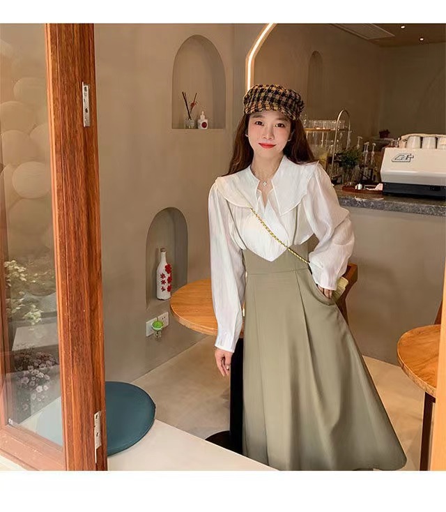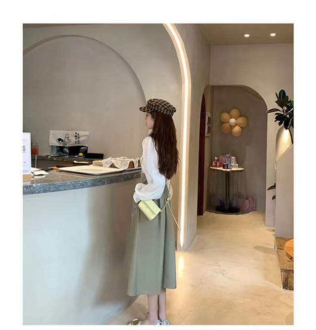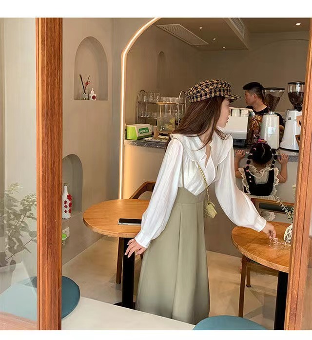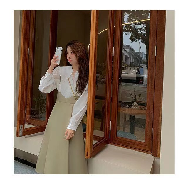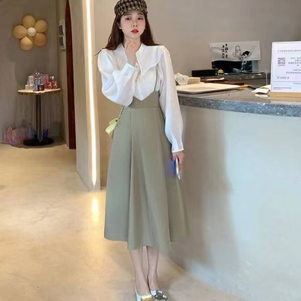 (清仓现货)【社群供A】新款两件套装时尚衬衫+高腰半身A字裙涤纶