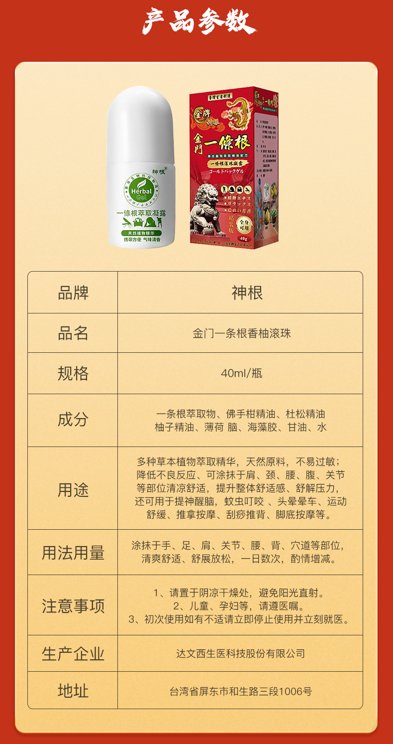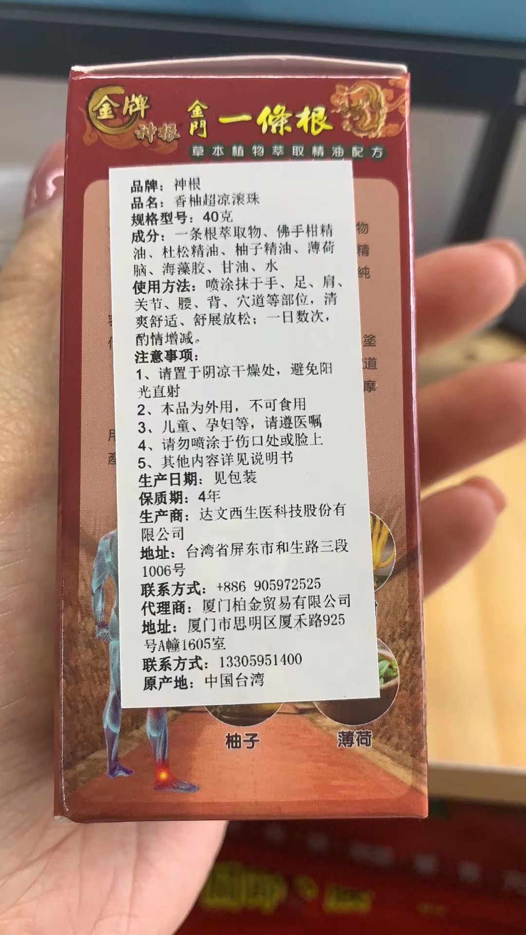 【品名】中国台湾一条根龙牌滚珠软膏 植物精华 【规格】 40ml滚珠1瓶装 40ml滚珠2瓶装 50g温感软膏 50g凉感软膏 120g热感软膏 【产地】中国台湾 【发货包装】独立包装盒 【发货地】江西 【发货快递】中通、圆通、邮政 【运费模板】宁夏、青海+5元,新疆、内蒙、西藏+16元/单 【发货时效】48-72小时,周末节假日顺延 |