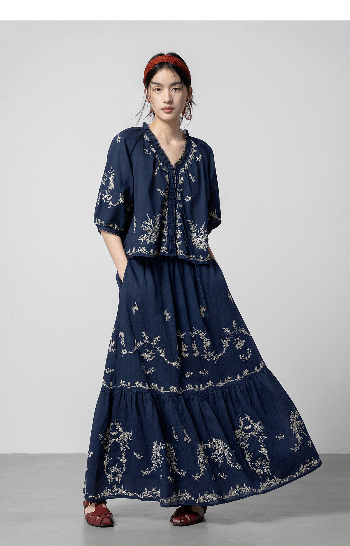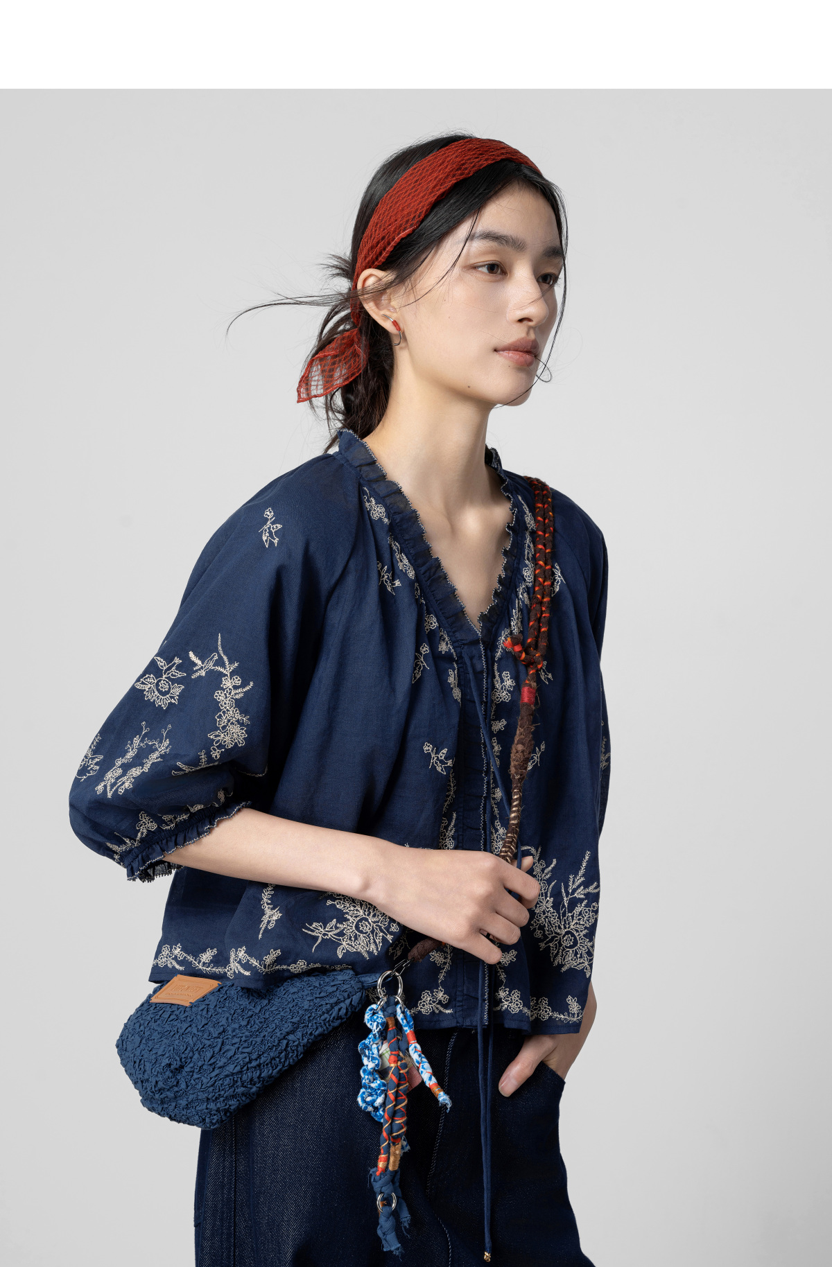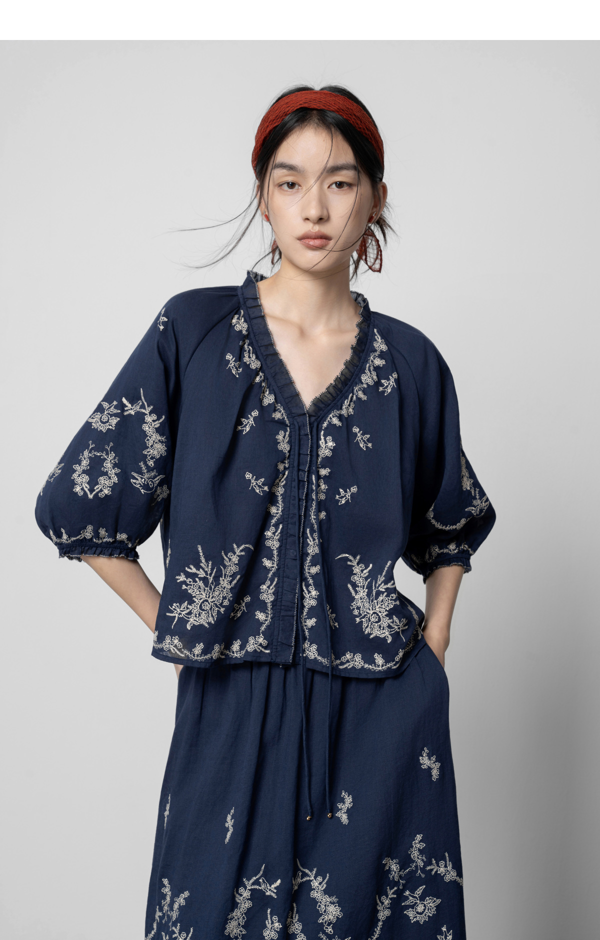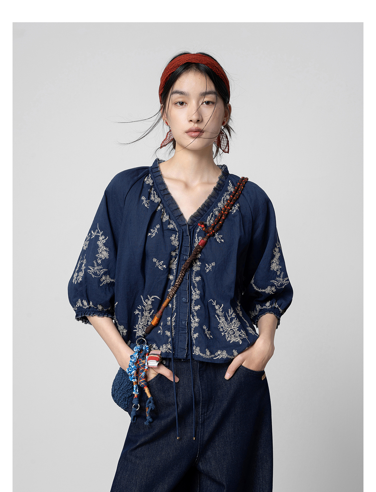 【林栖设计小店】鸟戏花间|藏青色绣花肌理宽松百搭2026春新款优雅衬衣1961146