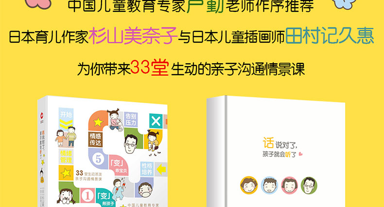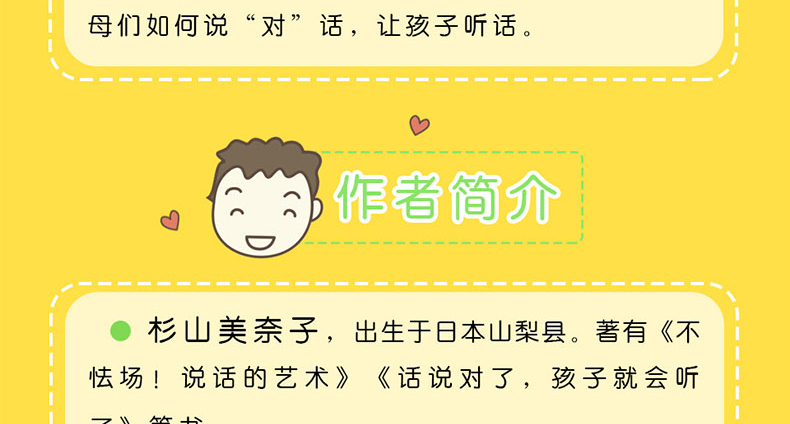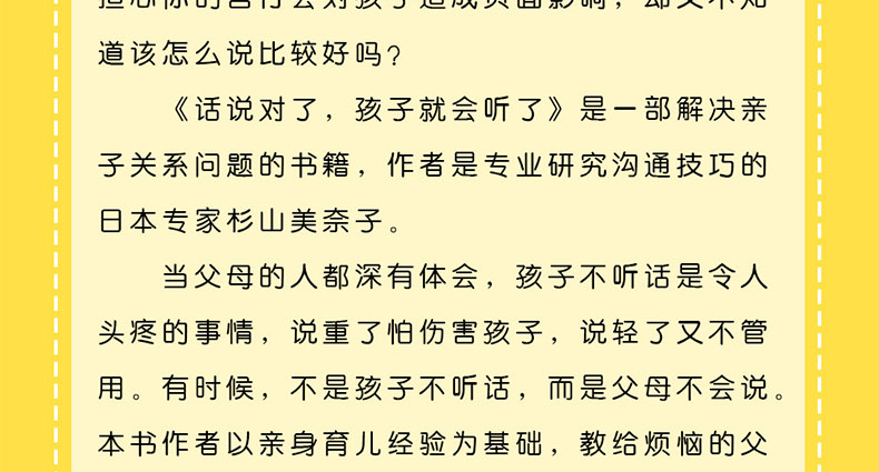 孩子老是听不懂,或不肯好好听话吗?你老是不小心对着孩子大爆炸,然后再偷偷忏悔吗?担心你的言行会对孩子造成负面影响,却又不知道该怎么说比较好吗?杉山美奈子著的《话说对了孩子就会听了(精)》是一部解决亲子关系问题的书籍,作者是专业研究沟通技巧的日本专家杉山美奈子。当父母的人都深有体会,孩子不听话是令人头疼的事情,说重了怕伤害孩子,说轻了又不管用。有时候,不是孩子不听话,而是父母不会说。本书作者以亲身育儿经验为基础,教给烦恼的父母们如何说“对”话,让孩子听话。
