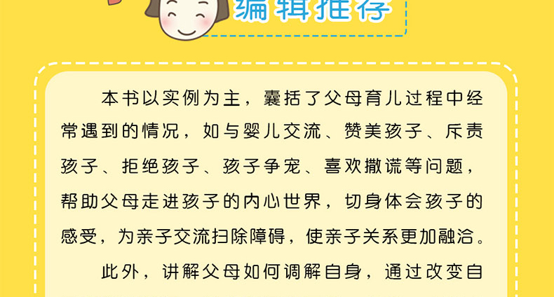 该书以实例为主,囊括了父母育儿过程中经常遇到的情况,如与婴儿交流、赞美孩子、斥责孩子、拒绝孩子、孩子争宠、喜欢撒谎等问题,帮助父母走进孩子的内心世界,切身体会孩子的感受,为亲子交流扫除障碍,使亲子关系更加融洽。此外,父母如何调解自身,通过改变自己来影响孩子,减少自己的压力,也是不同于一般育儿书籍的一大亮点。