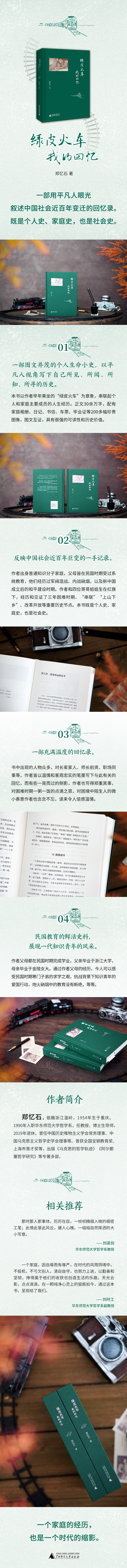 本书是一部用平凡人眼光叙述中国社会近百年变迁的回忆录,既是个人史、家庭史,也是社会史。全书以作者早年乘坐的“绿皮火车”为意象,串联起两代人的生命轨迹:从未谋面的父亲、一生坚毅的母亲、努力上进的兄姐、困难时期的生活点滴、面粉厂当工人、改变命运的高考、跻身大学讲台实现理想。从民国军阀混战、抗战岁月,到新中国成立后的和平建设、“上山下乡”、改革开放,举凡近代中国社会变迁的重要节点都有涉及。书中配有家庭相册、书信、车票等200余幅珍贵图像,图文并茂,具有很强的可读性和历史价值。