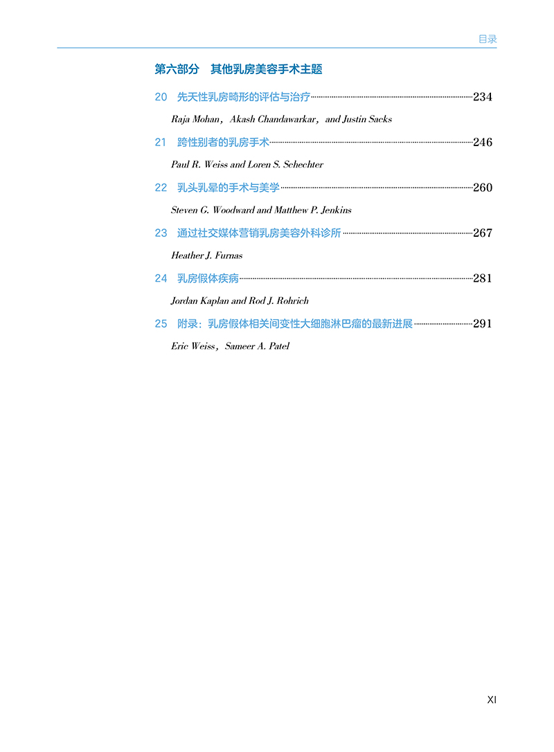本书分为25章,是一本关于乳房美容整形手术的图书。由国际上知名的整形外科医生编写,他们不仅有丰富的临床经验,而且得到了国际认可。他们对乳房美容手术的各个方面进行了研究。这本教科书既可以为刚刚从业的整形外科医生、医学生提供参考,也适合经验丰富的高级外科医生。书中选择了与隆乳有关的经典主题:上提、复位和修复手术以及呈现相对较新观点的主题。这些让人们认识到随着时间的推移,人体的变化和不可预测的可能性。在任何择期手术中,我们都有专门的以管理为重点的修复手术以及对不良结果的纠正,这在本书中有详细的介绍。在乳腺组织薄弱或软组织不好的情况下如何处理,本书也有细致的介绍。本书还有一个章节介绍了变性手术的乳房整形,内容虽然不多,但资料很珍贵