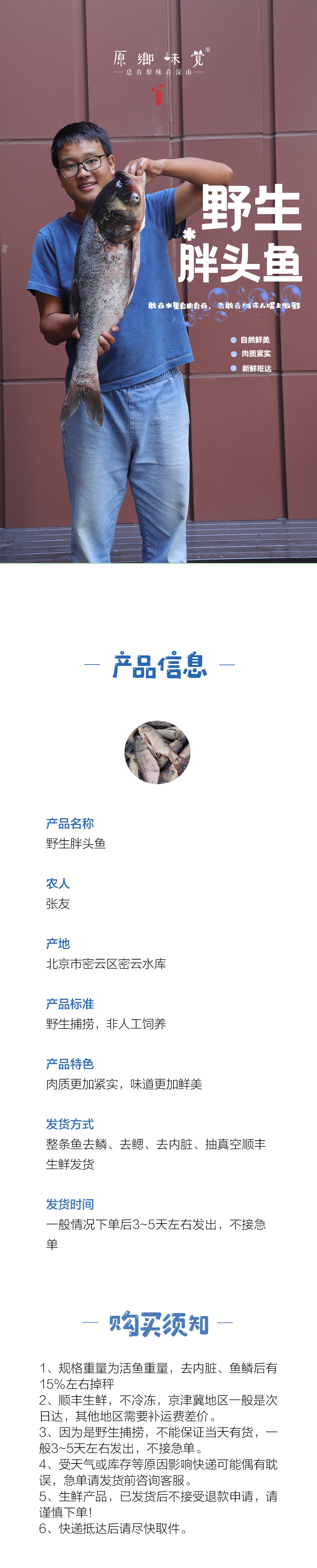 【新农人】:张友 【种类】:桂鱼、胖头鱼、鲫鱼、虾米 【产地】:北京市密云区密云水库 【产品标准】:野生捕捞,非人工饲养 【产品特色】:肉质更加紧实,味道更加鲜美 【发货方式】:整条鱼去鳞、去鳃、去内脏、抽真空顺丰生鲜发货 【发货时间】:一般情况下单后3~5天左右发出,不接急单