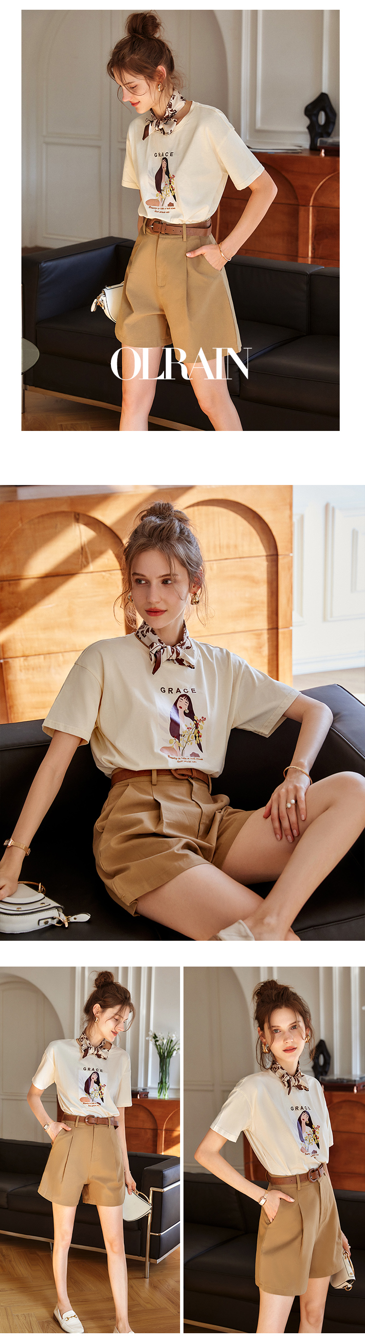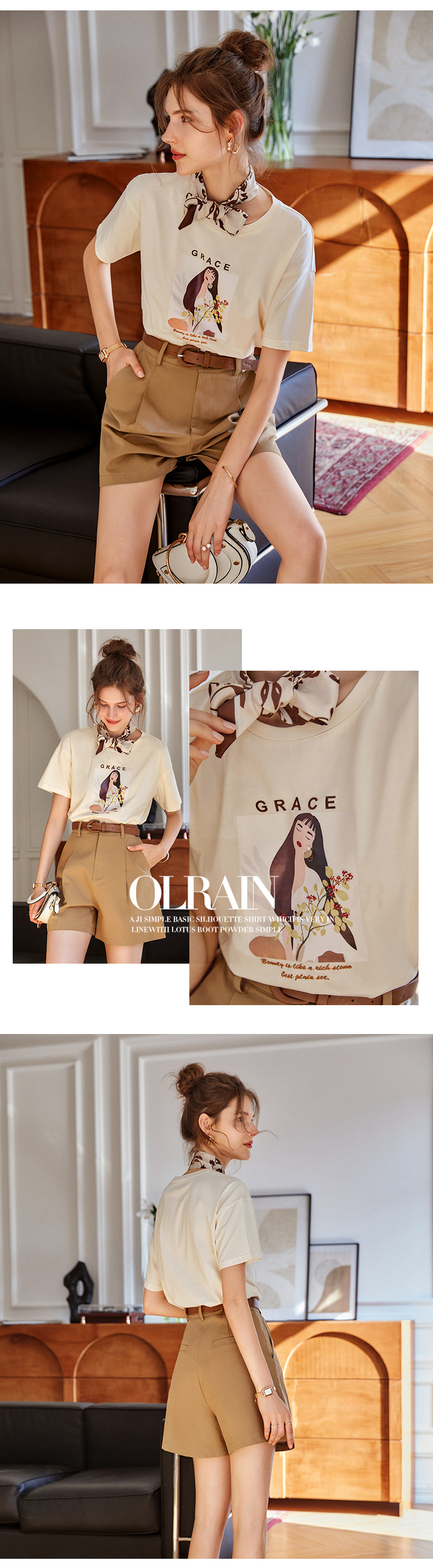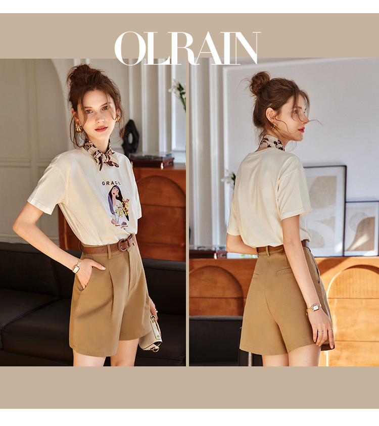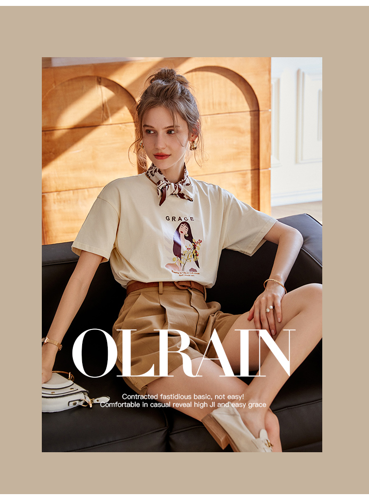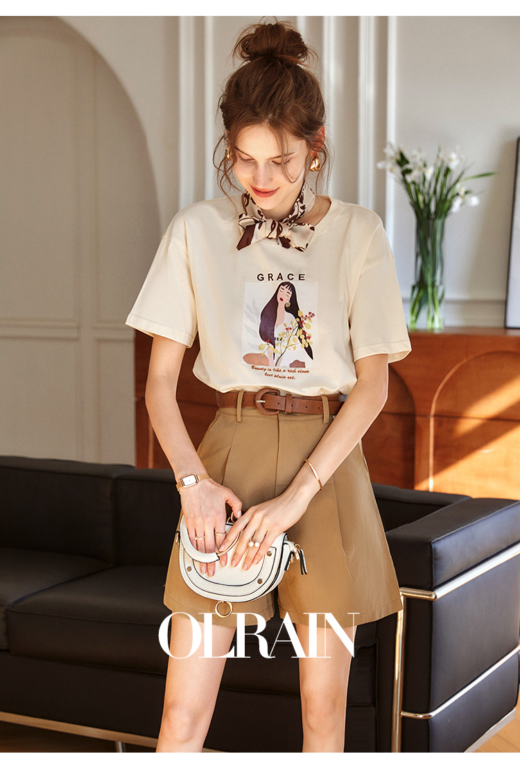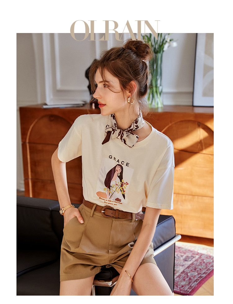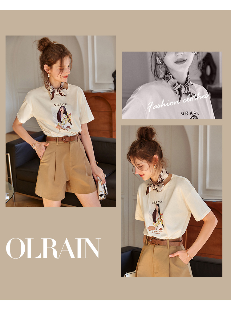 OLrain欧芮儿法式米白色短袖T恤女春季2023新款宽松印花休闲上衣
