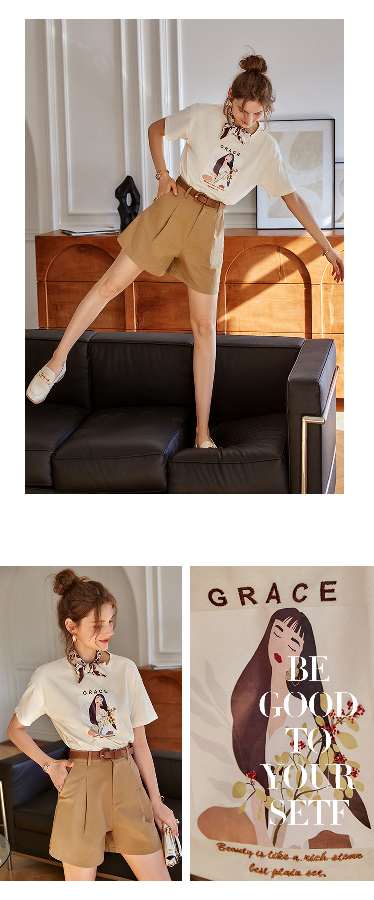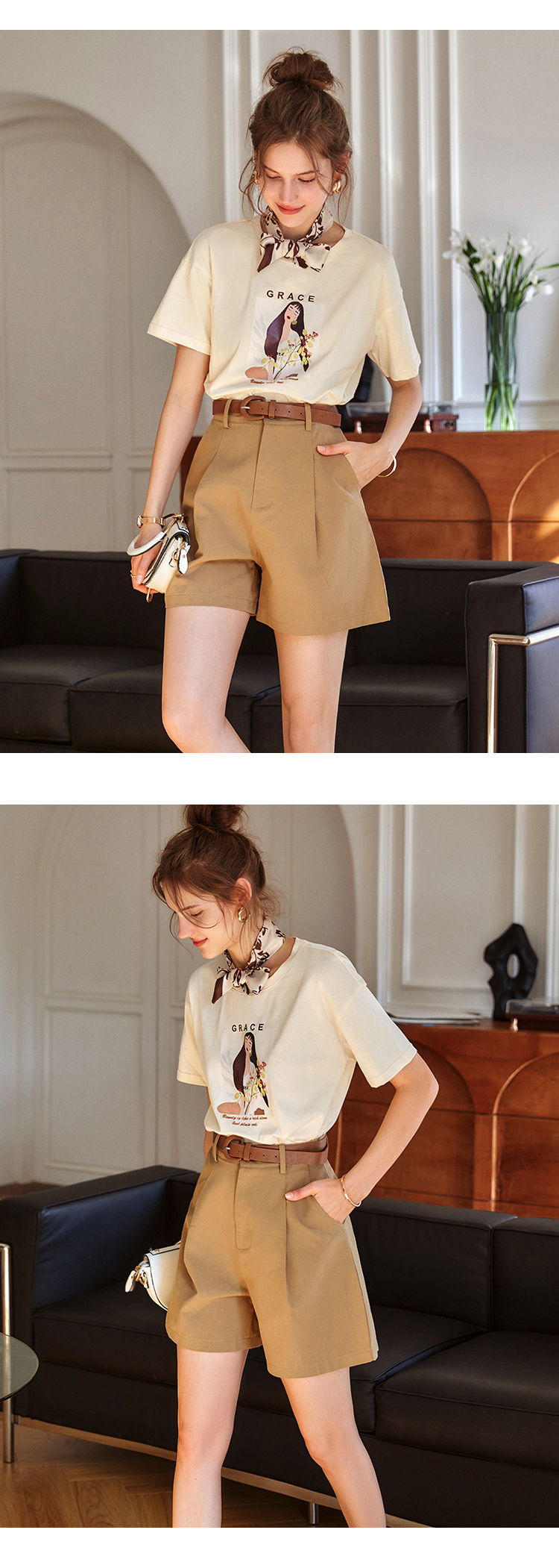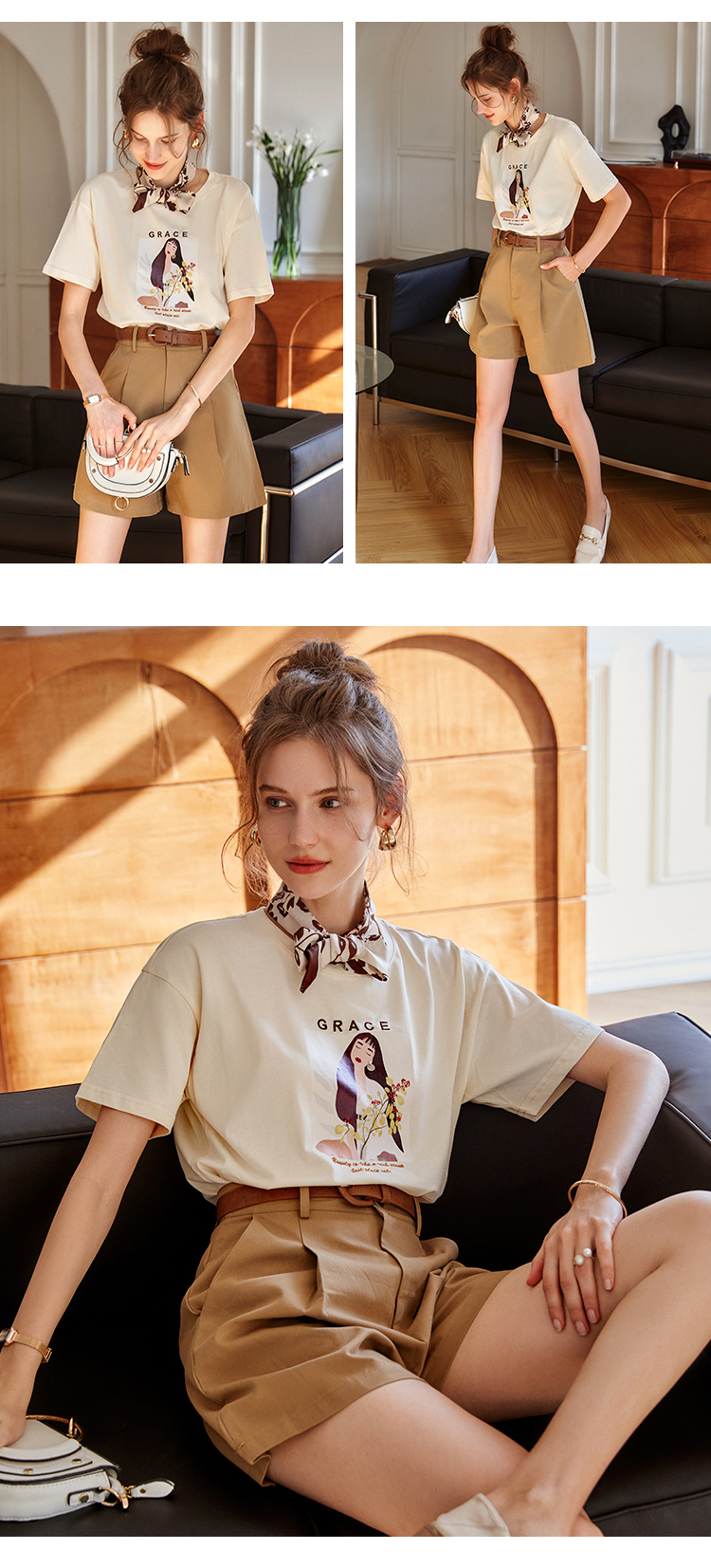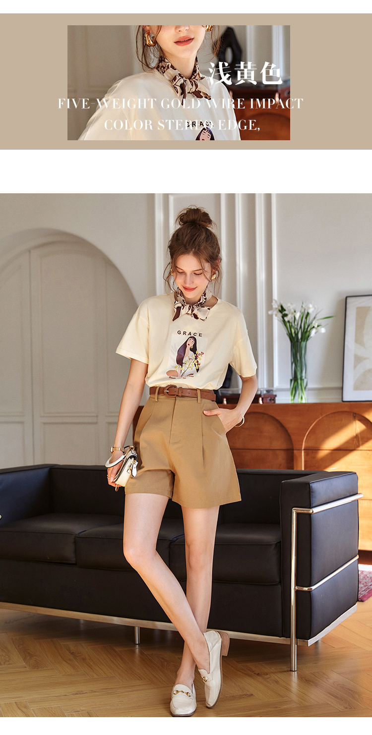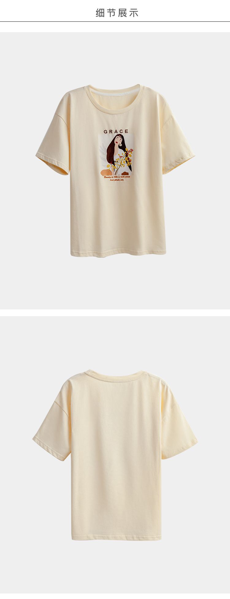 OLrain欧芮儿法式米白色短袖T恤女春季2023新款宽松印花休闲上衣