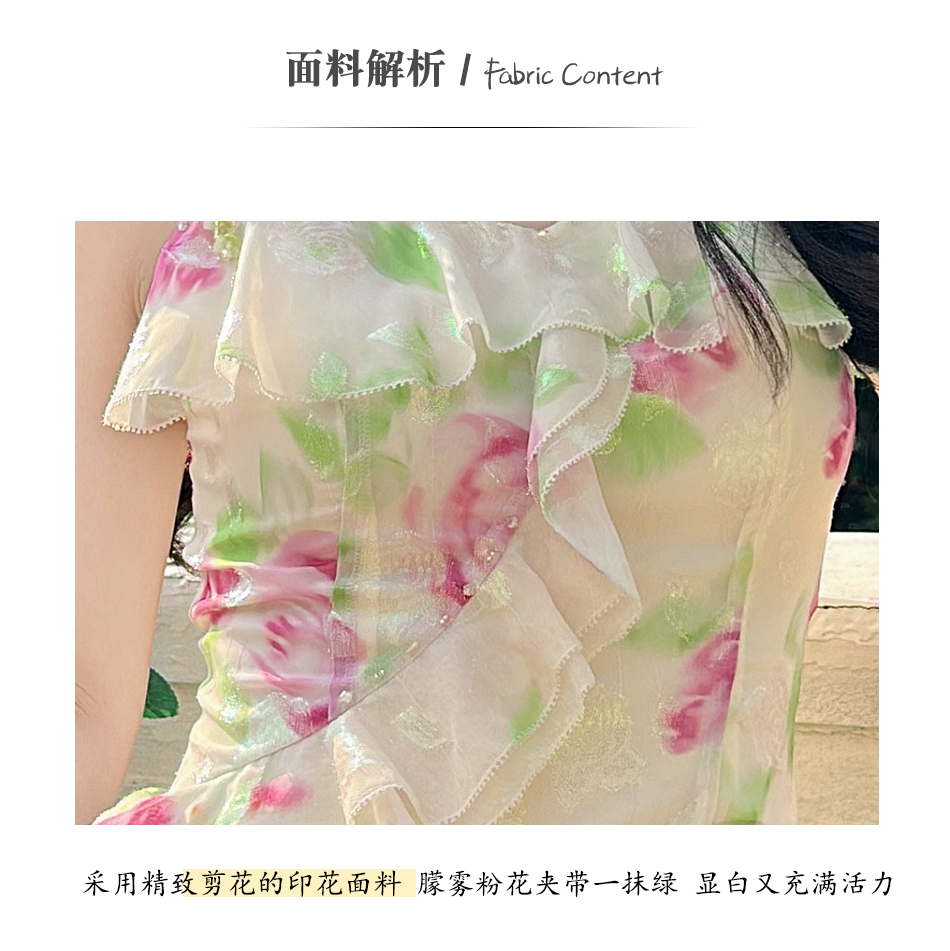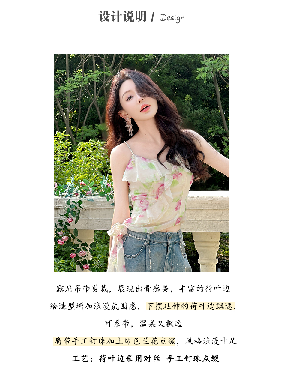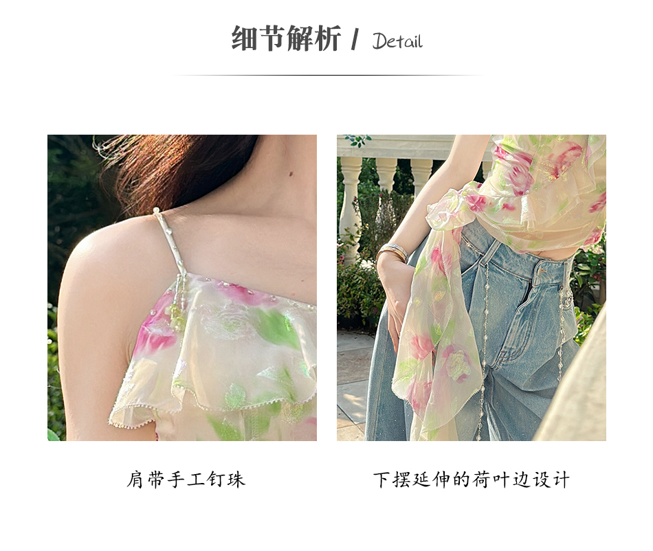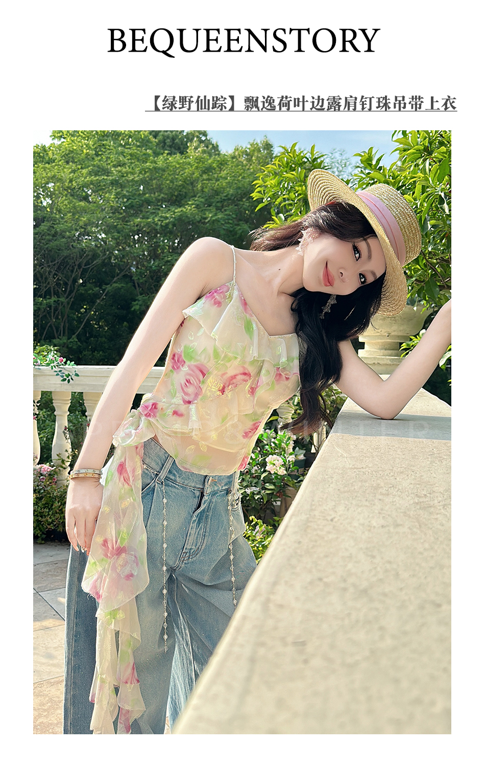 BeQueenStory【绿野仙踪】浪漫印花飘逸荷叶边性感露肩钉珠吊带上衣