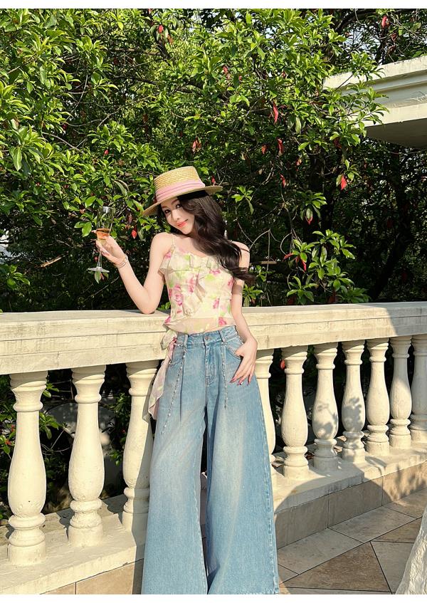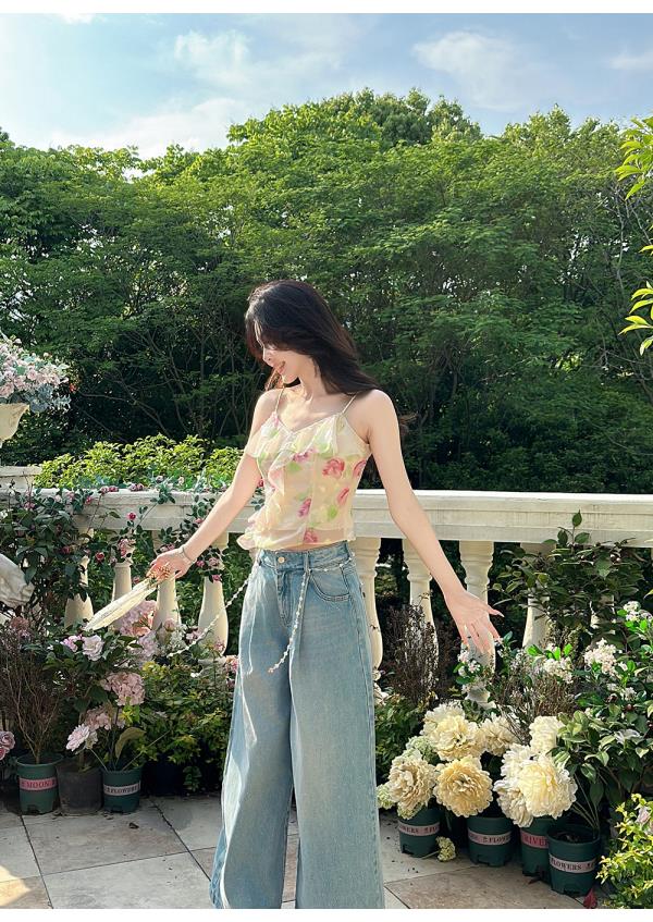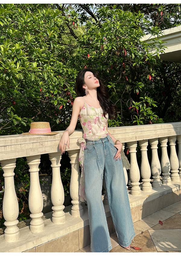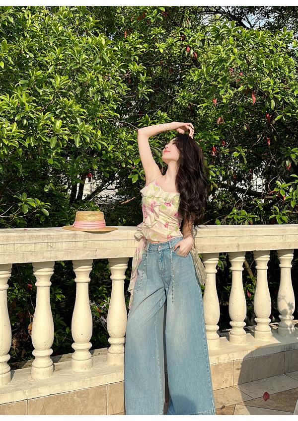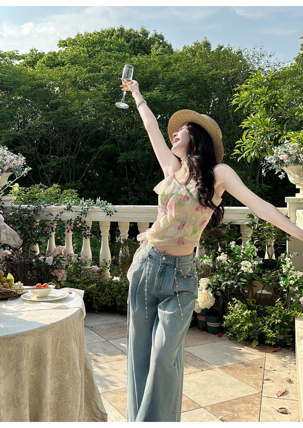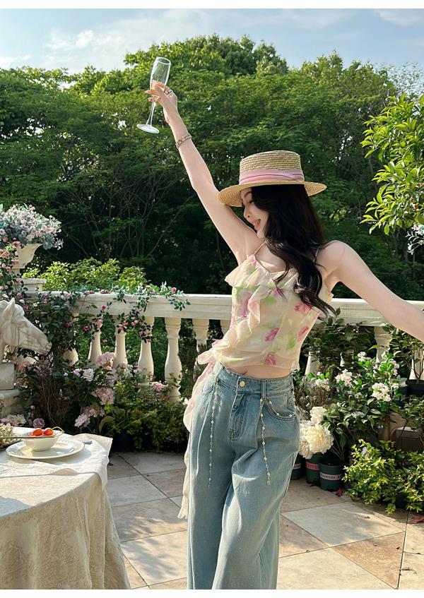 BeQueenStory【绿野仙踪】浪漫印花飘逸荷叶边性感露肩钉珠吊带上衣