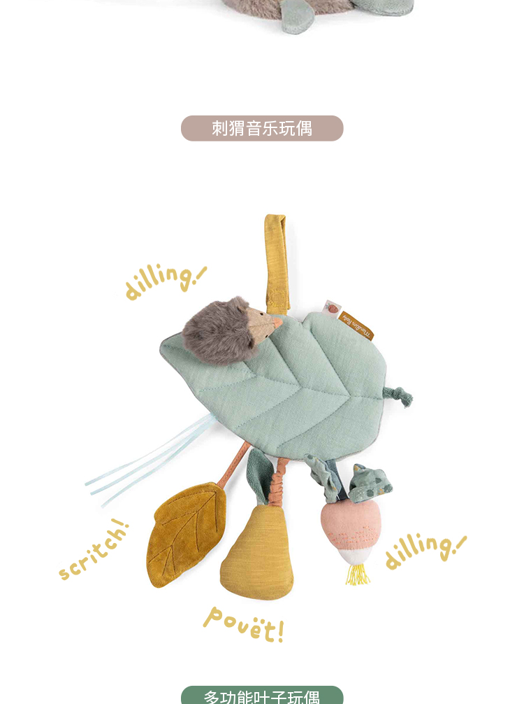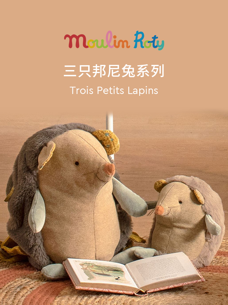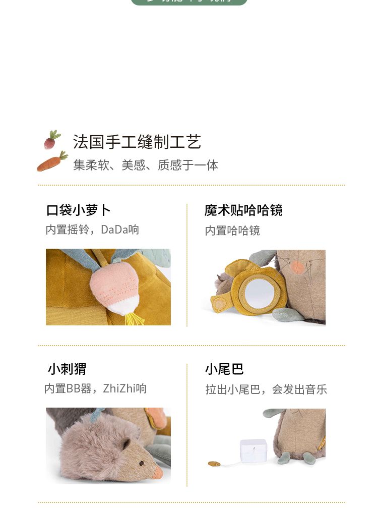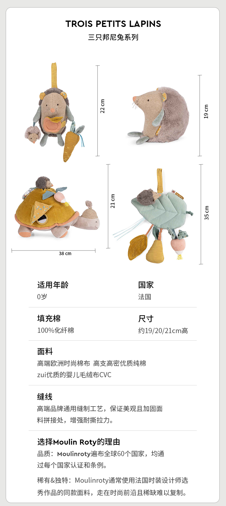 Moulin Roty 刺猬玩偶 多功能/启蒙玩偶 适用年龄0岁以上 内置摇铃 哈哈镜 三只邦尼兔系列 法国品牌-678075