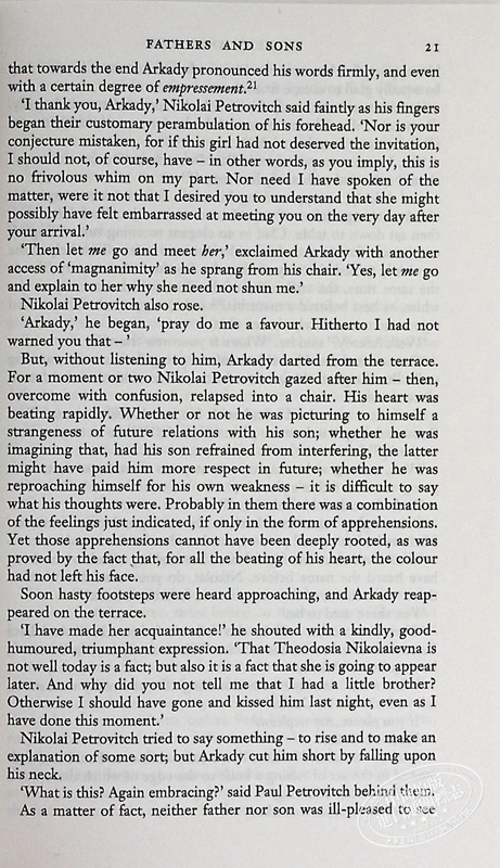 本书是19世纪俄罗斯伟大的小说之一,长期以来被誉为屠格涅夫的经典作品。这是一部以俄罗斯国内背景为背景的政治小说,具有一个普遍的主题,即父亲和儿子之间的代沟。小说的背景设定在1859年,当时的俄罗斯政府开始对社会和政治改革犹豫不决,小说探讨了俄罗斯改革派的自由派父亲和他们思想自由的知识分子儿子之间的冲突,后者的革命意识形态威胁到了国家的稳定。其核心人物是叶夫根尼•巴佐洛夫(Evgeny Bazorov),他是各种社会正统观念的坚定反对者,宣称自己是虚无主义者,并相信有必要推翻政府的所有机构。随着小说的发展,巴扎罗夫的政治野心与情感和私人关切发生了致命的冲突,他的结局是悲剧性的失败。这部小说在1862年出版时引起了强烈的反响,一年后,这也把屠格涅夫赶出了俄国。