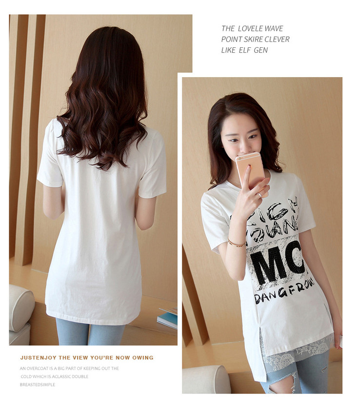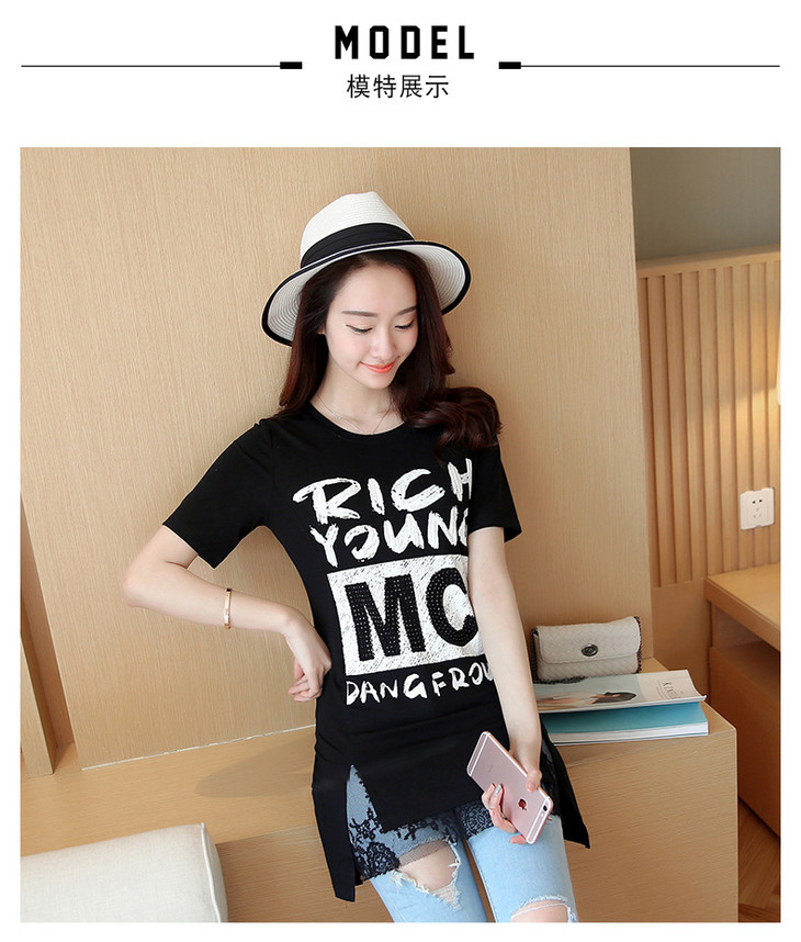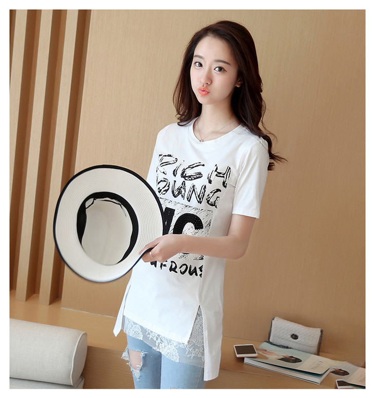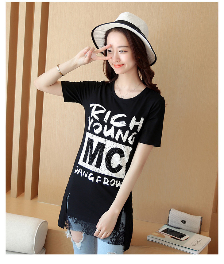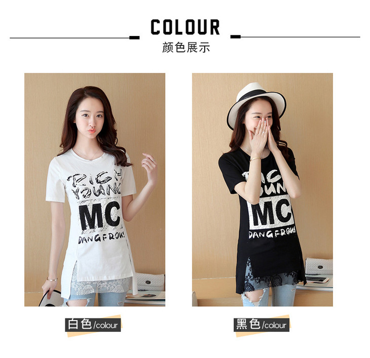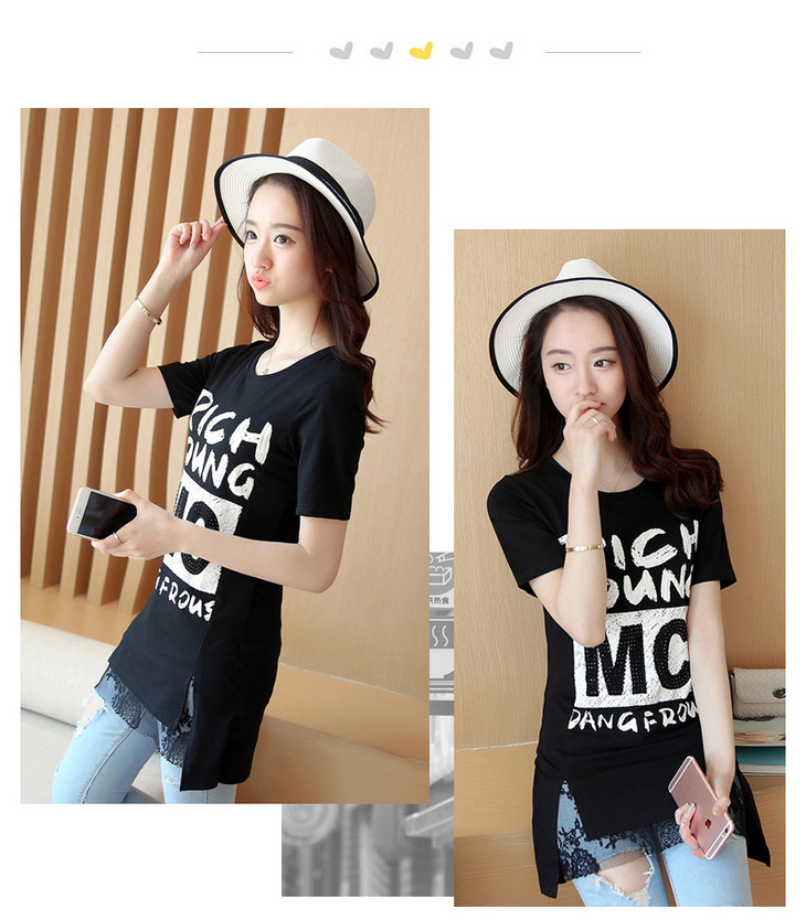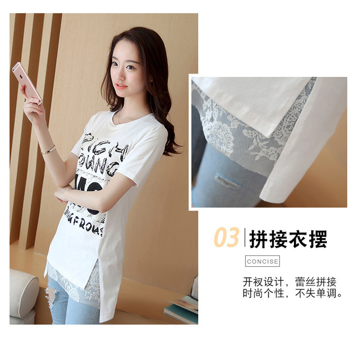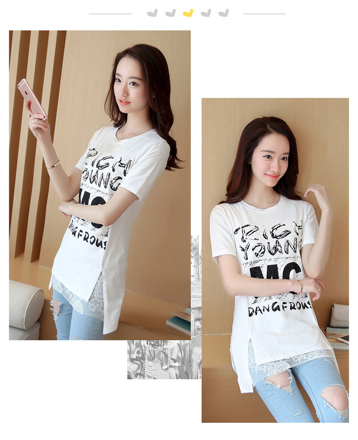 时尚蕾丝花边印花短袖中长款修身显瘦T恤衫ZMLM1628