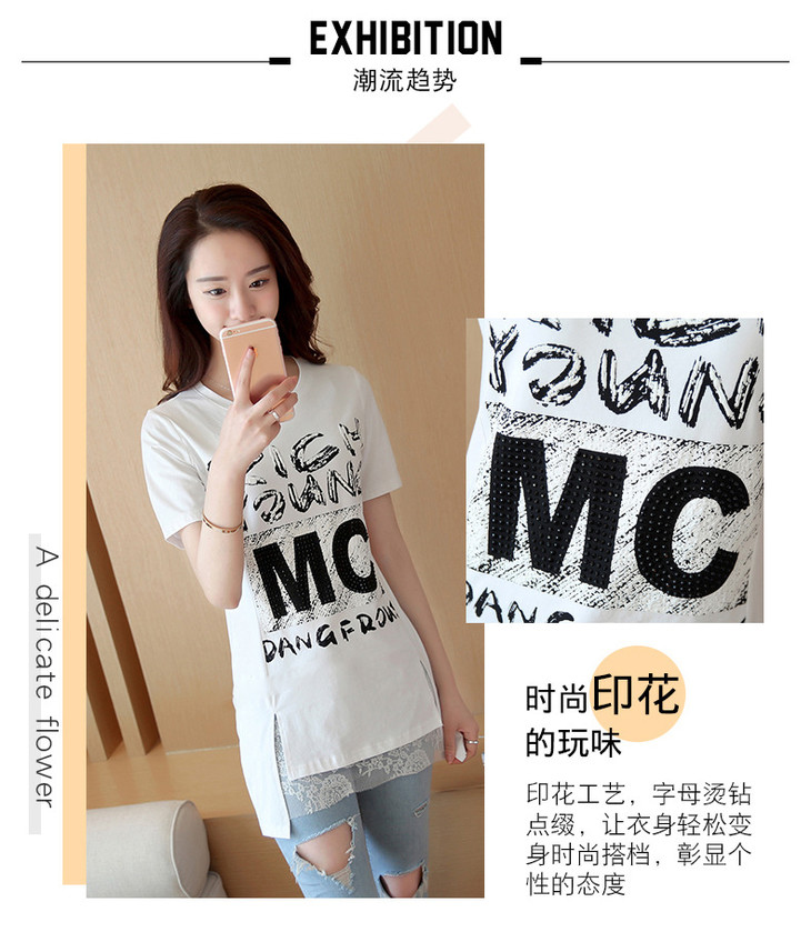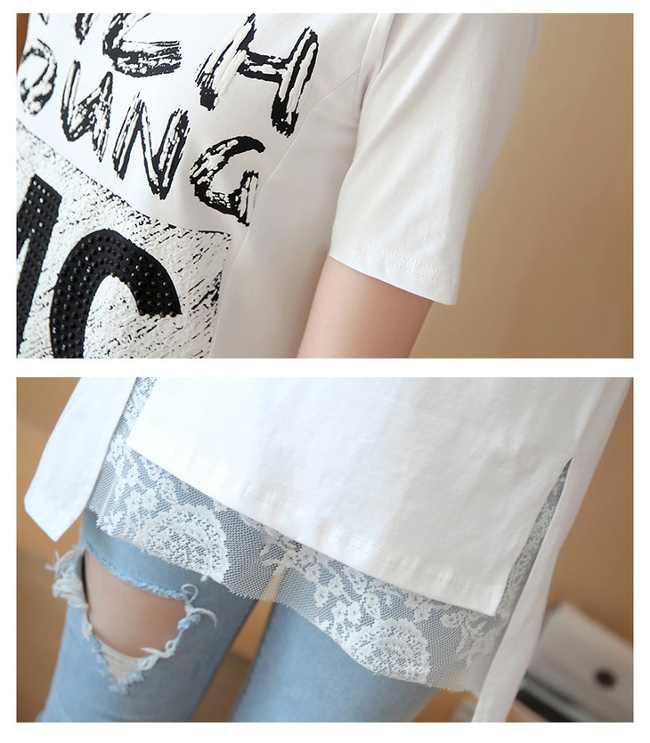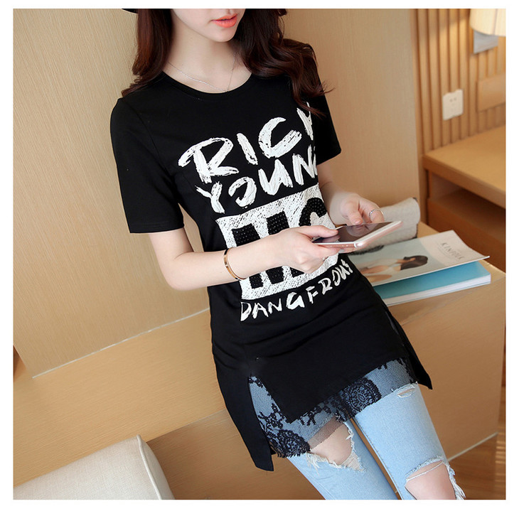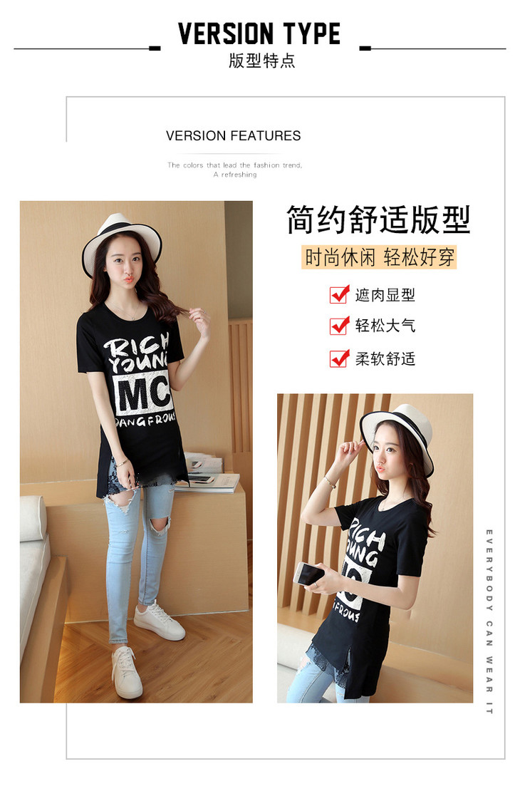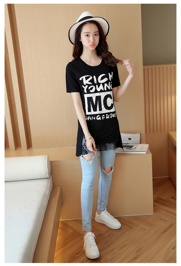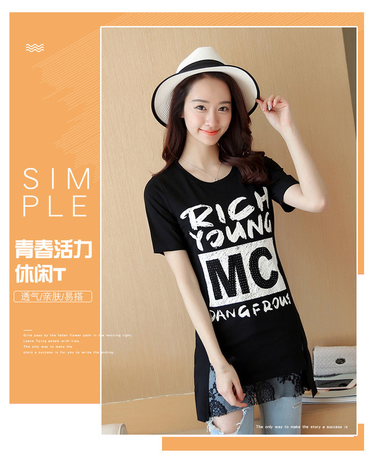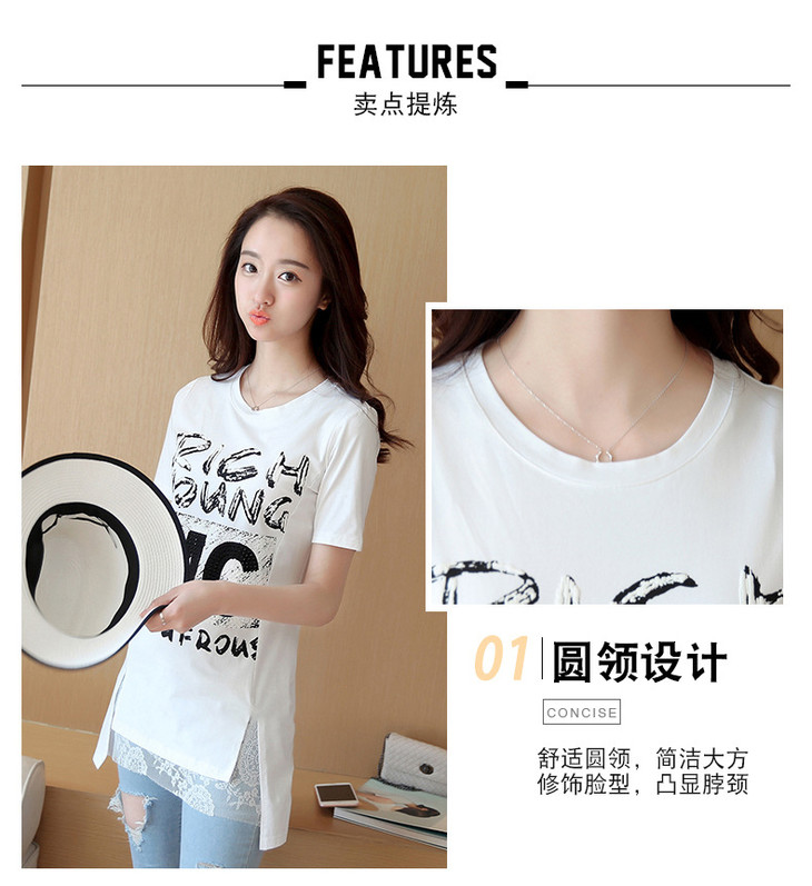 时尚蕾丝花边印花短袖中长款修身显瘦T恤衫ZMLM1628