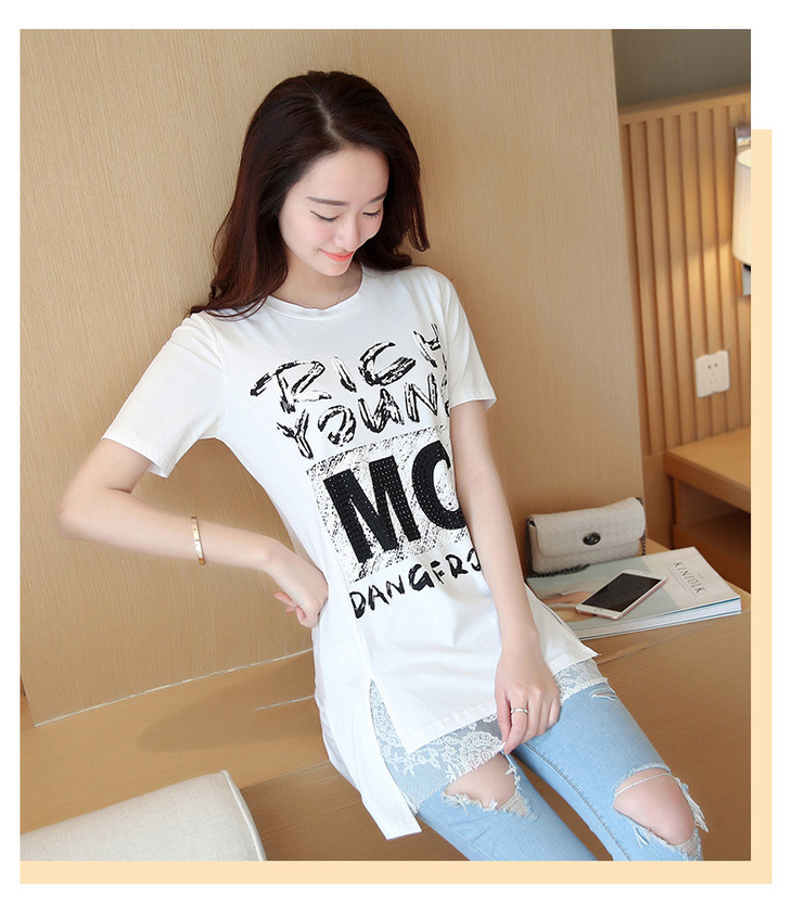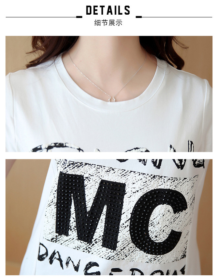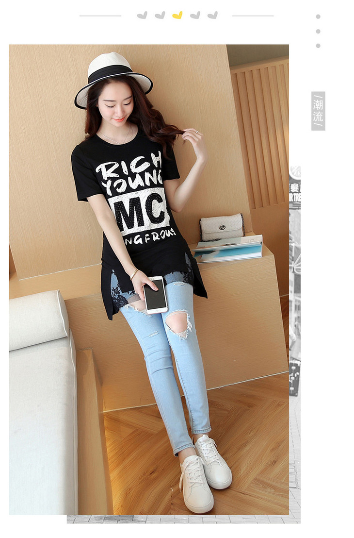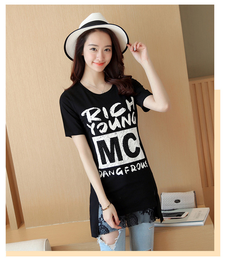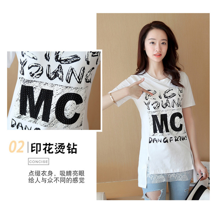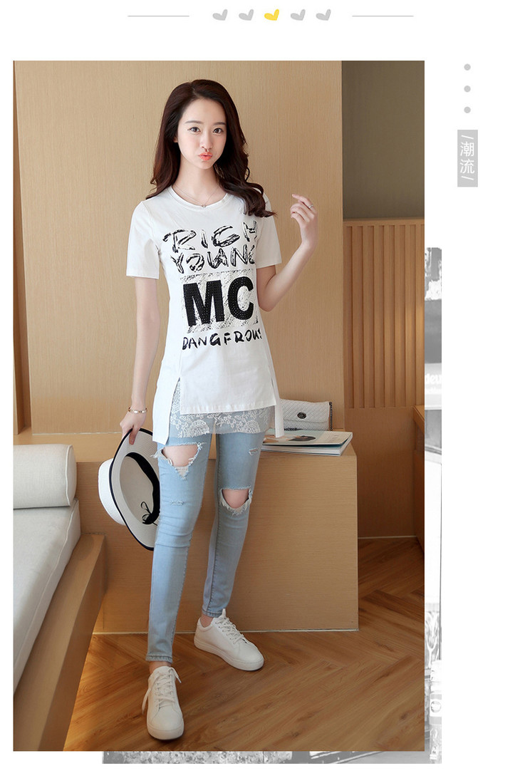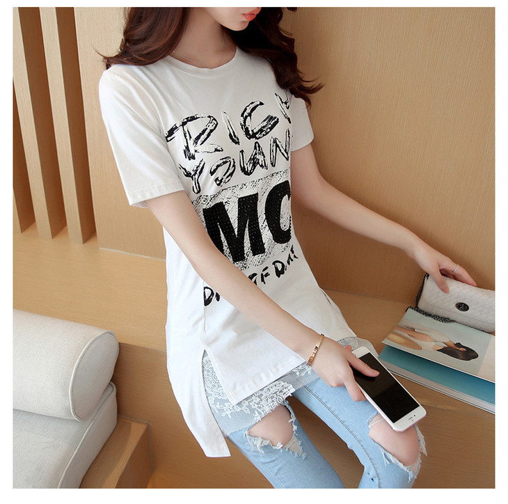 时尚蕾丝花边印花短袖中长款修身显瘦T恤衫ZMLM1628