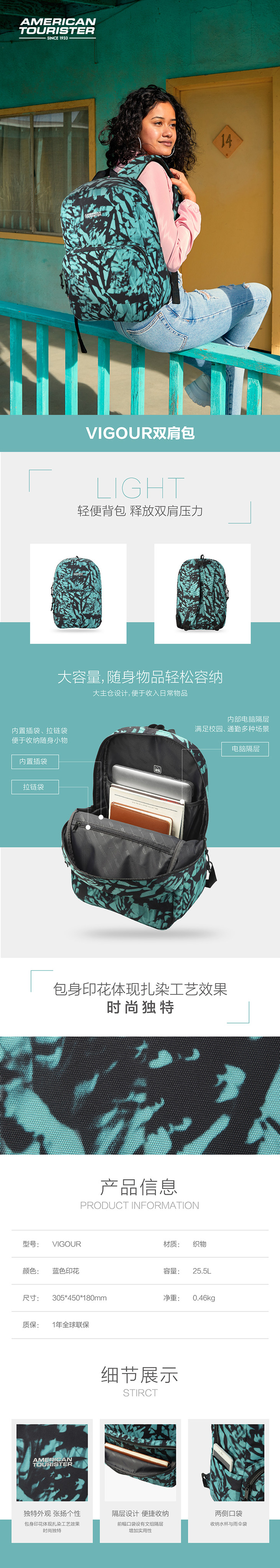 【美旅】双肩包 书包 轻便耐磨 大容量 水杯雨伞 时尚印花 舒适背负 多隔层口袋 TJ8