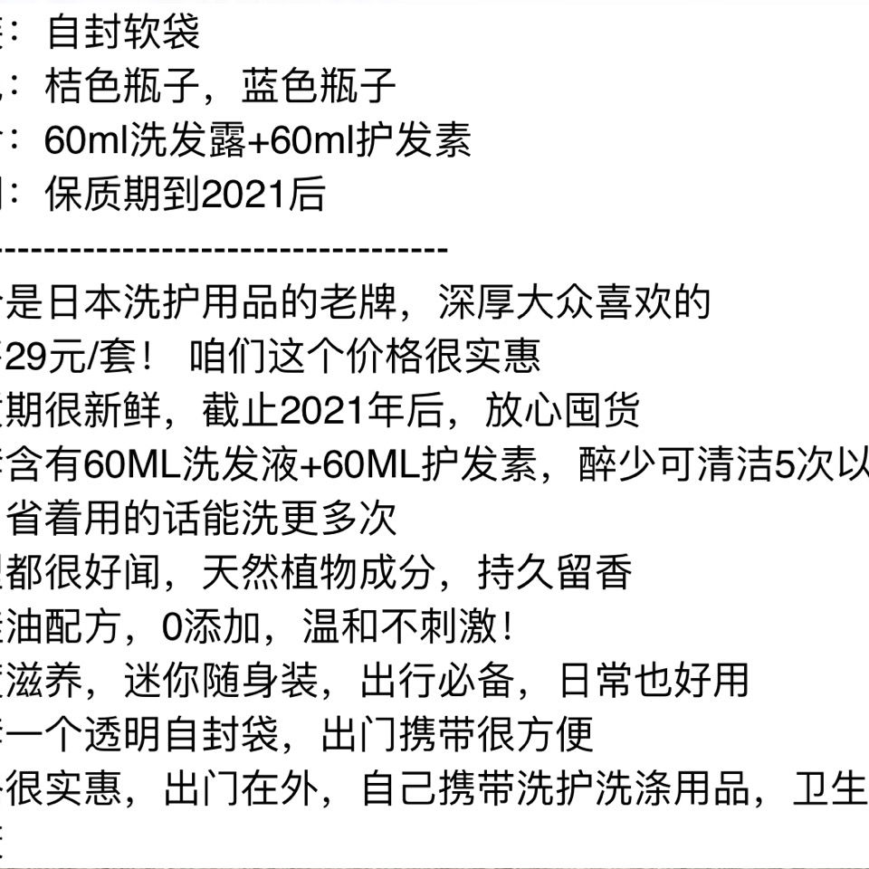 【爆款超低价预售 急单慎拍】日本原装进口便携护发无硅油洗护旅行套装洗发水护发素60ml*2