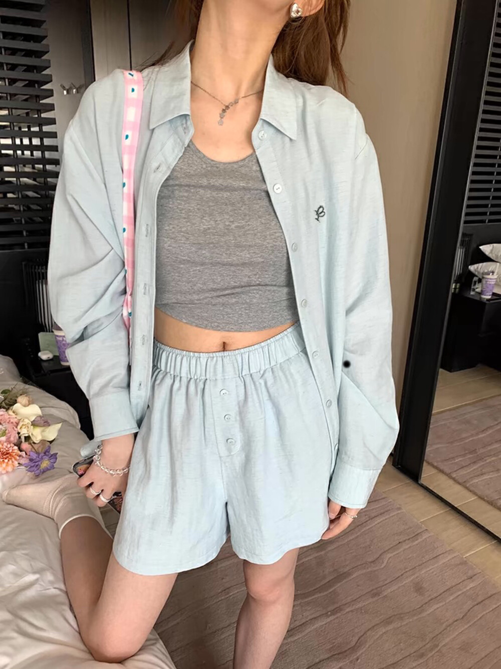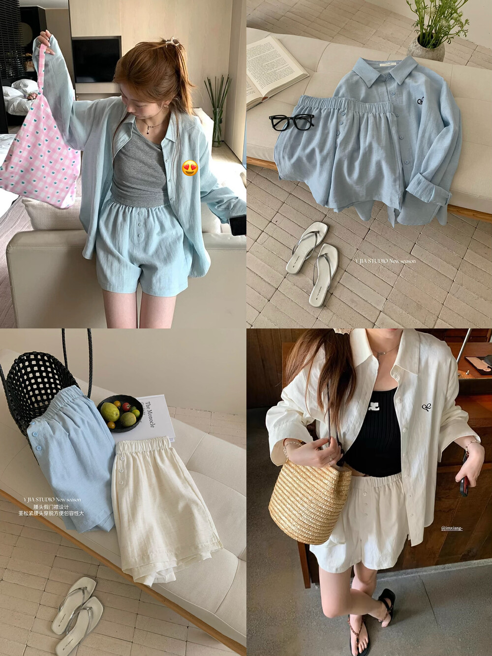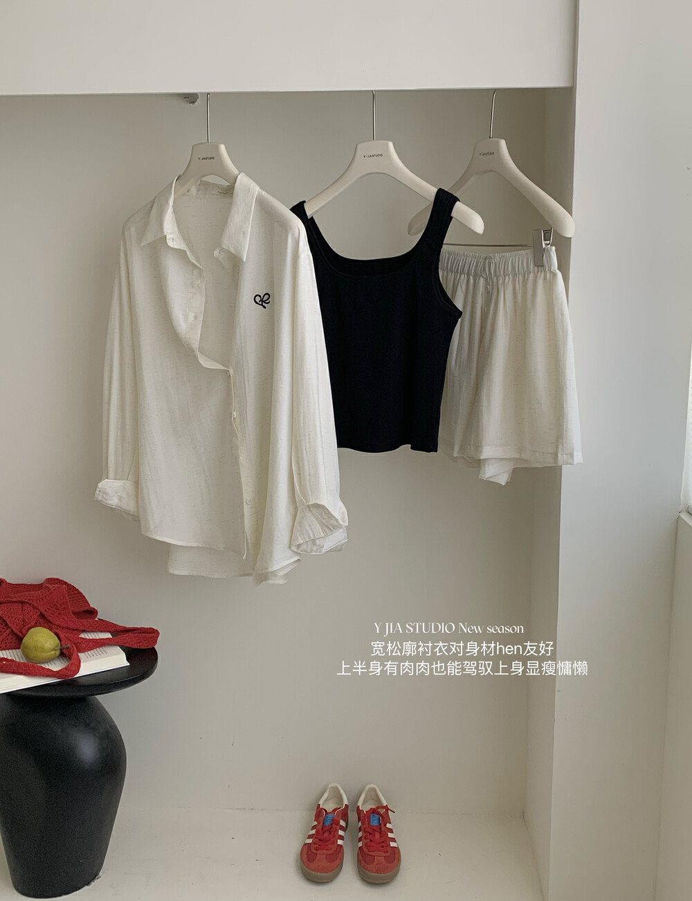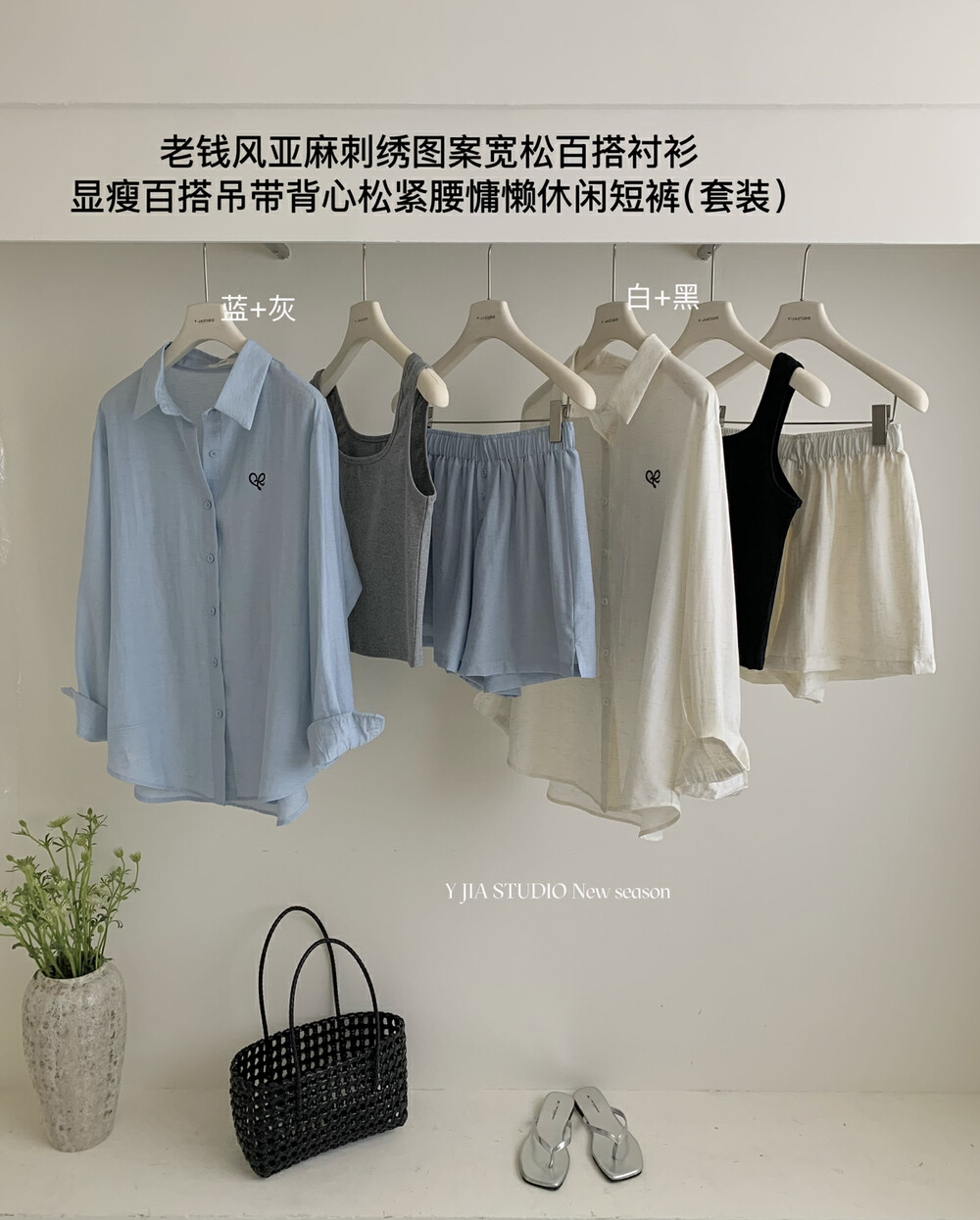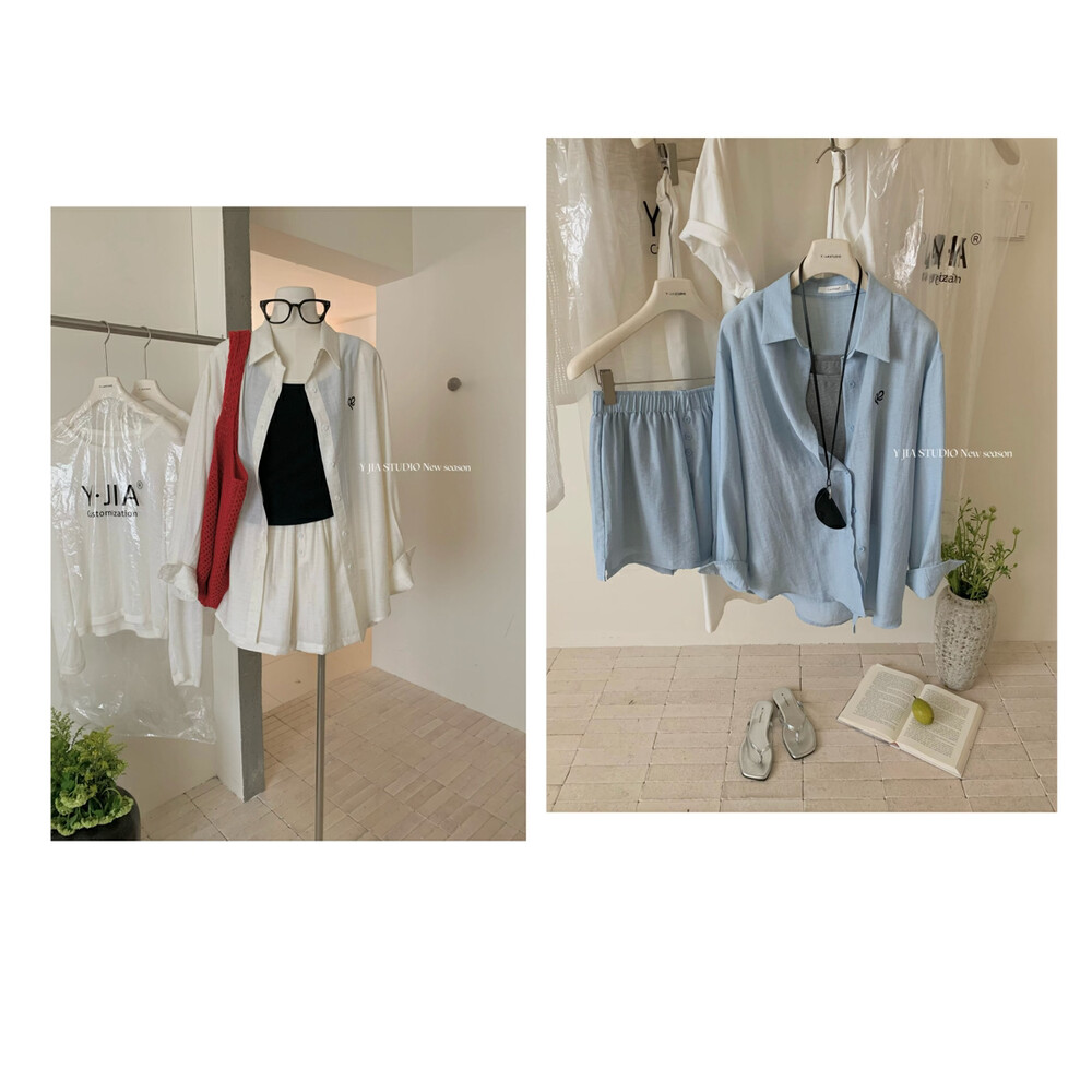 【GZ】无忧购老钱风亚麻刺绣图案宽松百搭衬衫+显瘦背心+松紧腰慵懒休闲短裤套装 7888-5#(截单后7天发货)