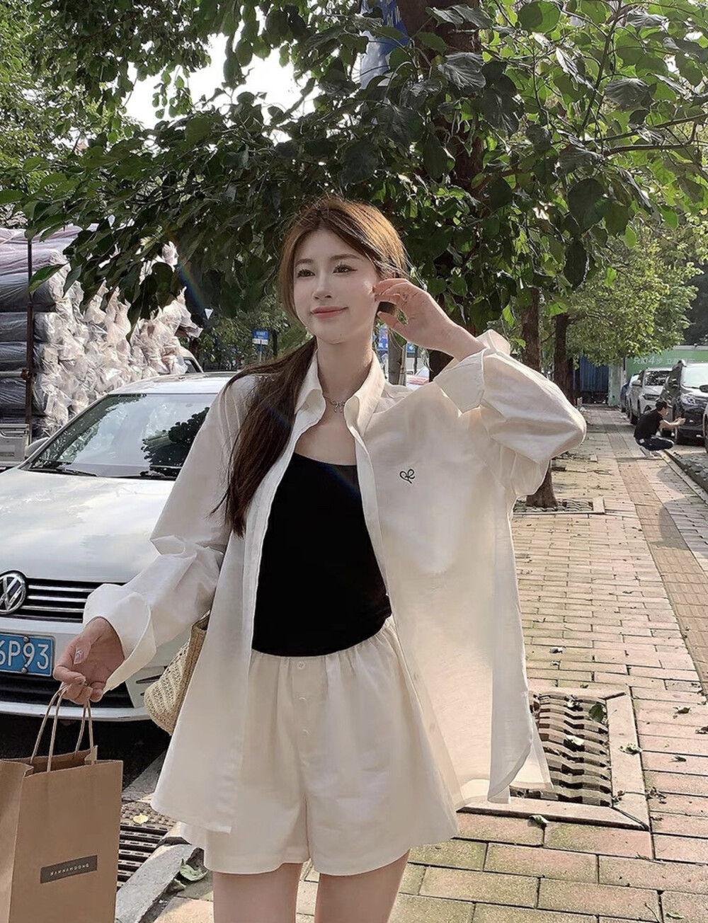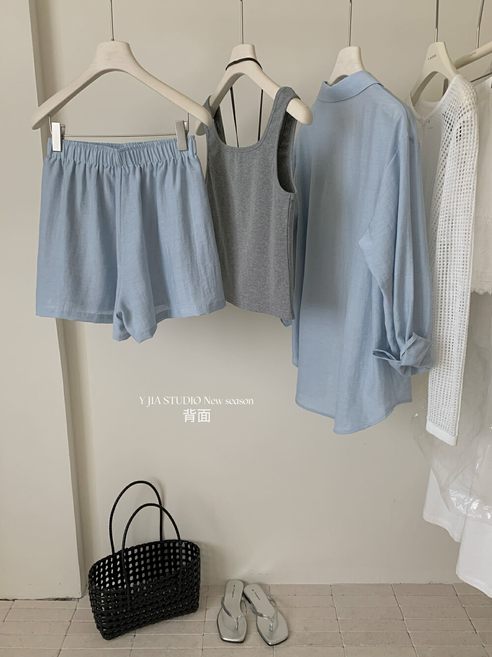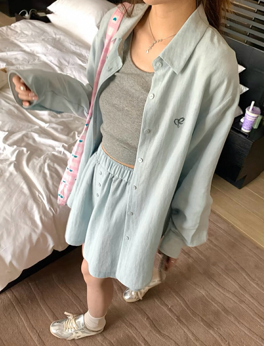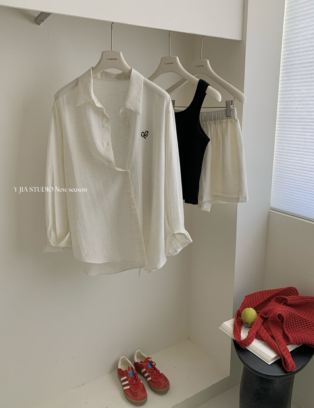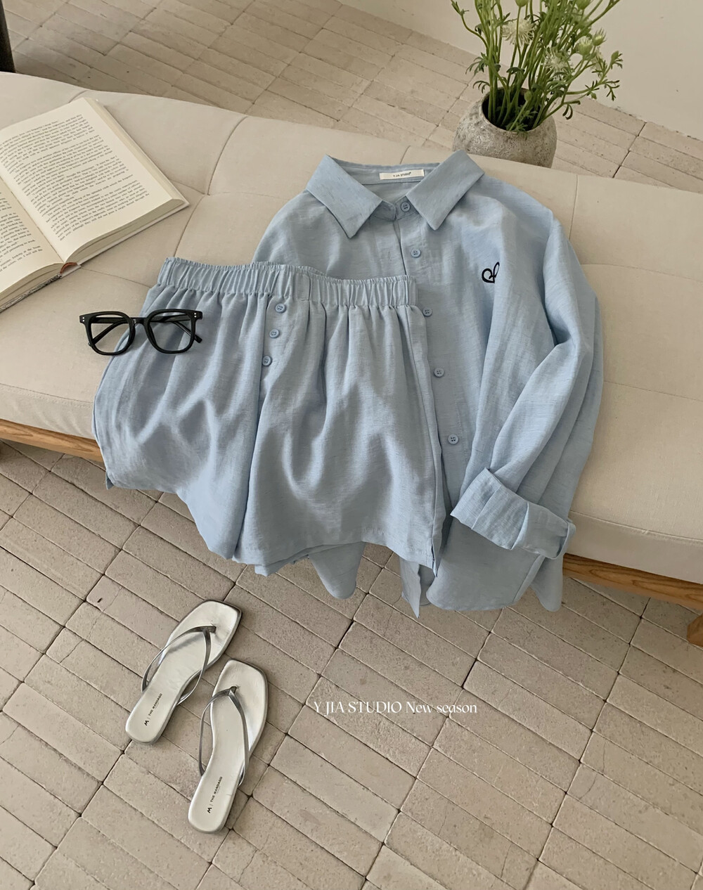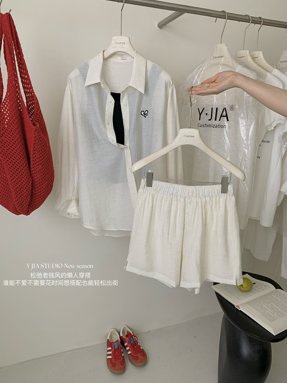 【GZ】无忧购老钱风亚麻刺绣图案宽松百搭衬衫+显瘦背心+松紧腰慵懒休闲短裤套装 7888-5#(截单后7天发货)