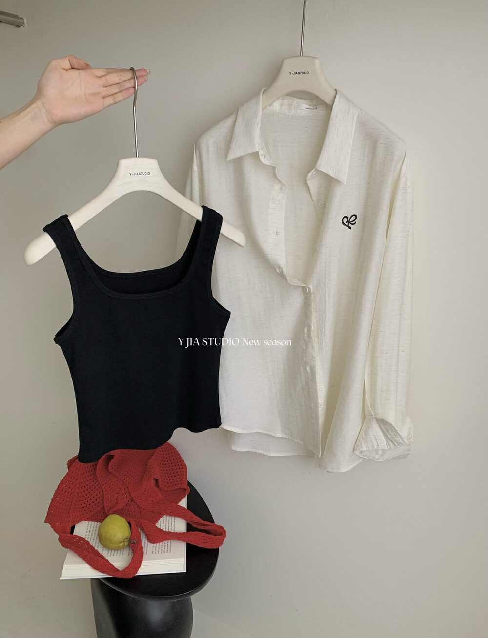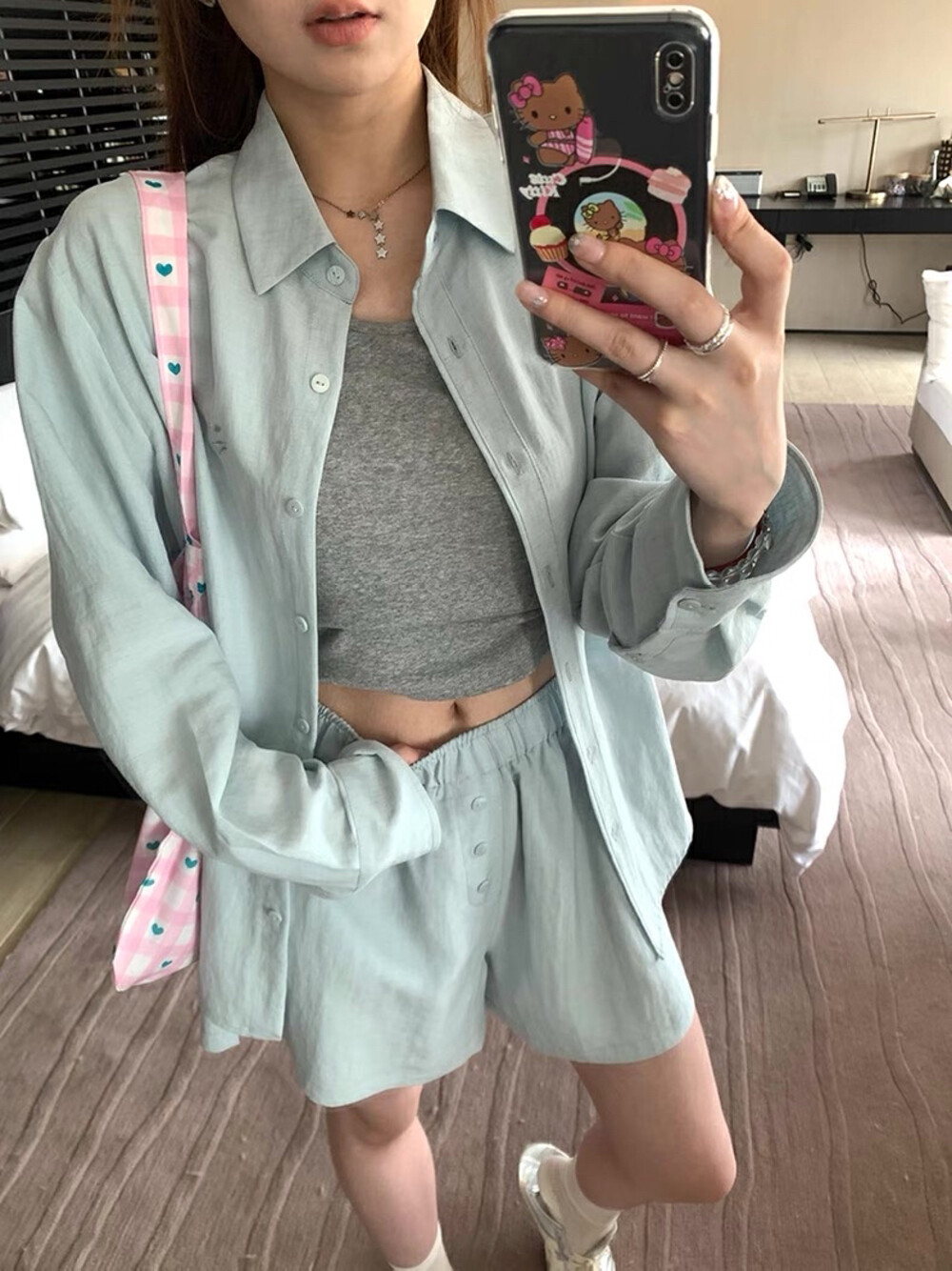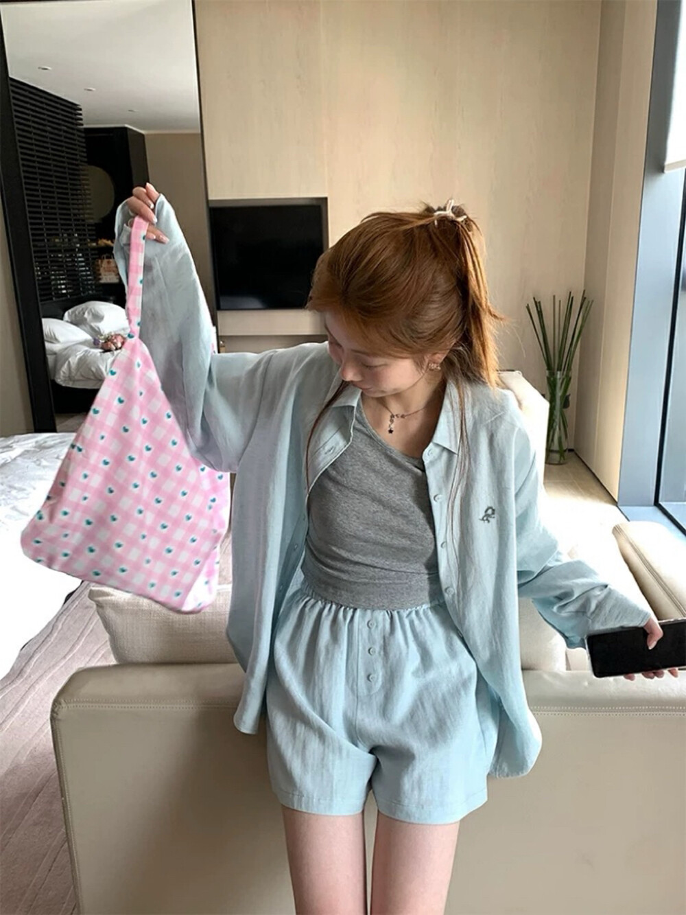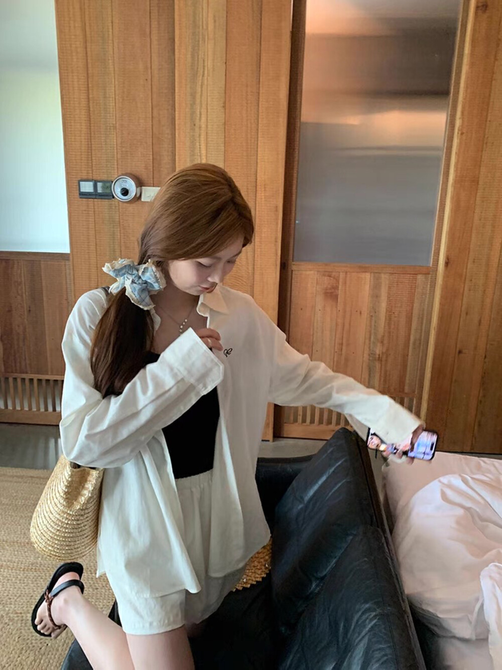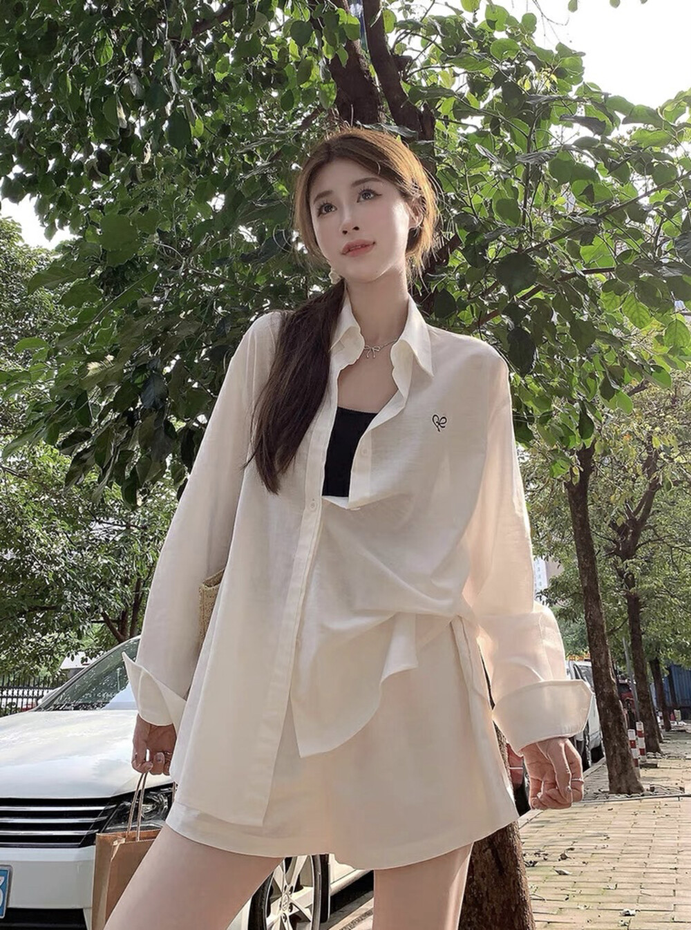 【GZ】无忧购老钱风亚麻刺绣图案宽松百搭衬衫+显瘦背心+松紧腰慵懒休闲短裤套装 7888-5#(截单后7天发货)