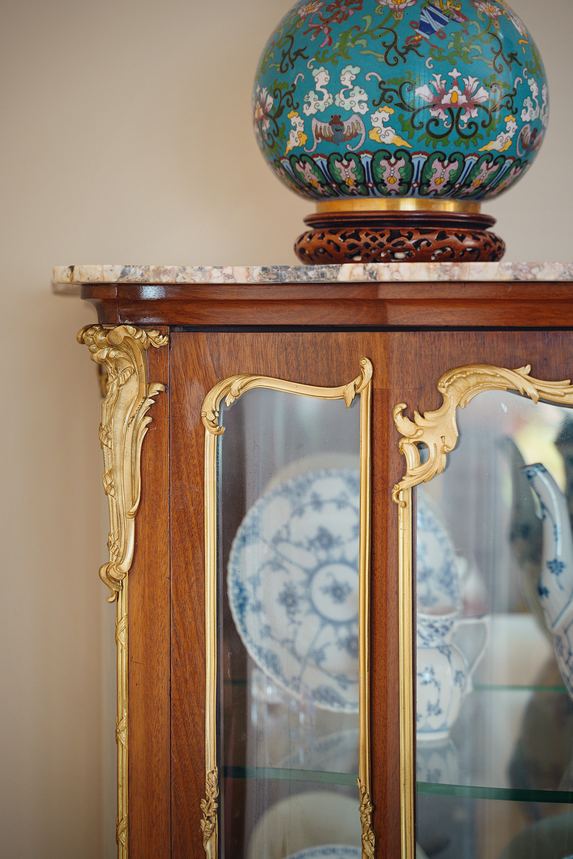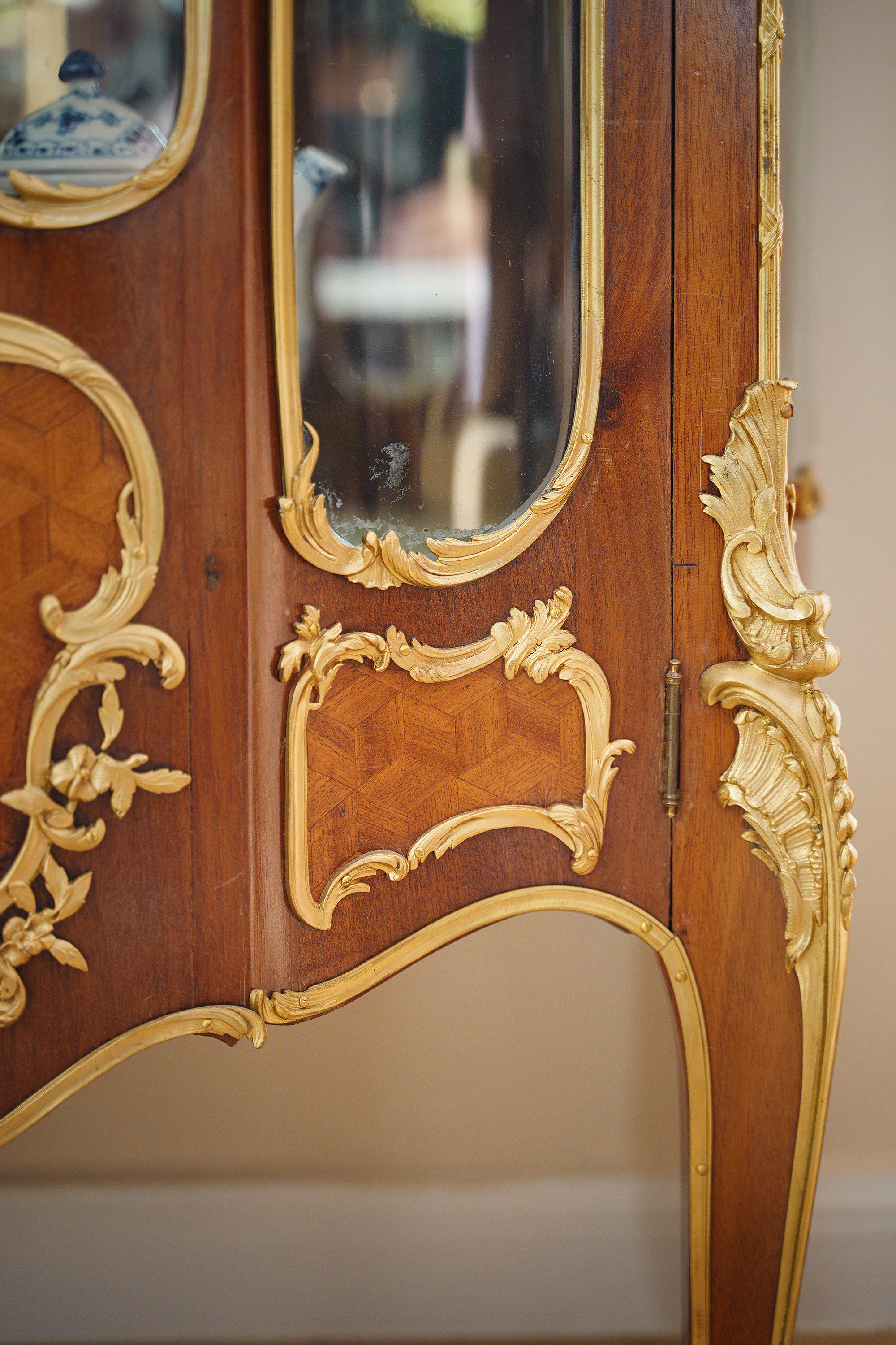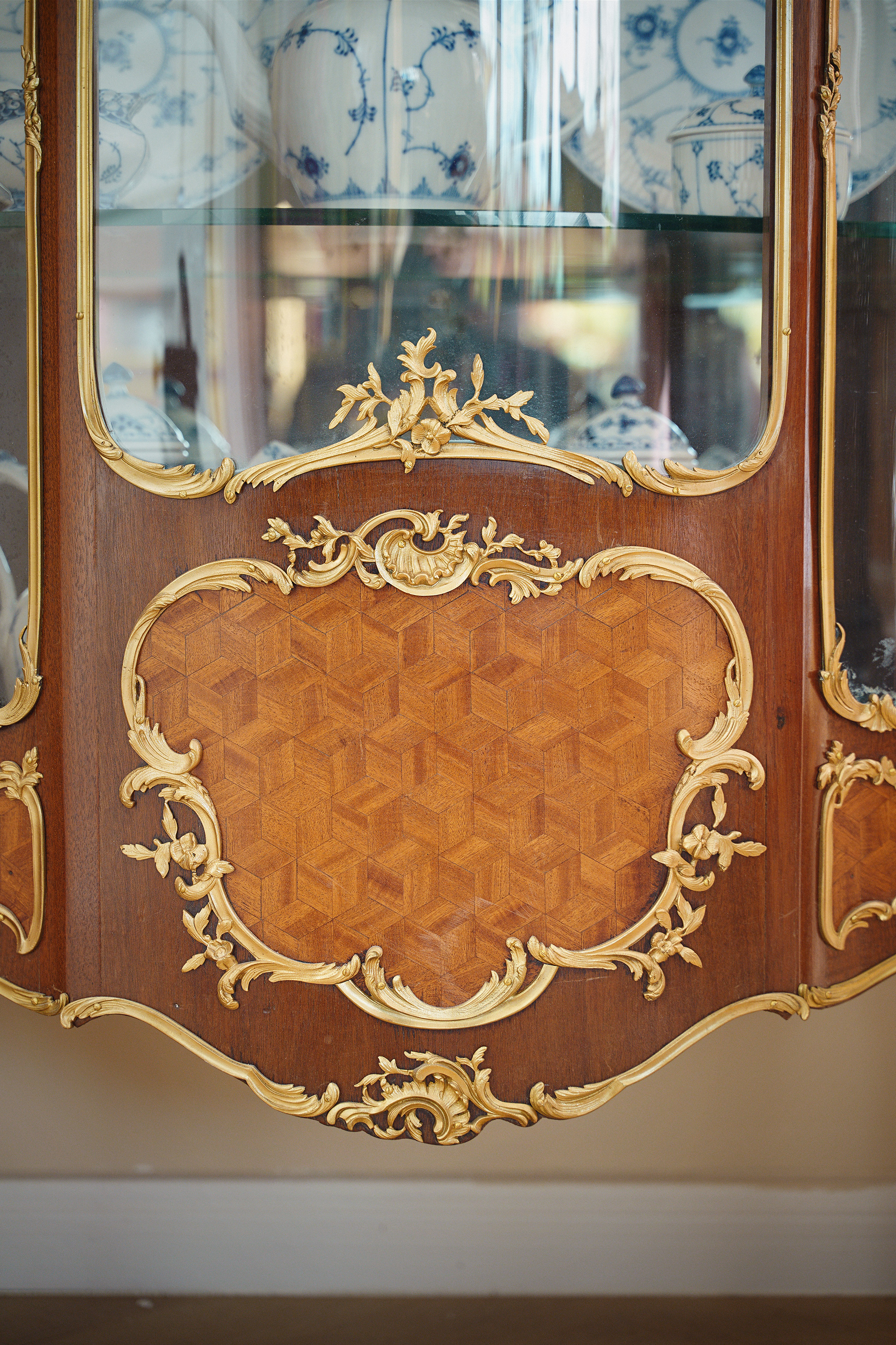 独角鹿西洋古董1880年代法国出品路易十五风格古典卷叶主题铜鎏金精雕装饰檀木菱格拼花纹玻璃展柜
