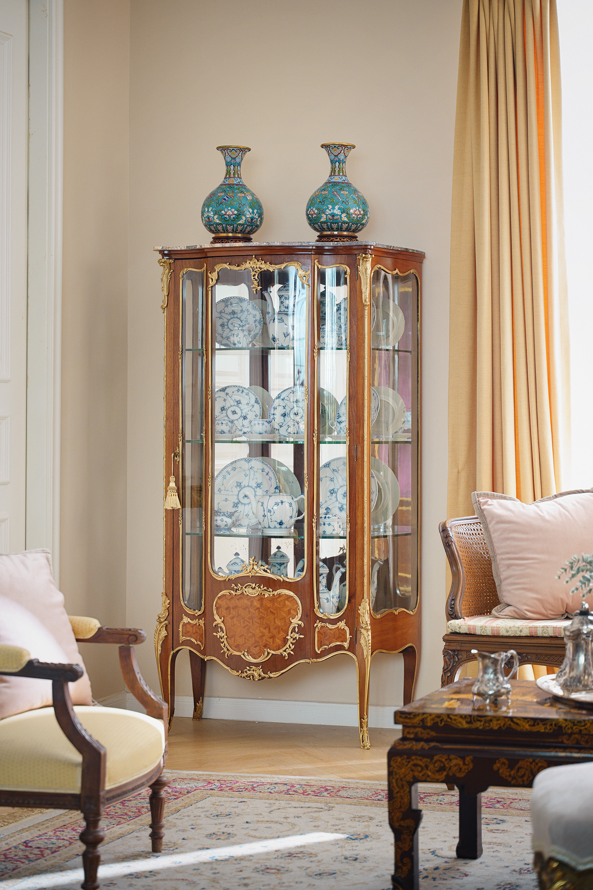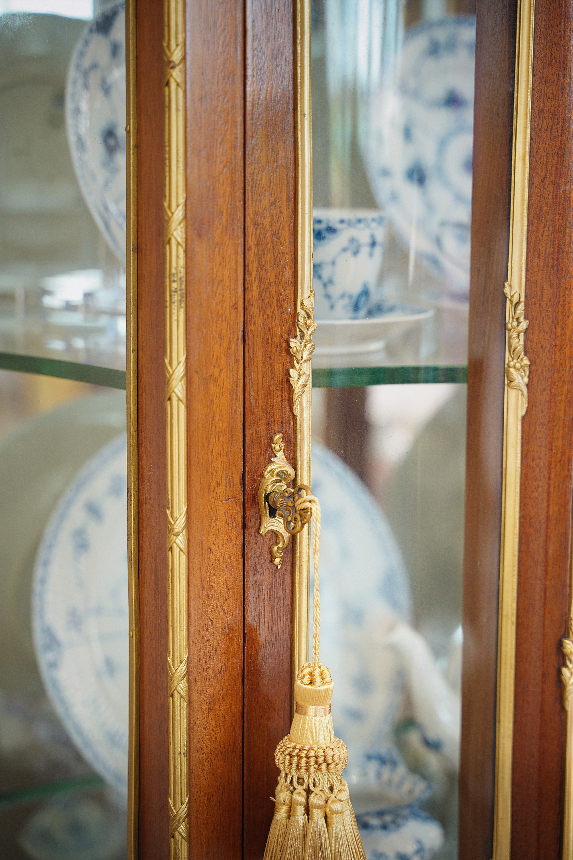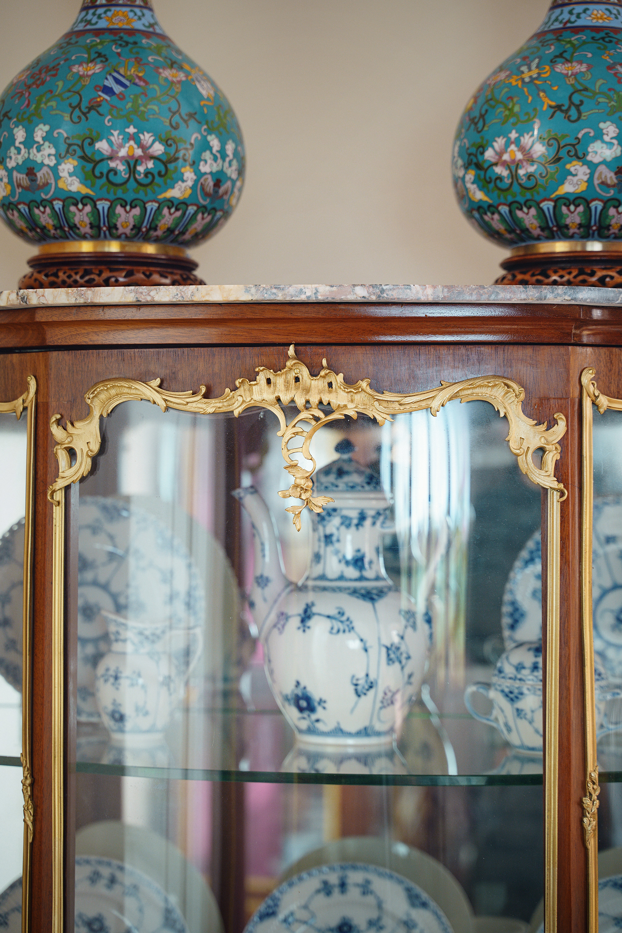 独角鹿西洋古董1880年代法国出品路易十五风格古典卷叶主题铜鎏金精雕装饰檀木菱格拼花纹玻璃展柜