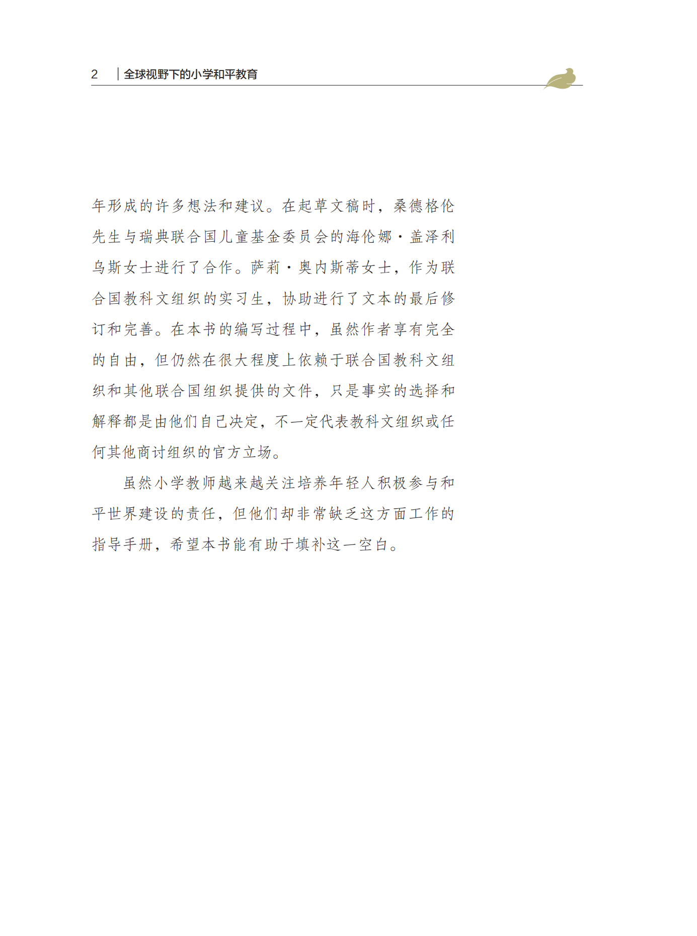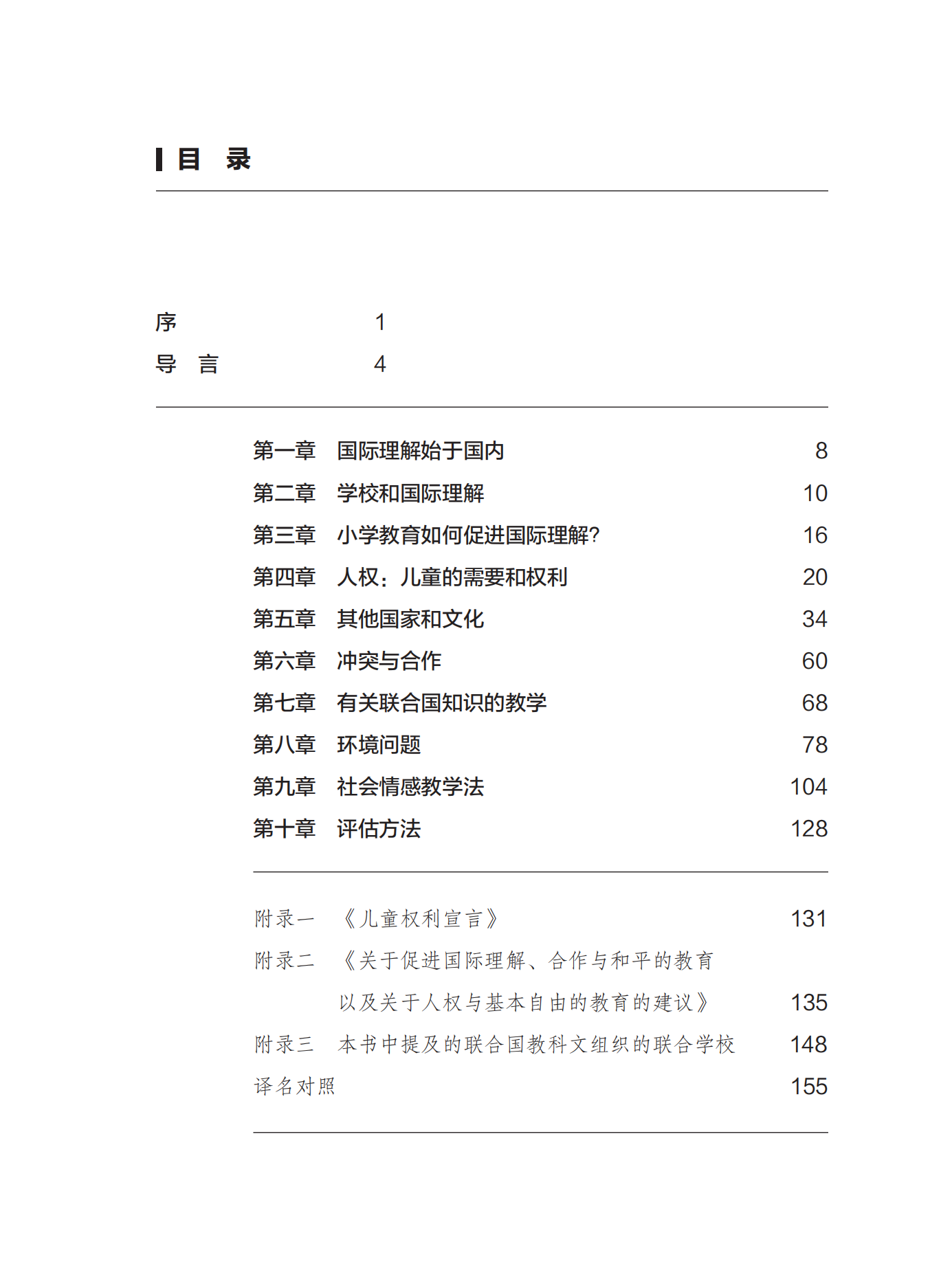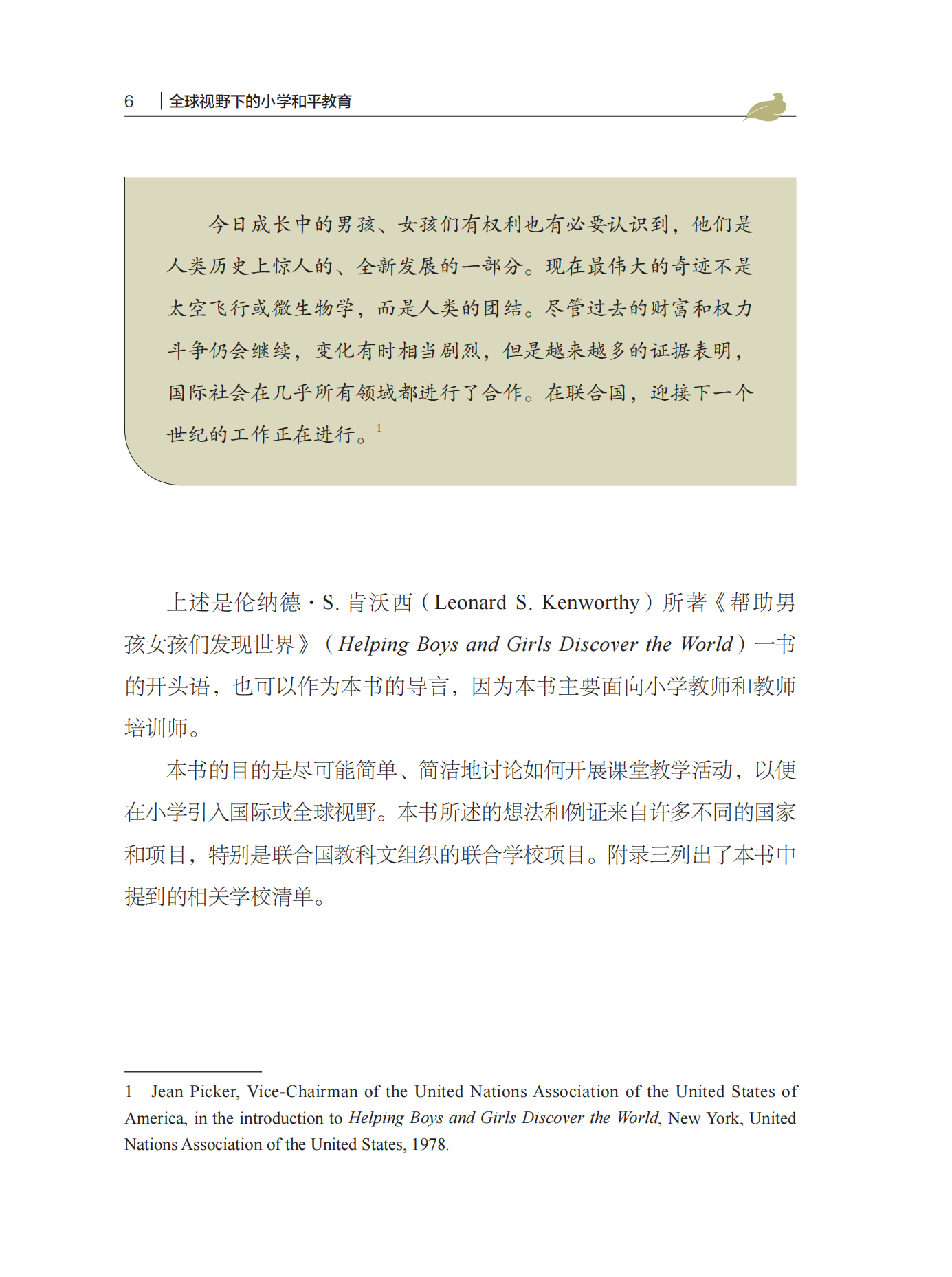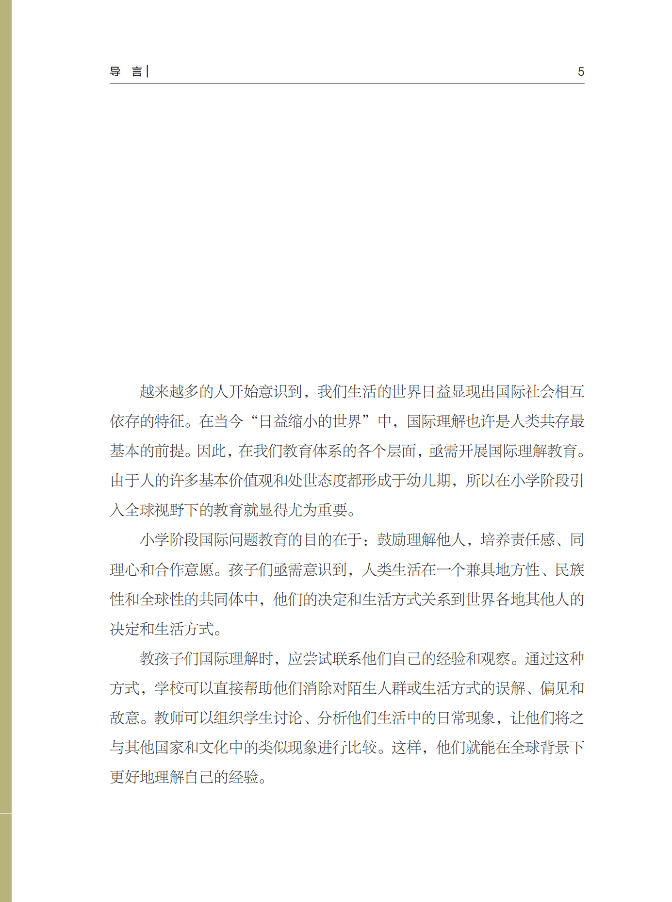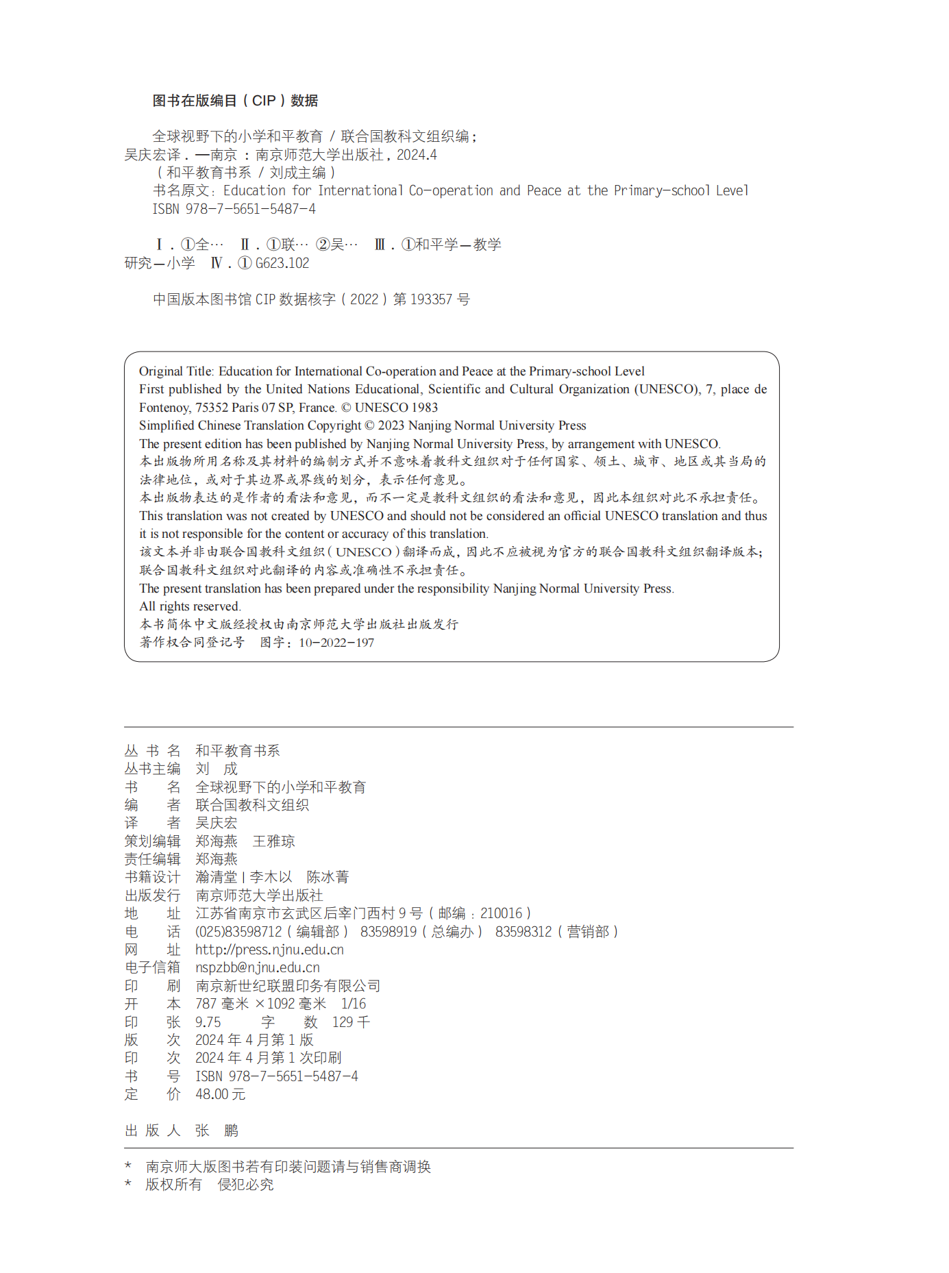 本书主张在小学课堂中引入全球视角进行和平教育与开展国际合作,由联合国儿童基金会和瑞典国际发展合作署工作人员联合编写,从多维度介绍了和平教育与国际合作的基本知识与实践技能,包括儿童的需求和权利,跨文化沟通,联合国及其专门机构和环境问题。书中参考了联合国教科文组织联系学校项目中的教学实践,介绍了如何通过和平教育与国际合作,促进小学生构建积极的全球认知以及与他人沟通和跨文化交往的能力,是小学开展和平教育与国际合作的实践指南。本书可与我社《小学和平教育》配合使用,是教师指导用书,可用于小学和平教育课程实践,案例丰富,内容多元。
