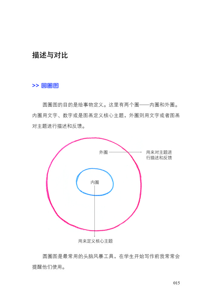 圆圈图的目的是给事物定义。这里有两个圈——内圈和外圈。内圈用文字、数字或是图画定义核心主题,外圈则用文字或者图画对主题进行描述和反馈。
