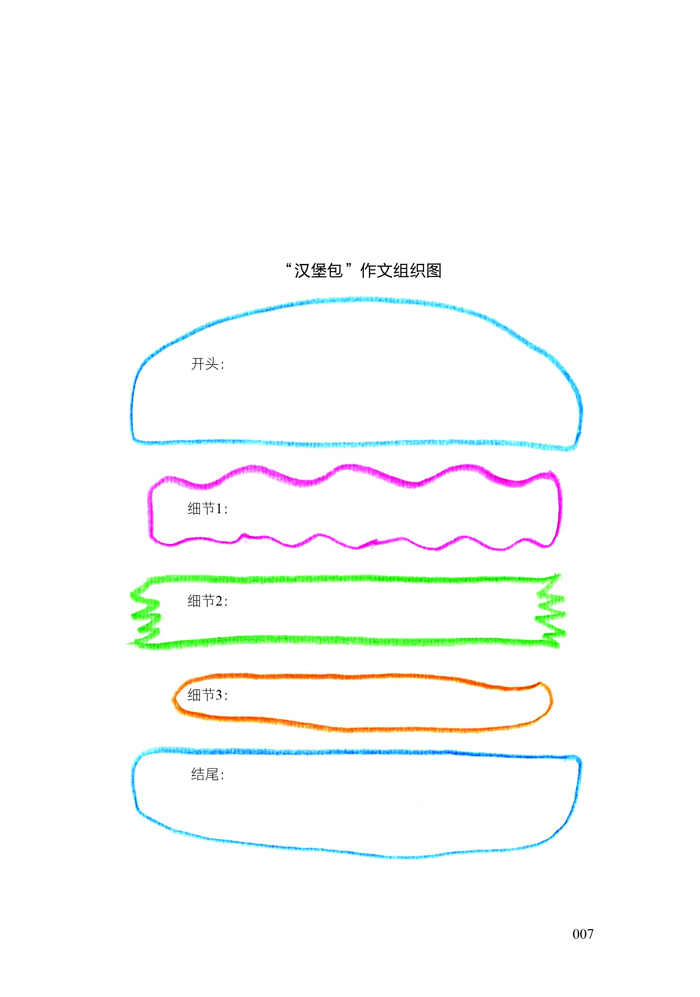 如果给孩子一个汉堡包图(包含有两块面包片、一块肉、一片绿叶、一片西红柿),孩子就会在“面包片”“肉”“绿叶”和“西红柿”中填入答案(见下面的“汉堡包”作文组织图)。