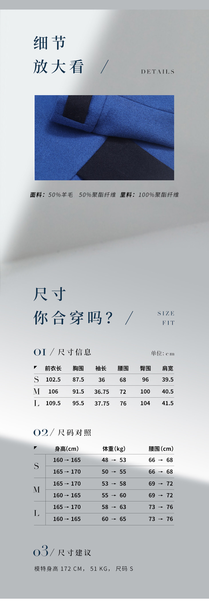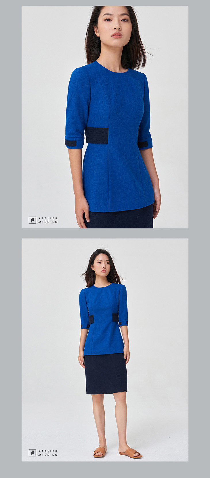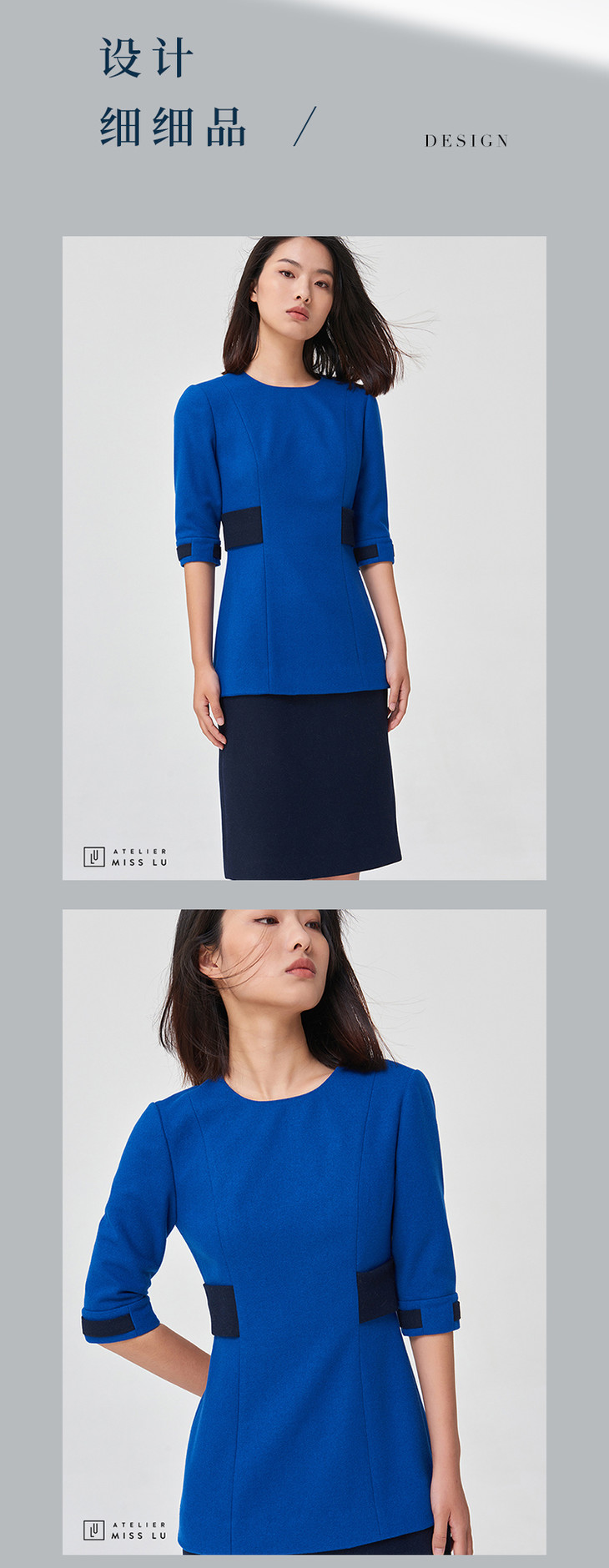 【复古迷情】复古宝蓝拼色收腰简洁款通勤羊毛连衣裙