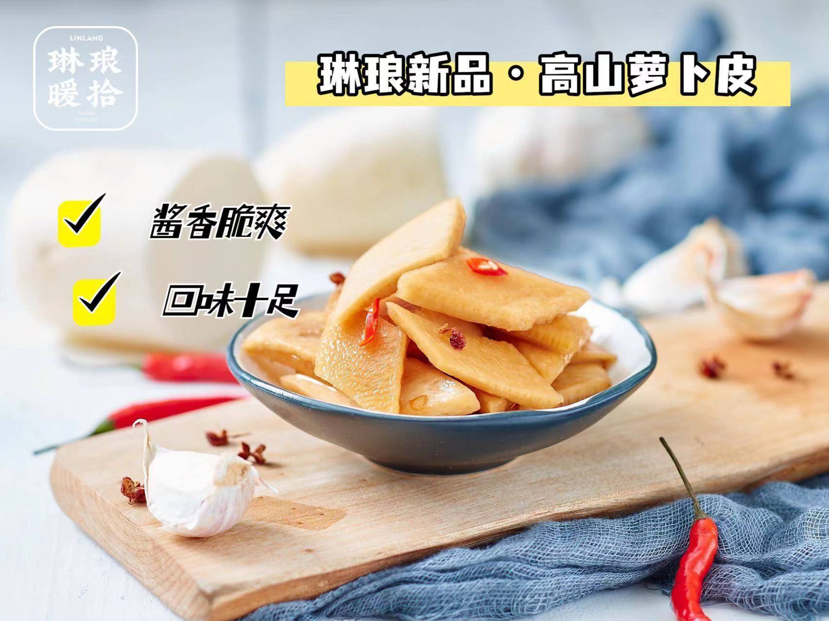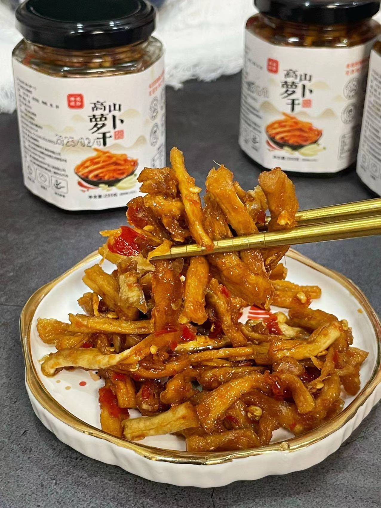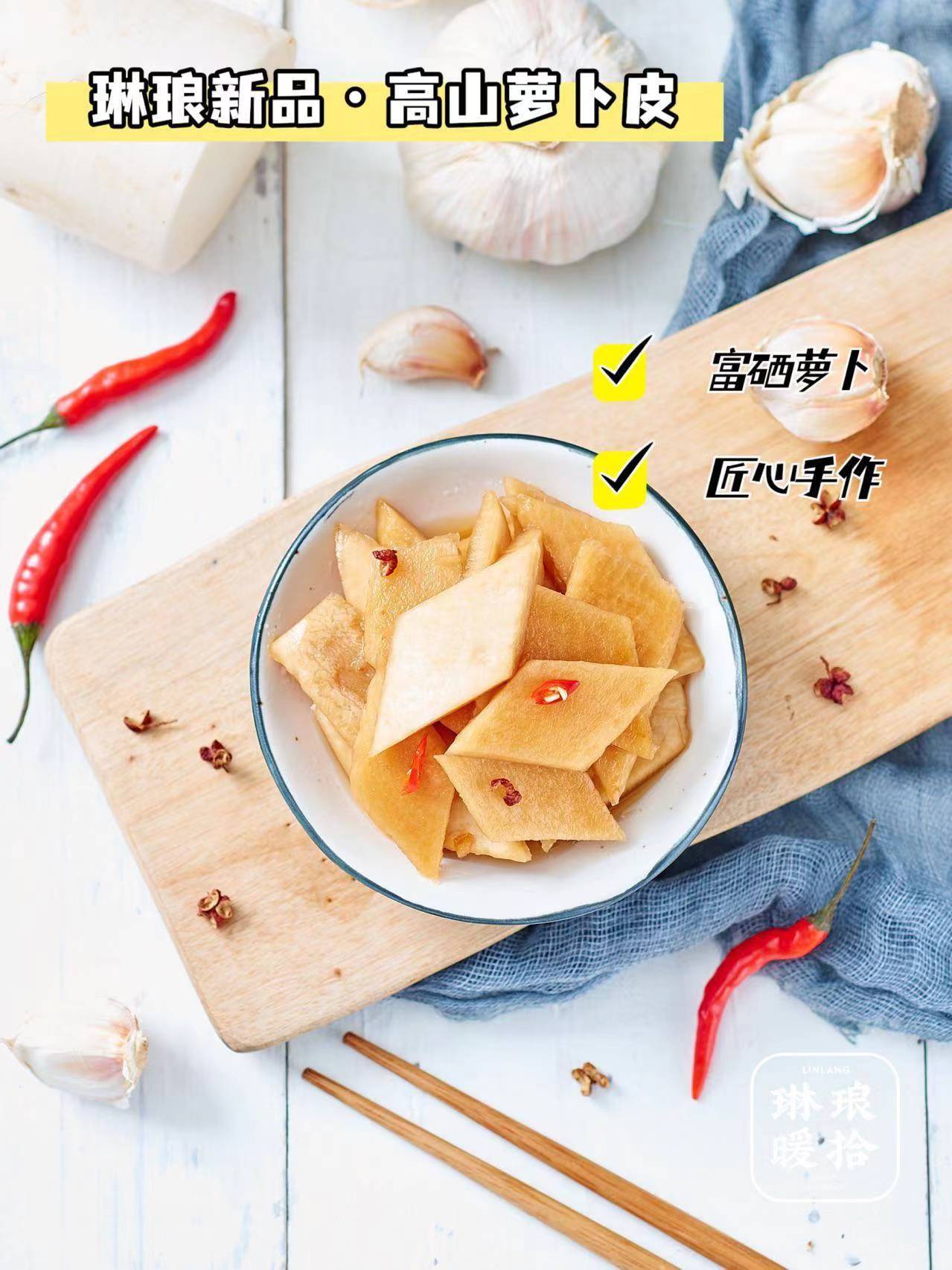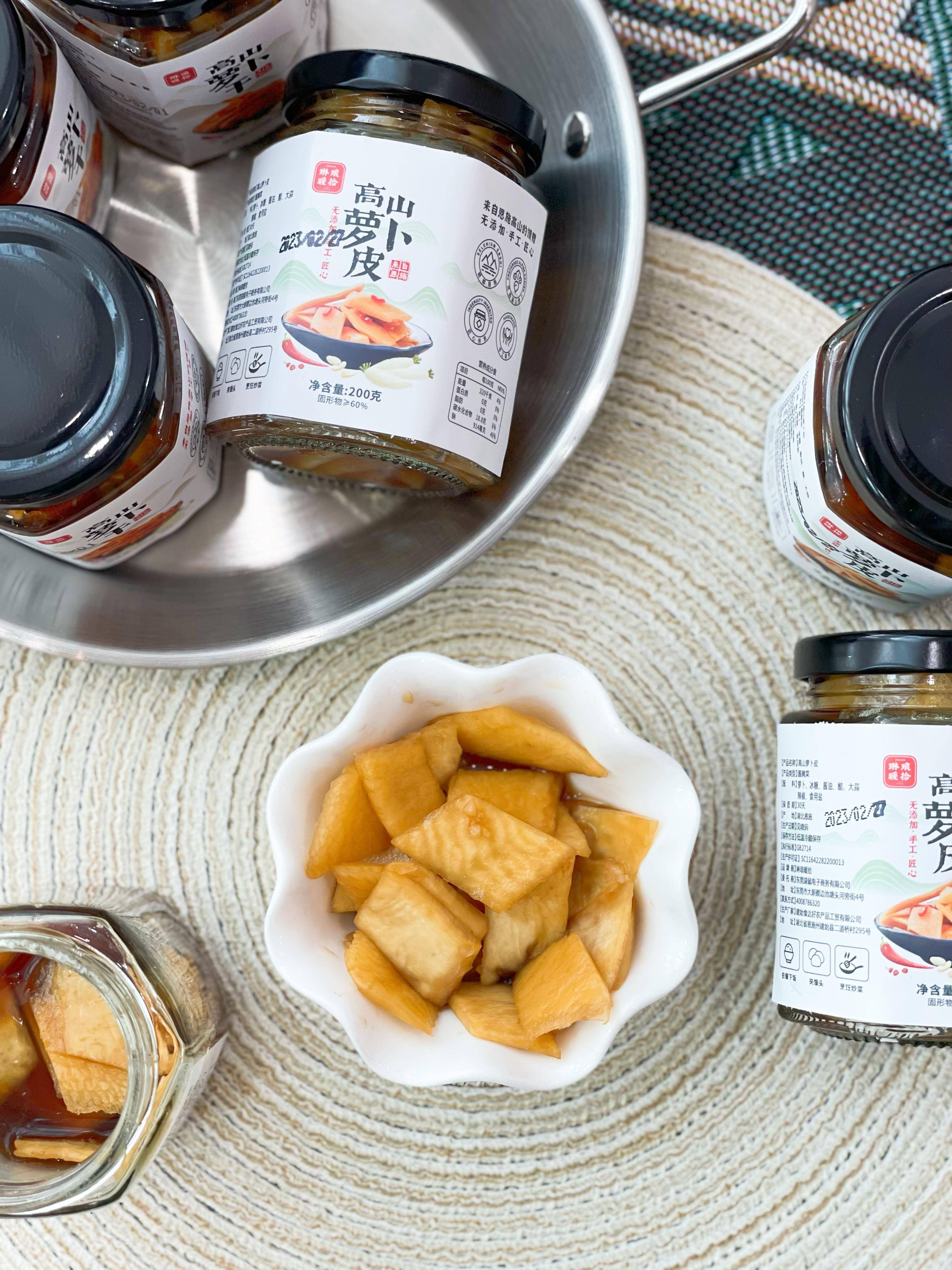 高山萝卜干配料:萝卜、食用盐、辣椒、姜、醋、冰糖、酱油、醋 高山萝卜皮配料:萝卜、冰糖、酱油、醋、大蒜、辣椒、食用盐 产品标准:SB/2714 许可证:SC116422822009