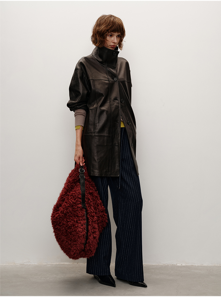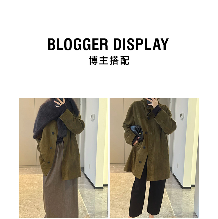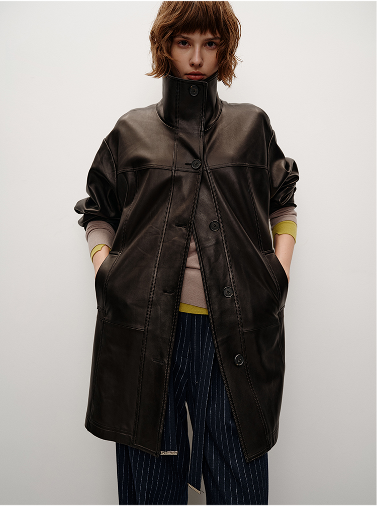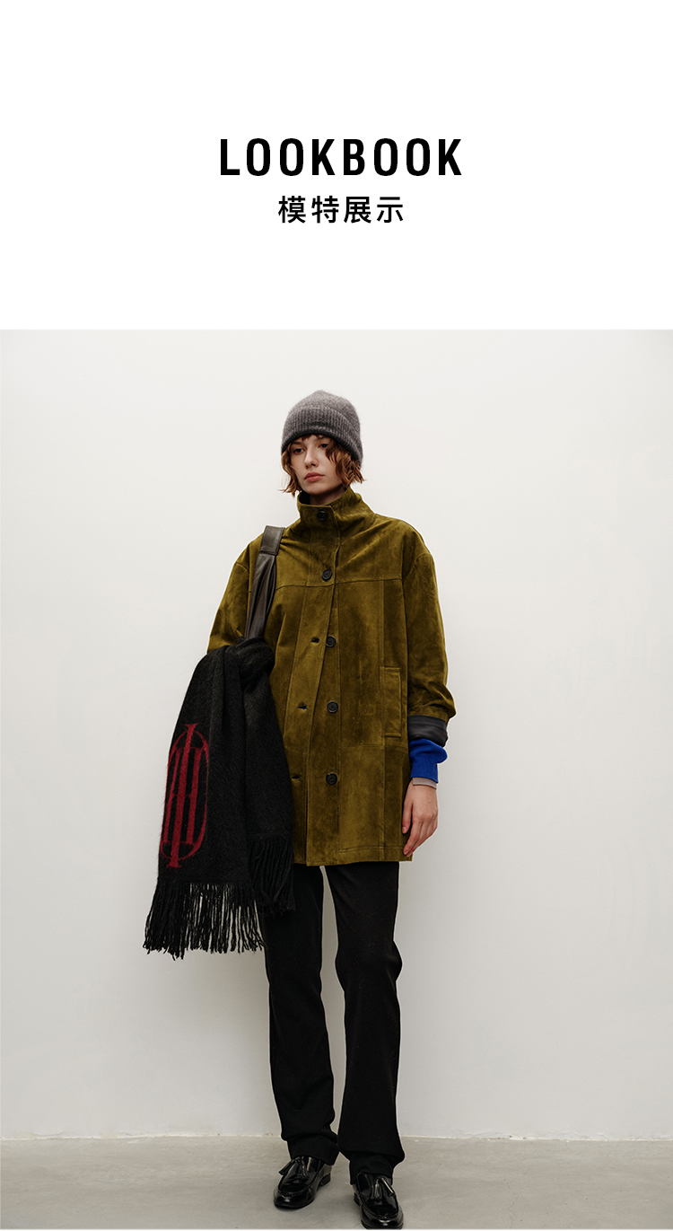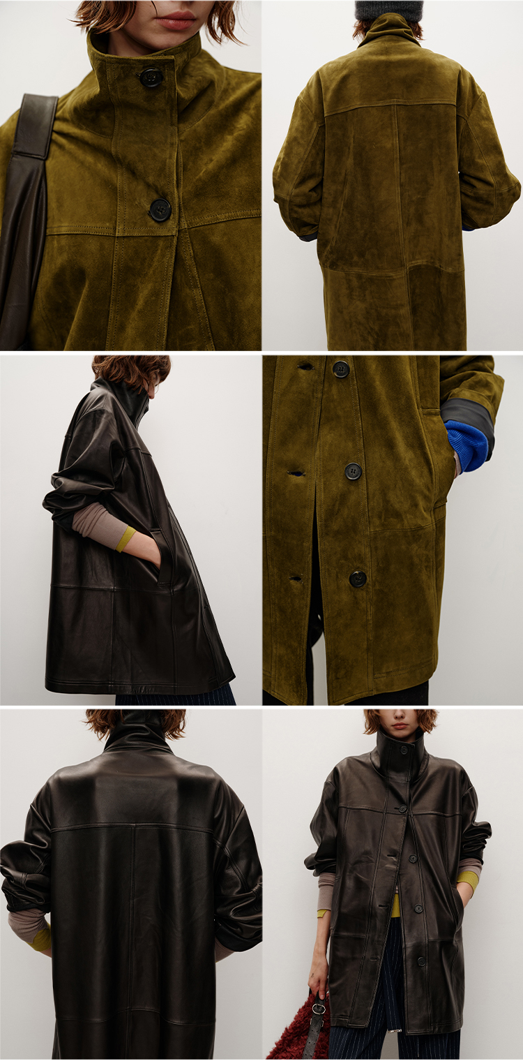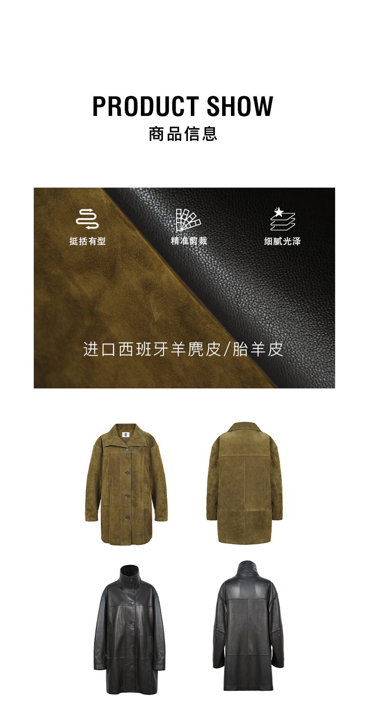 HIDEMI 进口西班牙羊麂皮/胎羊皮廓形中长款立领口袋皮衣大衣外套
