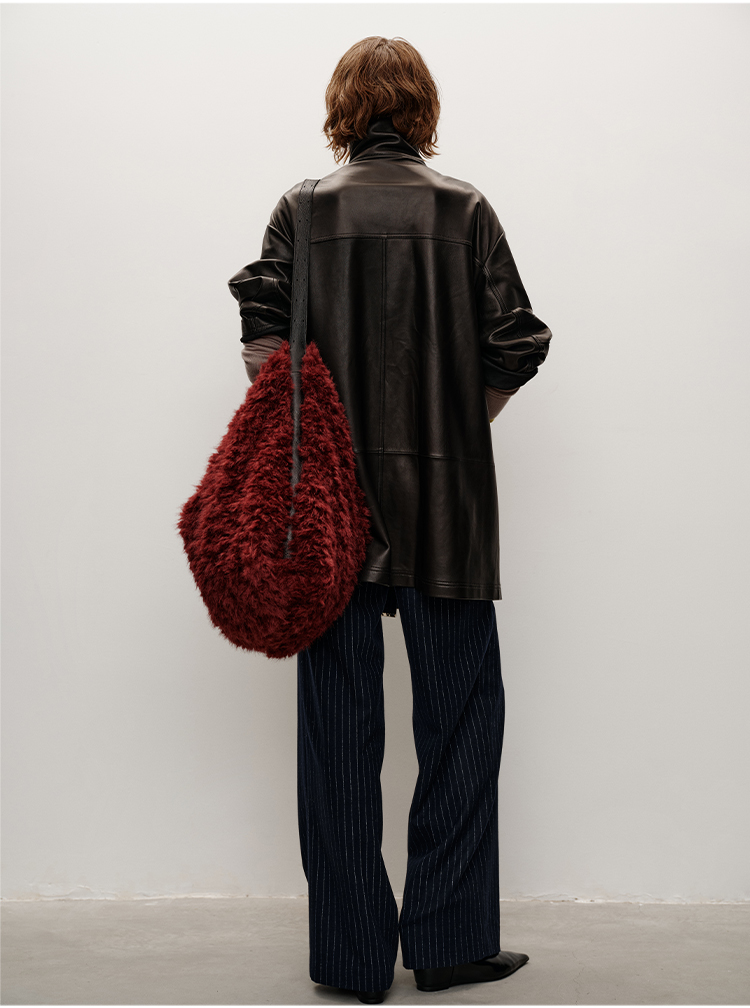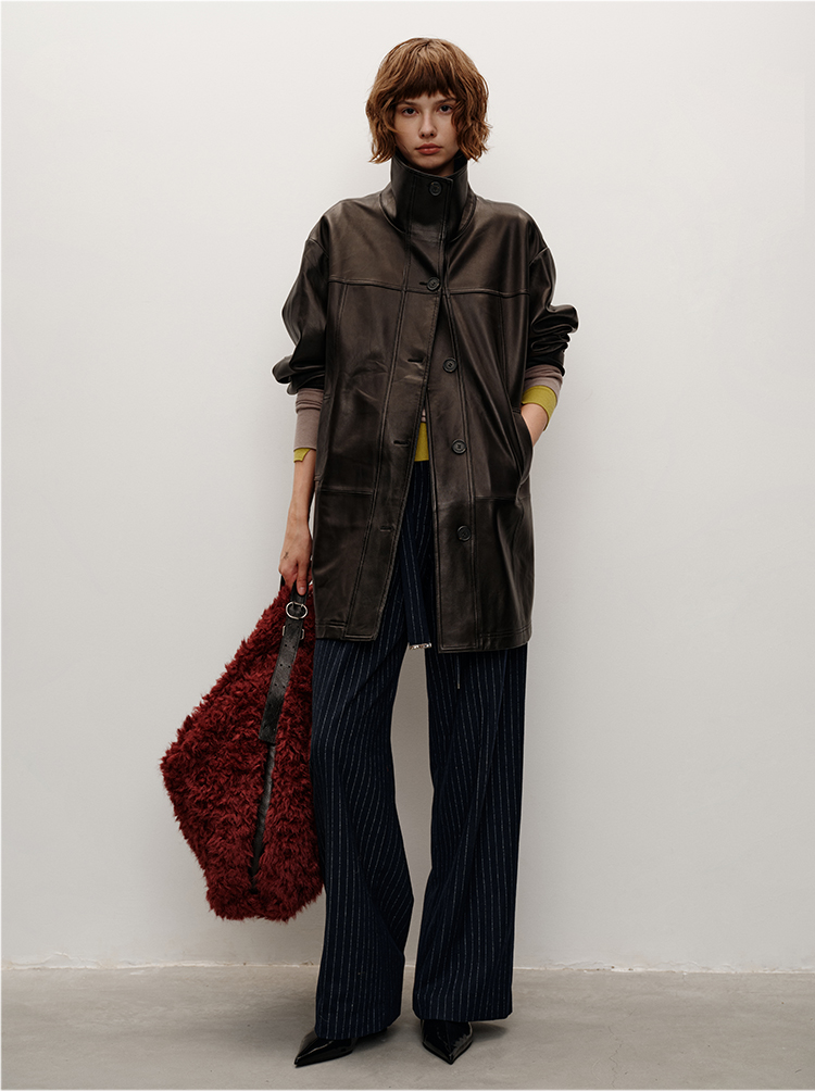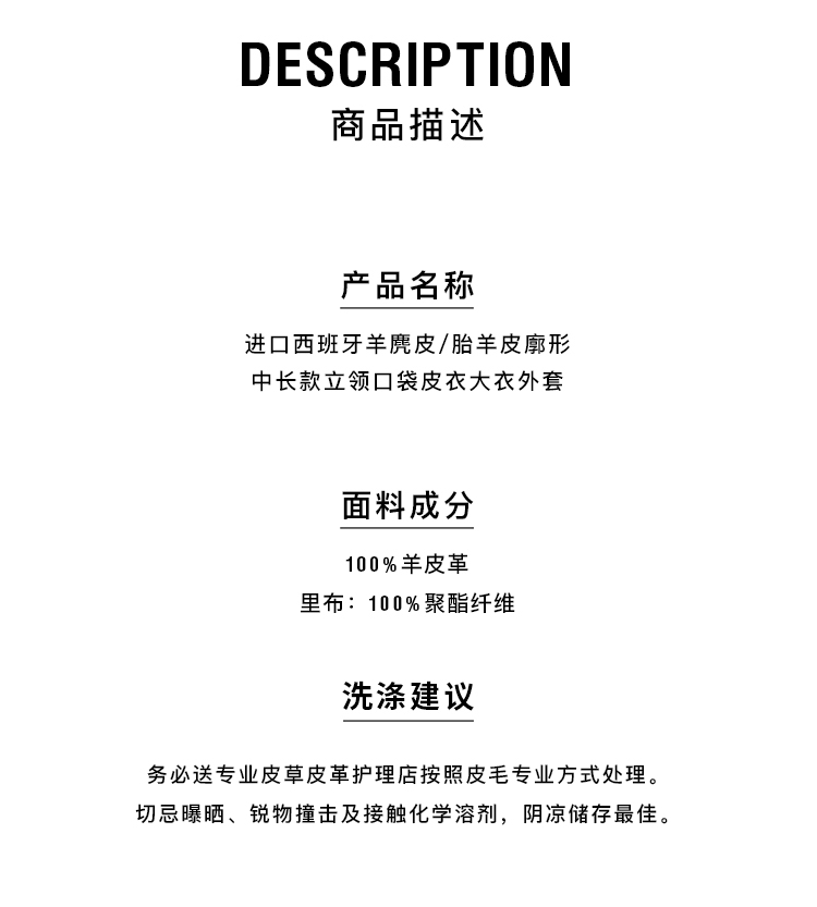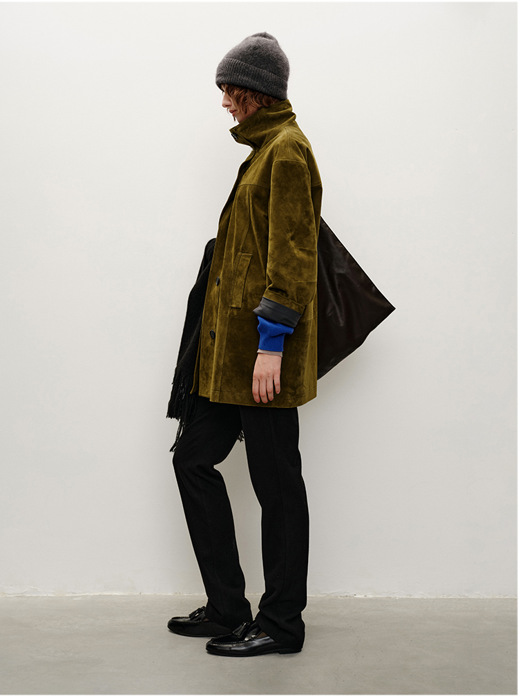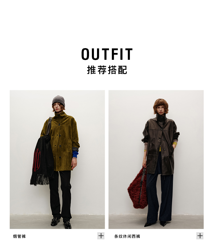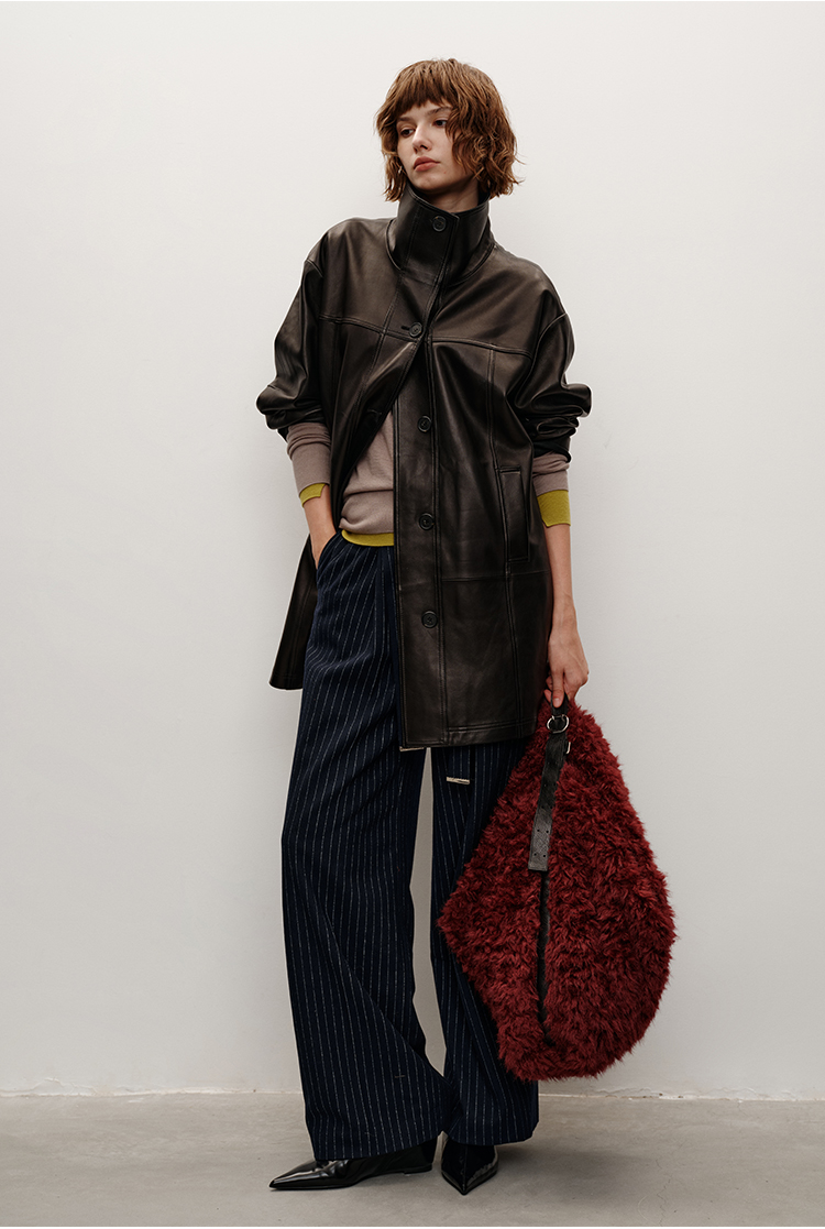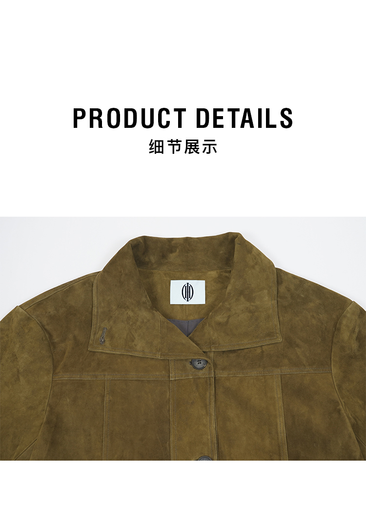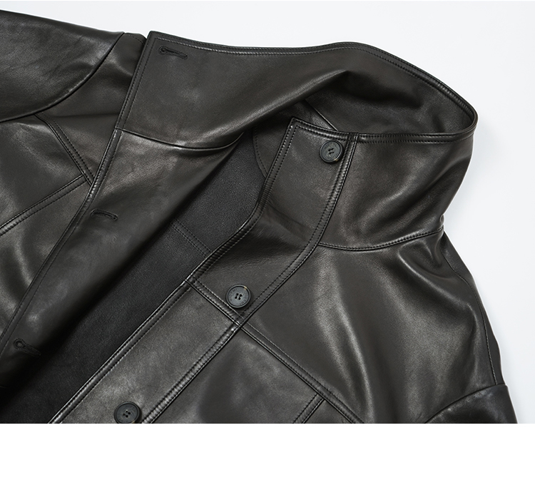 HIDEMI 进口西班牙羊麂皮/胎羊皮廓形中长款立领口袋皮衣大衣外套