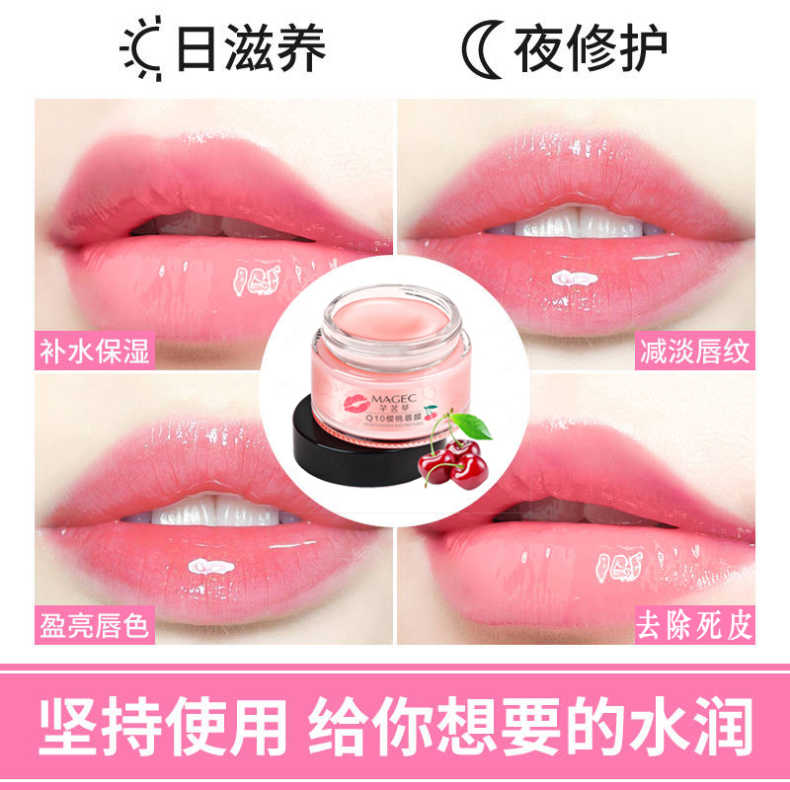 【产品功效】添加樱桃精华,慢慢的水分感,日夜滋润修护,温和不刺激,不含化学香精,滋润唇部,淡化衬布细纹,软化并去除唇部角质和死皮,保湿补水,改善唇部肌肤问题,打造粉嫩樱桃唇。 【适用人群】适用于孕妇男女老少,唇部干燥、脱皮、唇纹深、唇色深、经常涂口红的人士使用效果更加显著。 【使用方法】清洁唇部后,用唇刷蘸取唇膜,均匀涂抹厚厚一层,唇部角质和死皮会慢慢溶解,滋润成分渗透唇部,翌日清晨用化妆棉或纸巾将残留的唇膜擦掉,长期使用唇部会越来越粉嫩,柔嫩饱满Q弹。