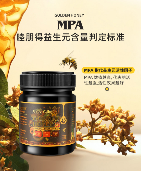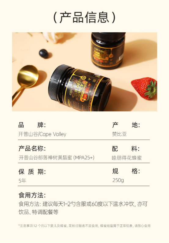 【健康益处】 开普山谷黄晶蜜,源自未受污染的原始森林,经中国农业科学院蜜蜂研究所的权威研究报告显示发现其具有显著抑制幽门螺旋杆菌能力,且表现出色,其活性远超同类产品。 价格只有麦卢卡蜂蜜的1/4. 另特别含有睦朋得益生元MPA,高活性益生元,助力肠道有益菌的生长