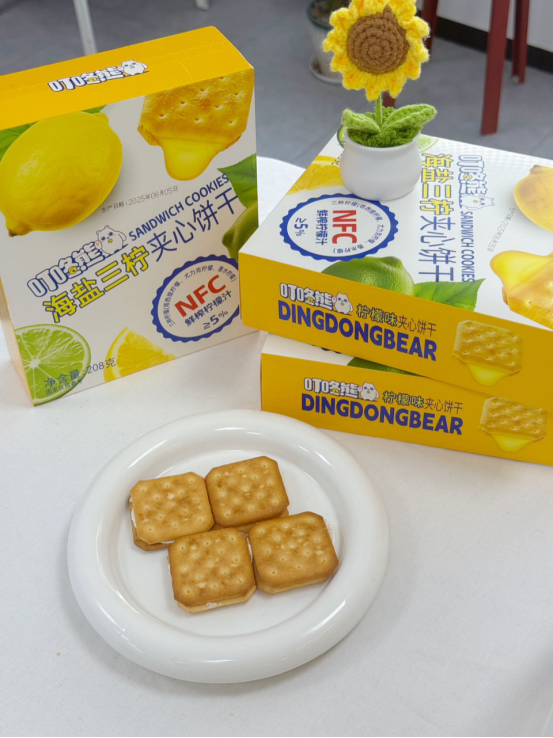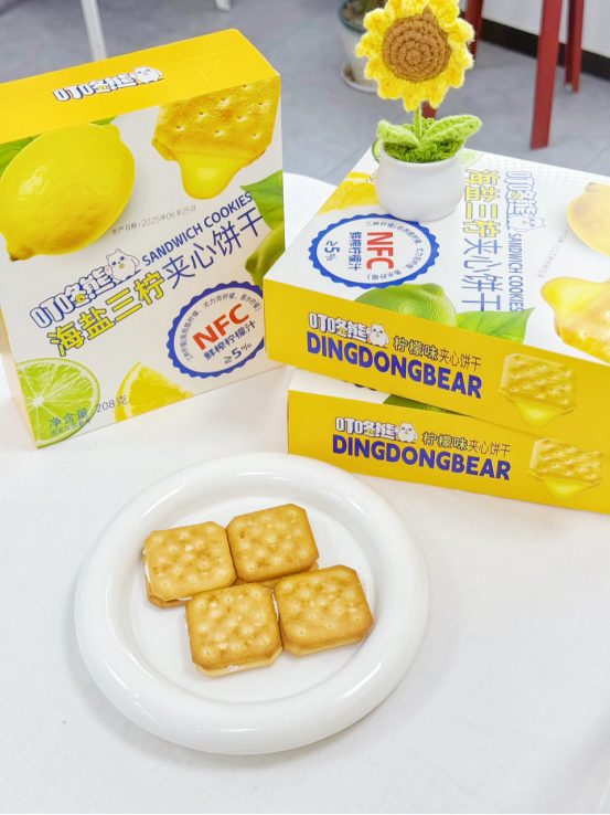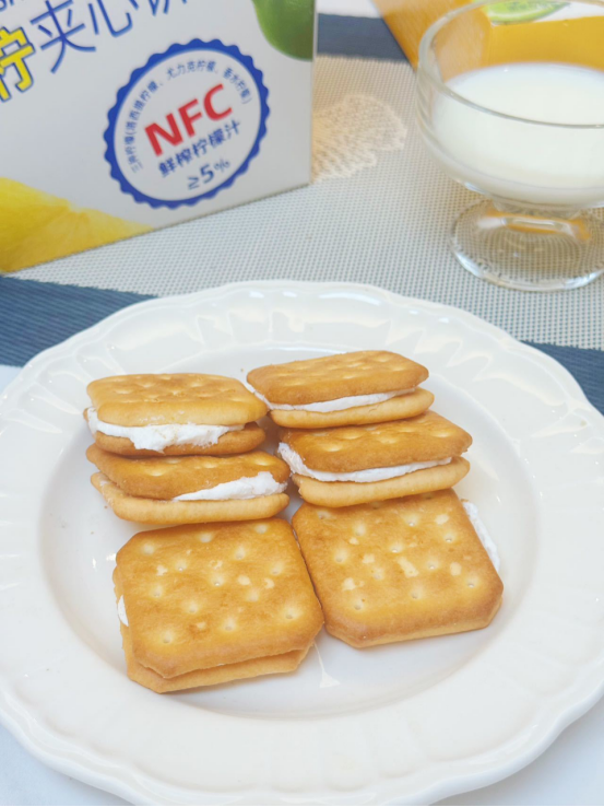 ❄ 【隐藏吃法小贴士】 冷藏30分钟 → 夹心升级“柠檬冰淇淋”口感! 搭配冷泡绿茶 → 解锁夏日解腻王炸CP! 我们死磕「真柠汁」的代价: 三条柠檬产区直采供应链→ NFC鲜榨汁活性强 → 必须48小时内灌装,否则氧化变苦! 采摘→榨汁→灌装流水线日夜轰鸣,跟氧化反应死磕到底! 夹心柠檬汁>5% → 饼干胚酸到开裂 锁死5%黄金线:多1%太狂,少1%太温吞!