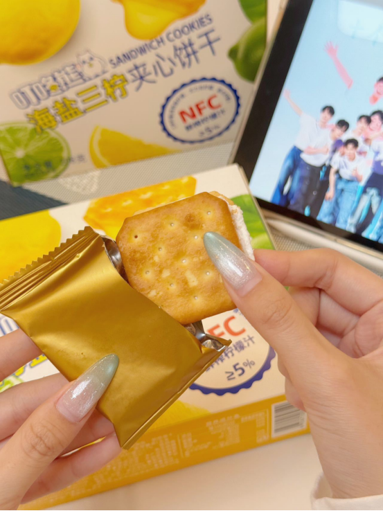 真·三柠鲜榨≥5%!实打实用了三种鲜柠檬榨汁(非香精勾兑) 用NFC技术冷压榨汁 ~酸得鲜活有层次! 👉5% NFC鲜榨柠檬汁(不是香精!) 👉3种柠檬混搭:香水柠檬(清香)+尤力克柠檬(酸爽)+塔西提柠檬(回甘),每一口都是鲜果的酸甜风暴! 科普小课堂💻——什么是NFC? 简单来说就是🍋果子榨了汁,不掺水、不加糖、不高温折腾,原汁原味直接锁进饼干夹心里头! 一撕开独立小包装,那股子酸香味儿一下就散开了,跟菜市场刚切开的新鲜柠檬飘出来的香气一模一样✨✨~清新自然闻着就让人嘴里忍不住冒口水。