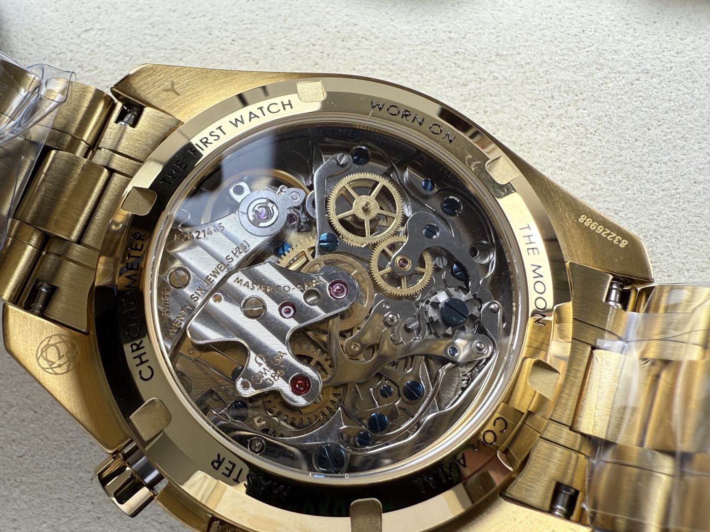 陶瓷表圈上的测速刻度由OMEGA Ceragold 技术制成,并设有早期超霸表款的“Dot Over Ninety” (DON,刻度90的圆点位于数字上方) 标志。经抛光处理,采用双斜面设计风格,镌刻有“THE FIRST WATCH WORN ON THE MOON”和“CO-AXIAL MASTER CHRONOMETER”字样。透过平面蓝宝石玻璃表背,可以欣赏 3861至臻天文台机芯的运转美态。