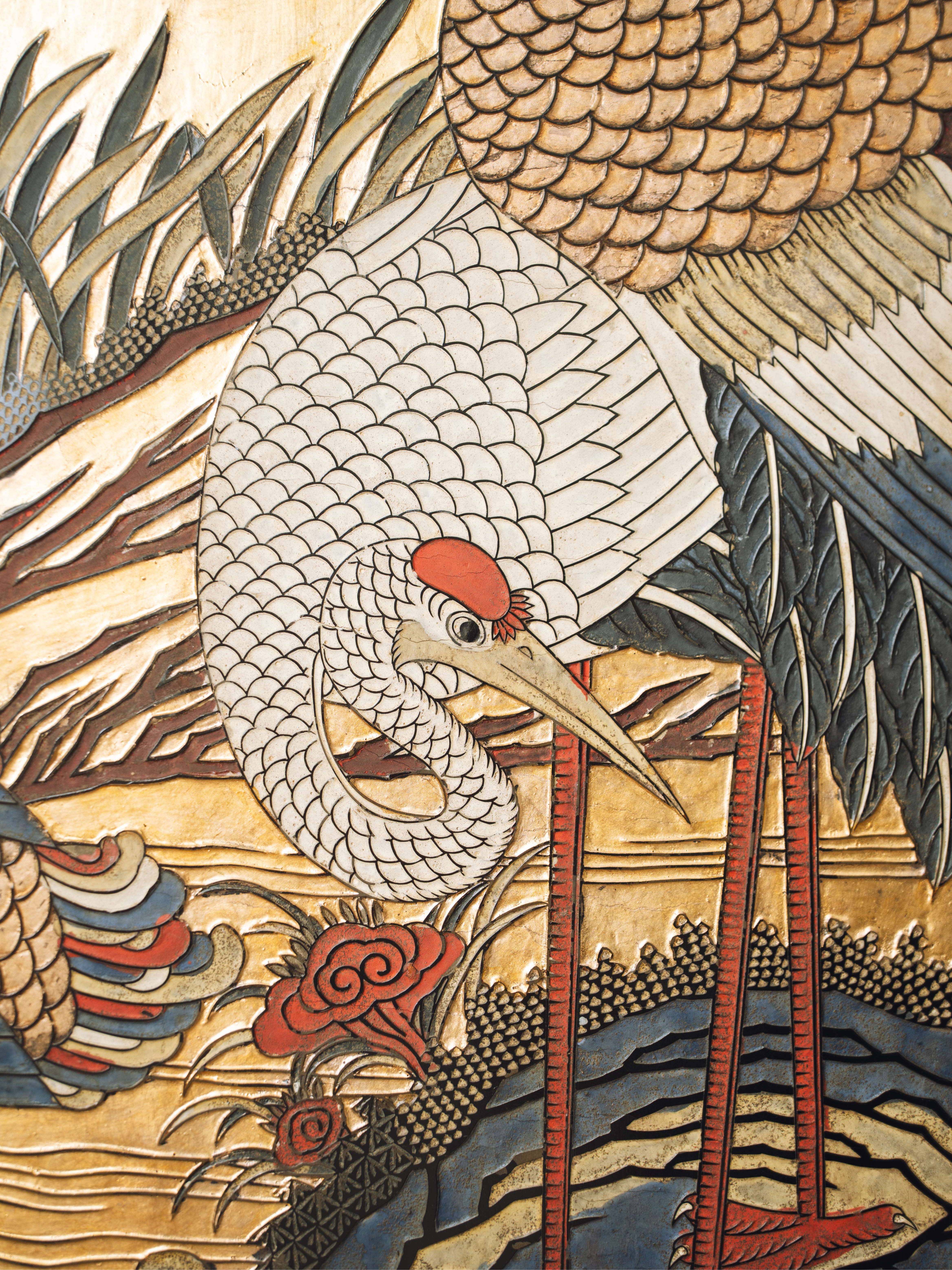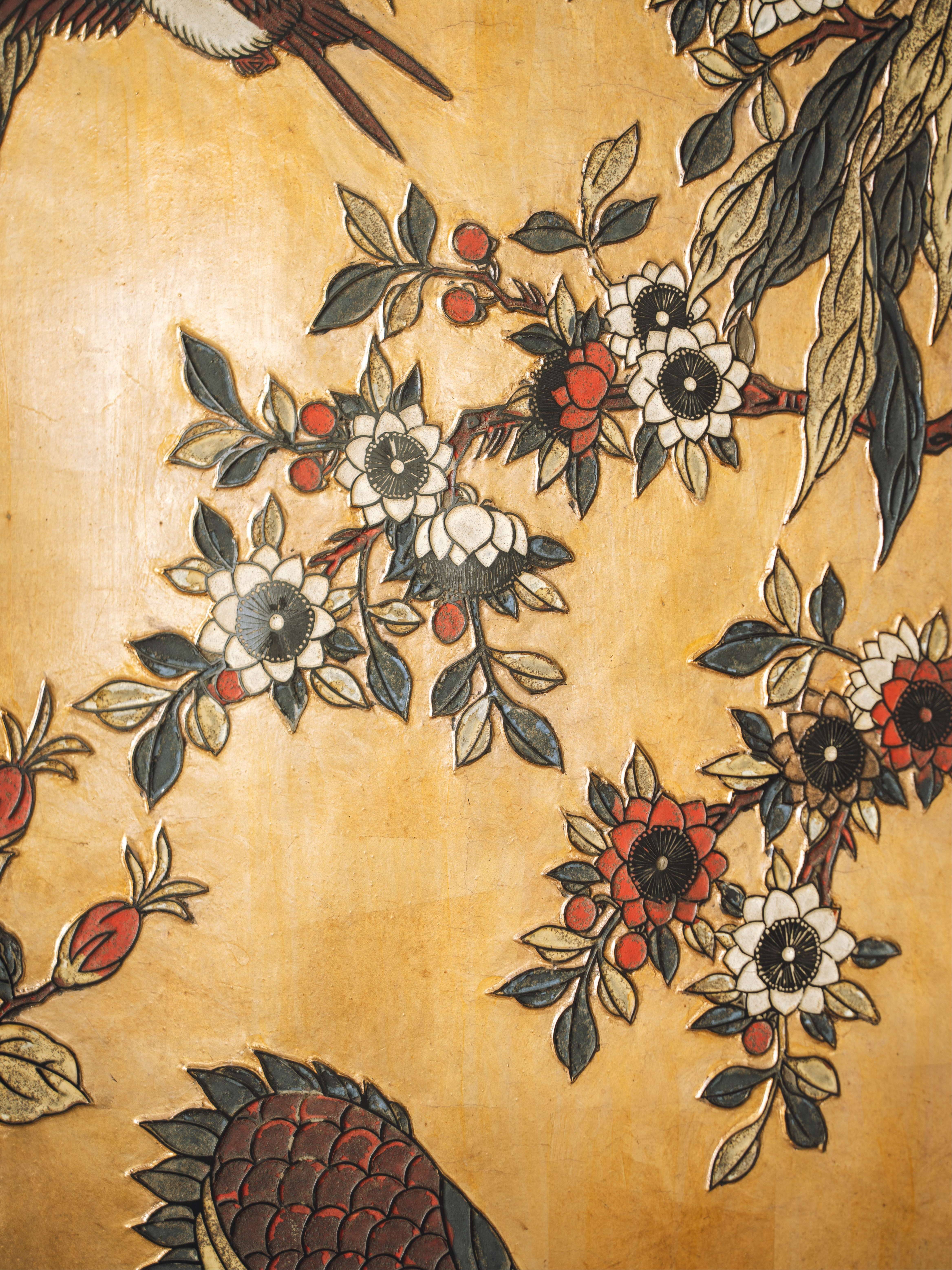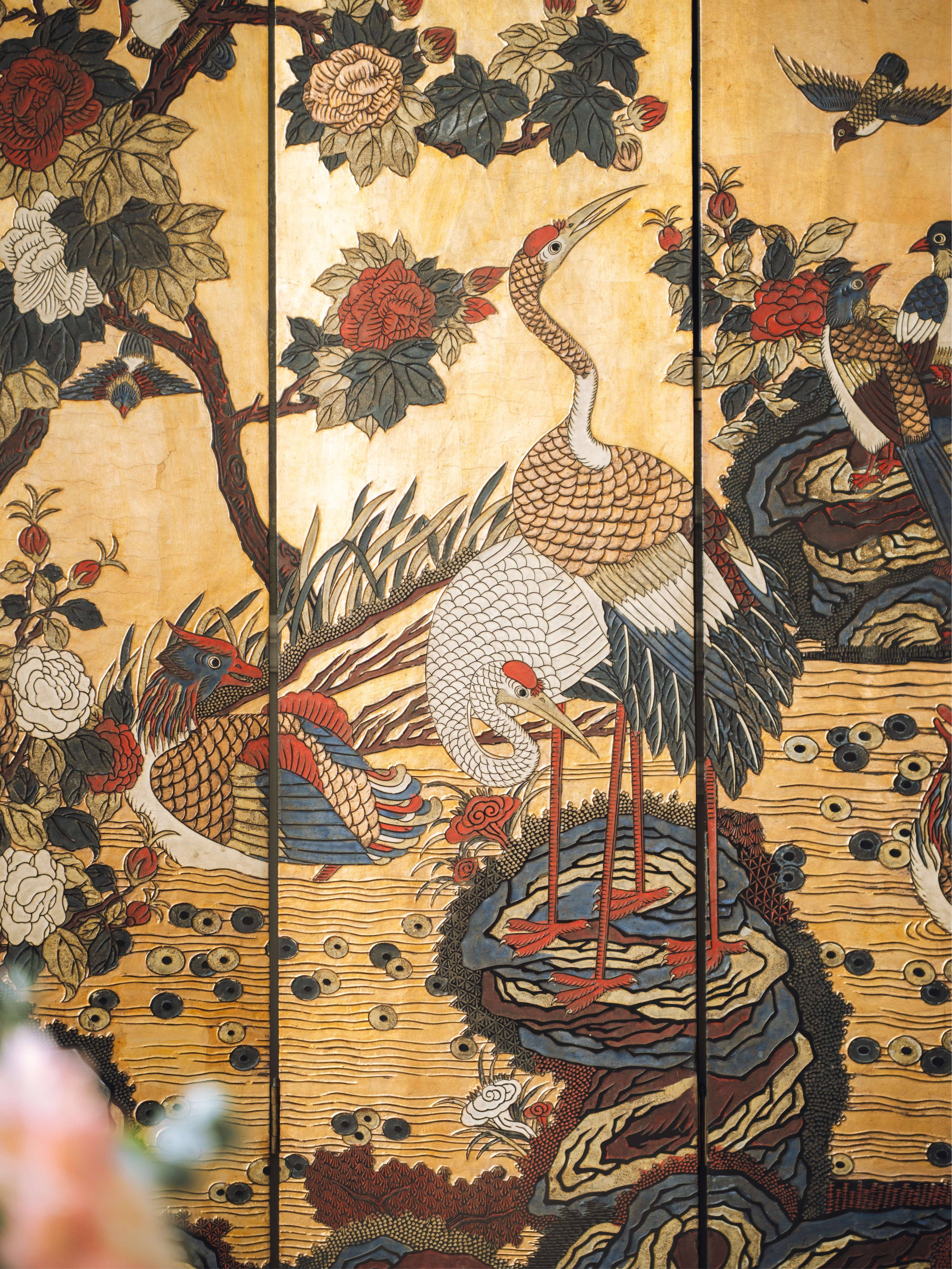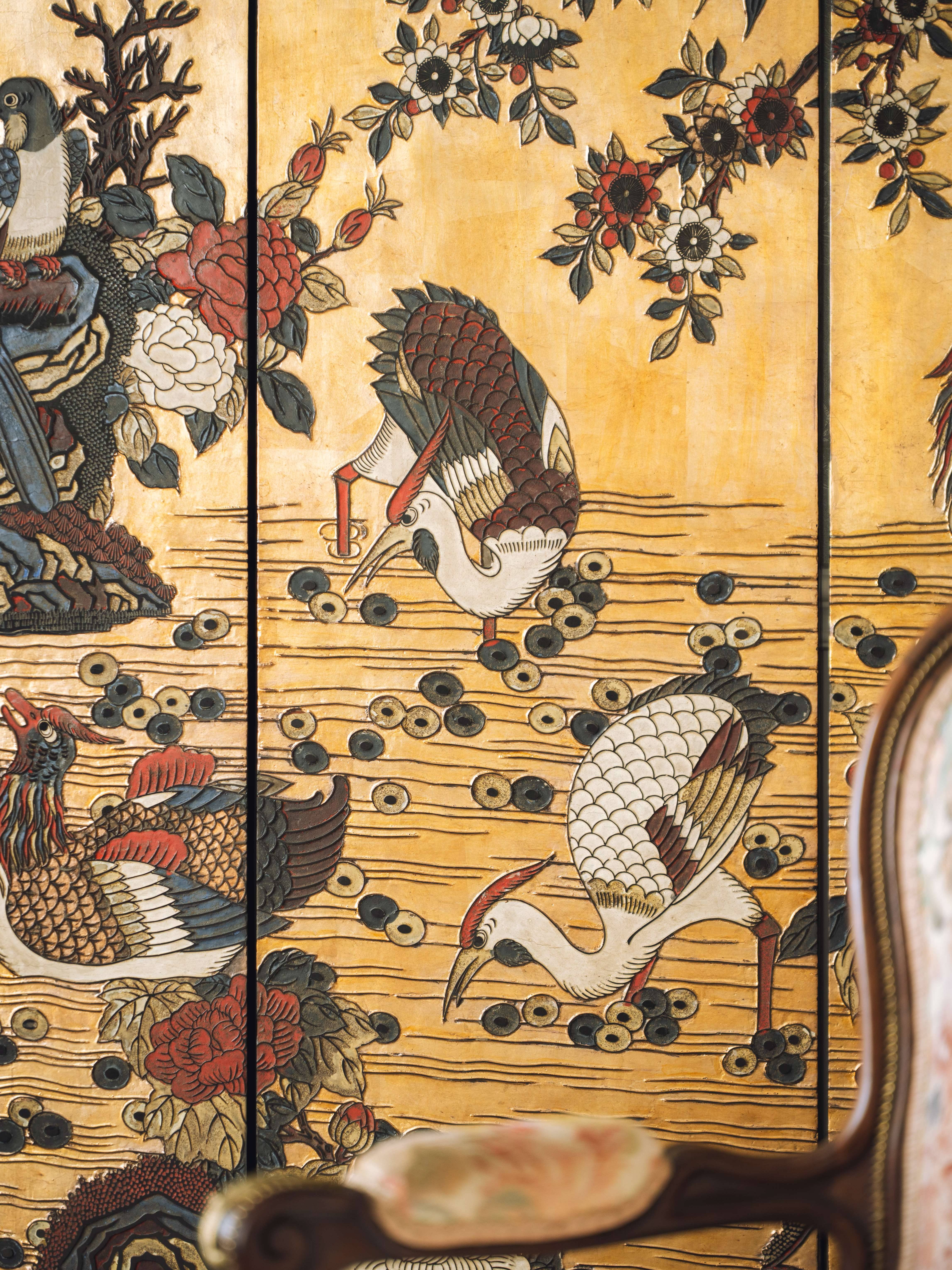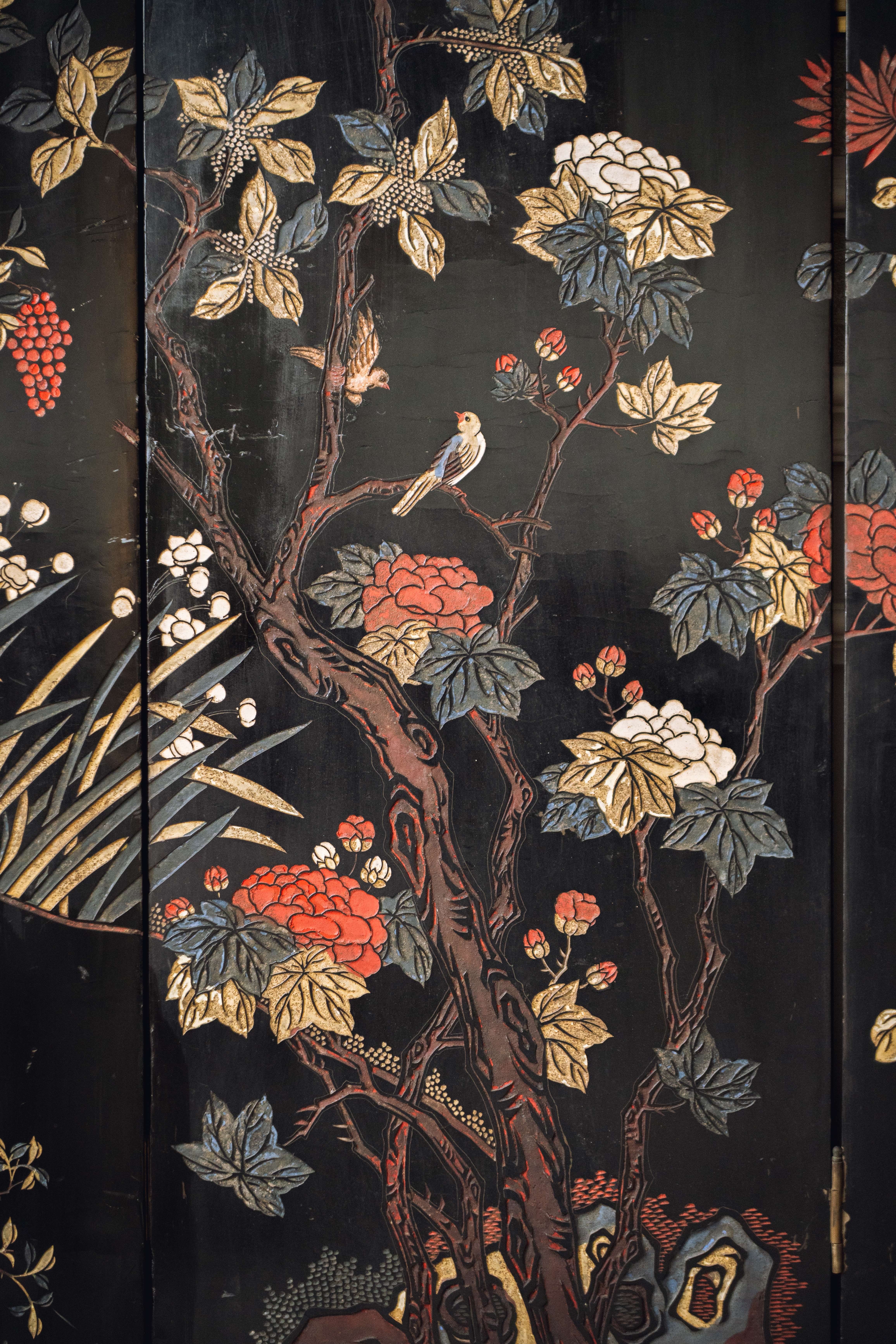 20世纪初期中国出品花鸟山水主题六曲款彩屏风