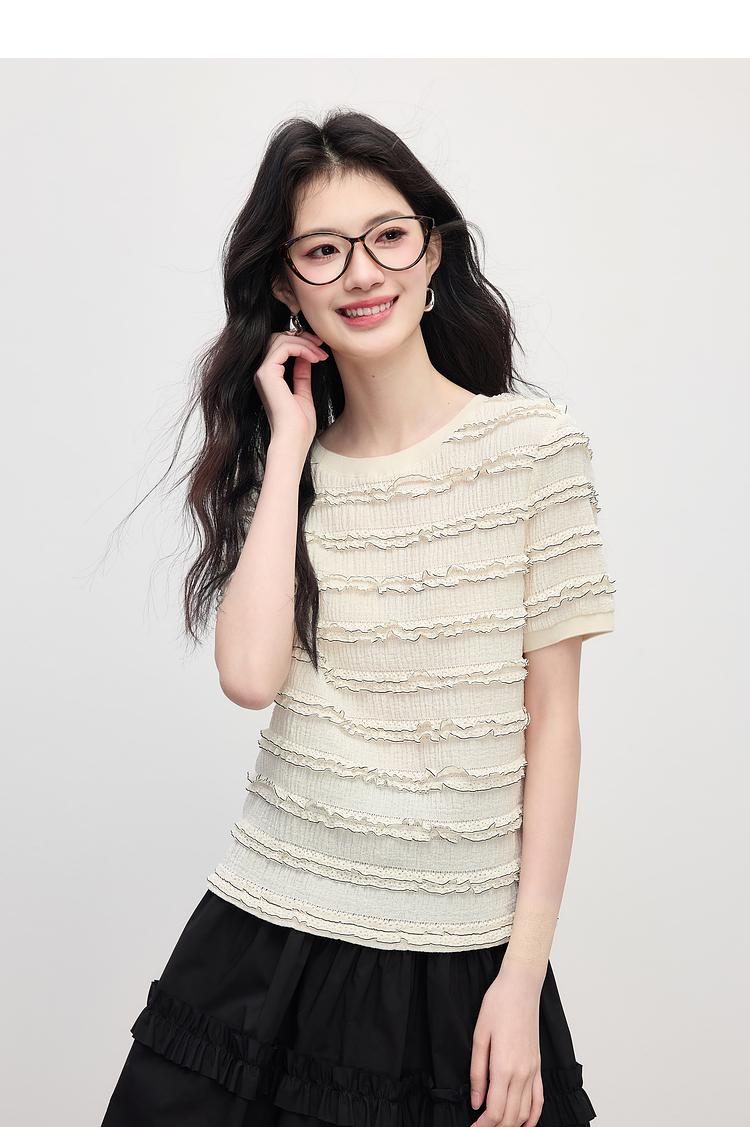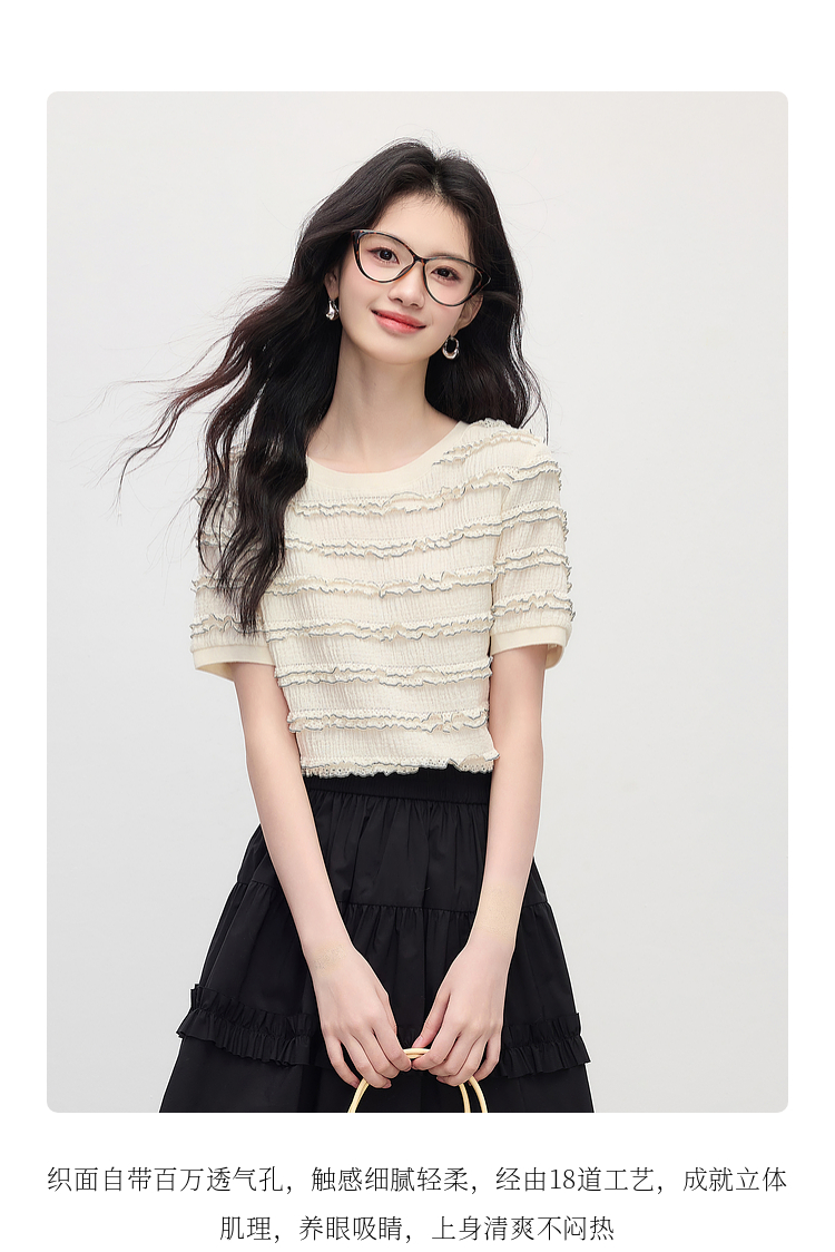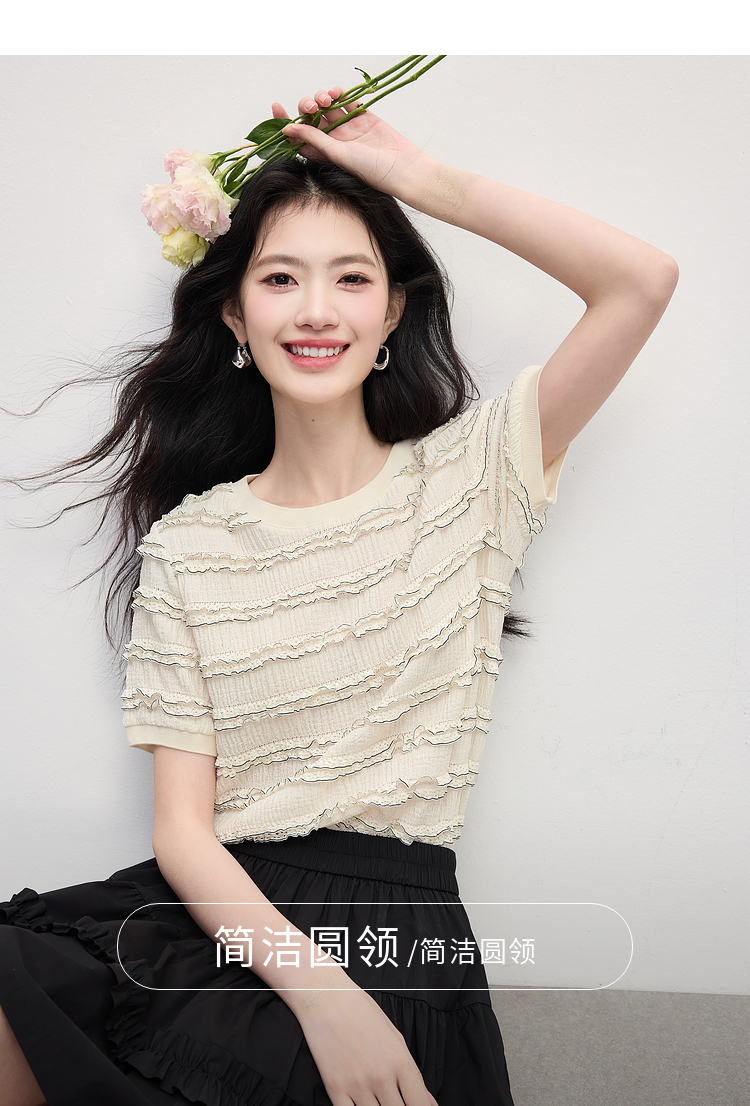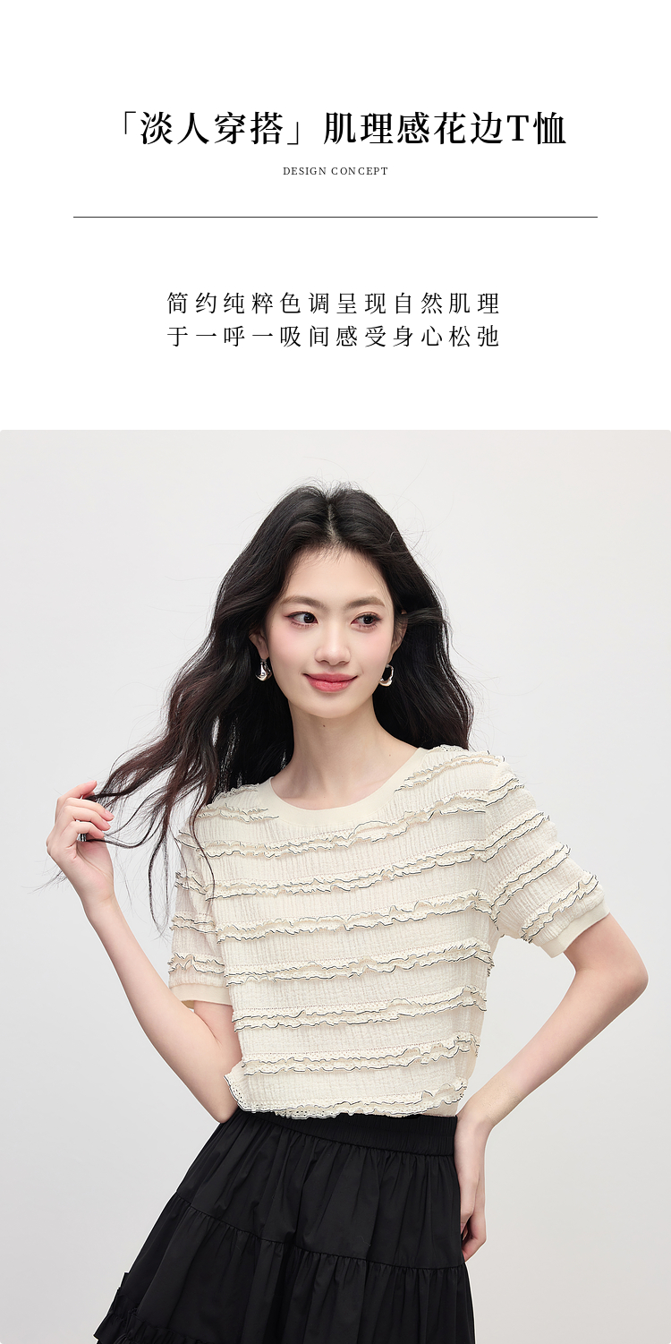 【专属特价】熙世界花边设计肌理感T恤短袖女2025夏季新款圆领独特漂亮的上衣
