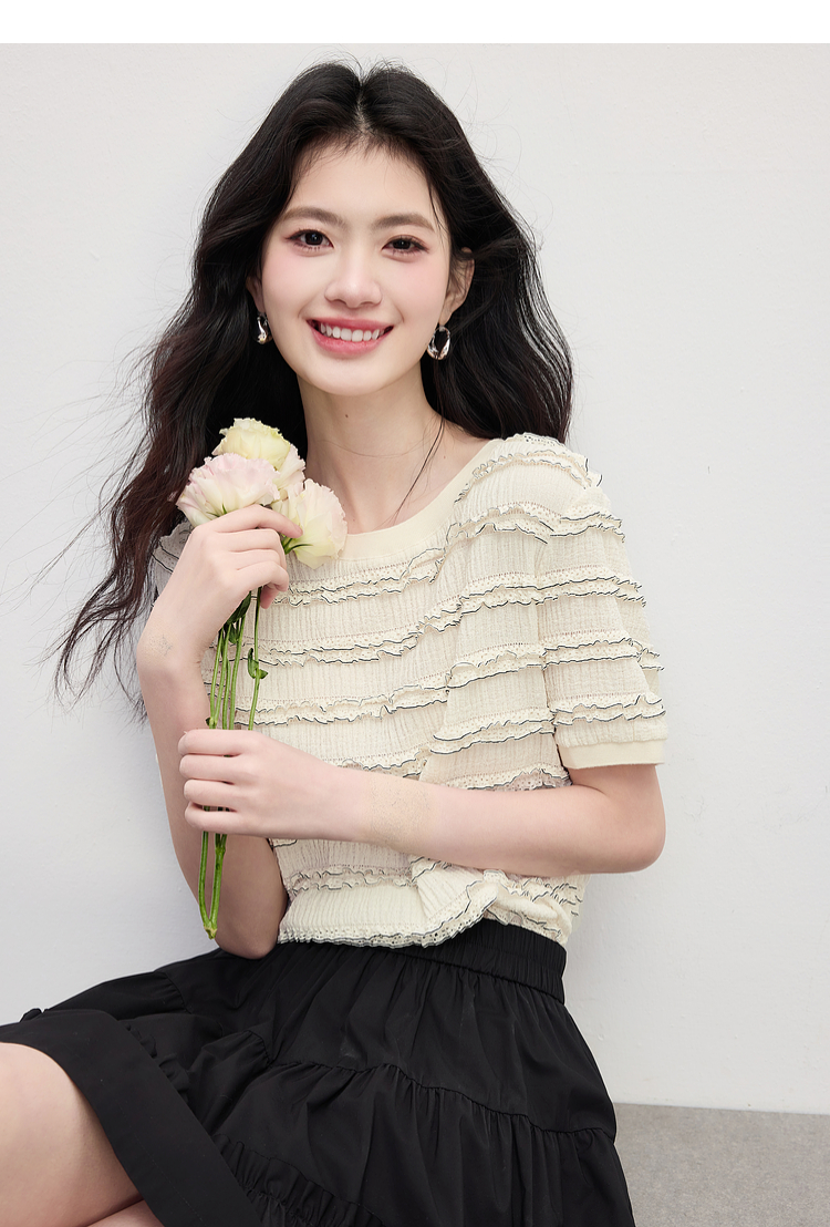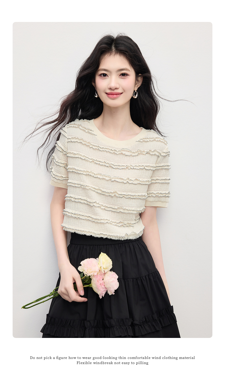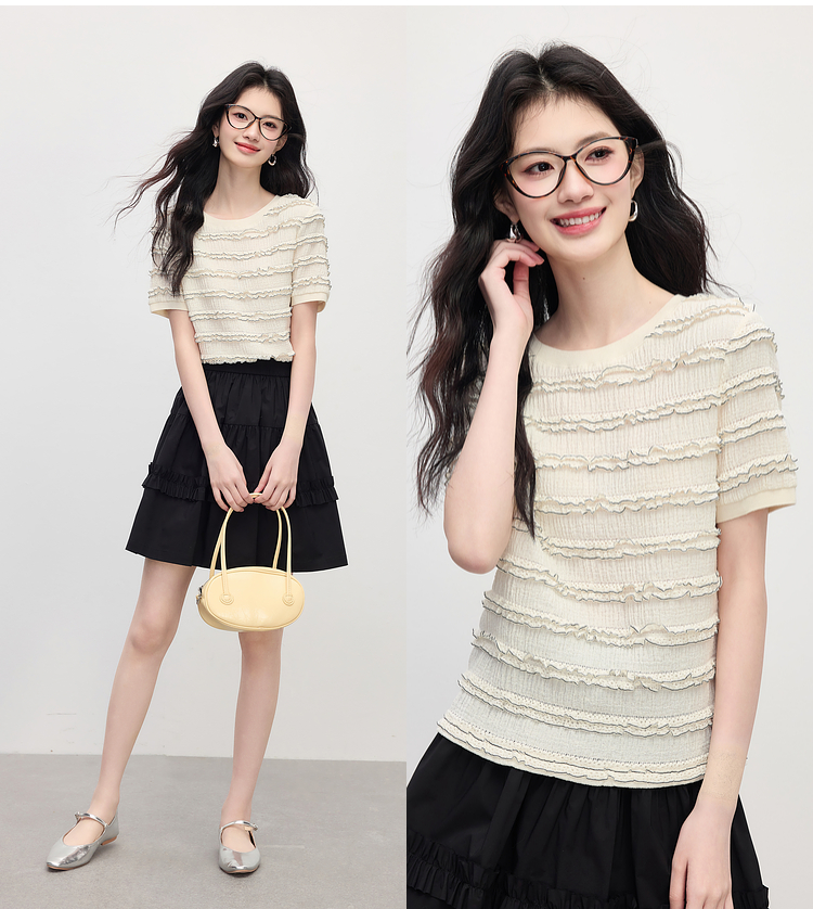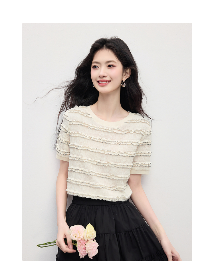 【专属特价】熙世界花边设计肌理感T恤短袖女2025夏季新款圆领独特漂亮的上衣