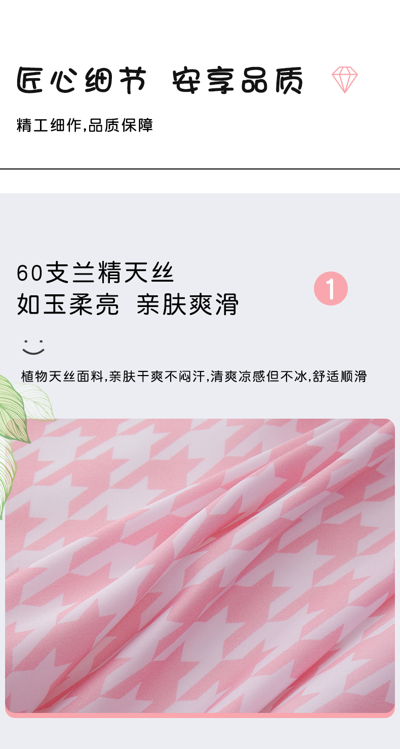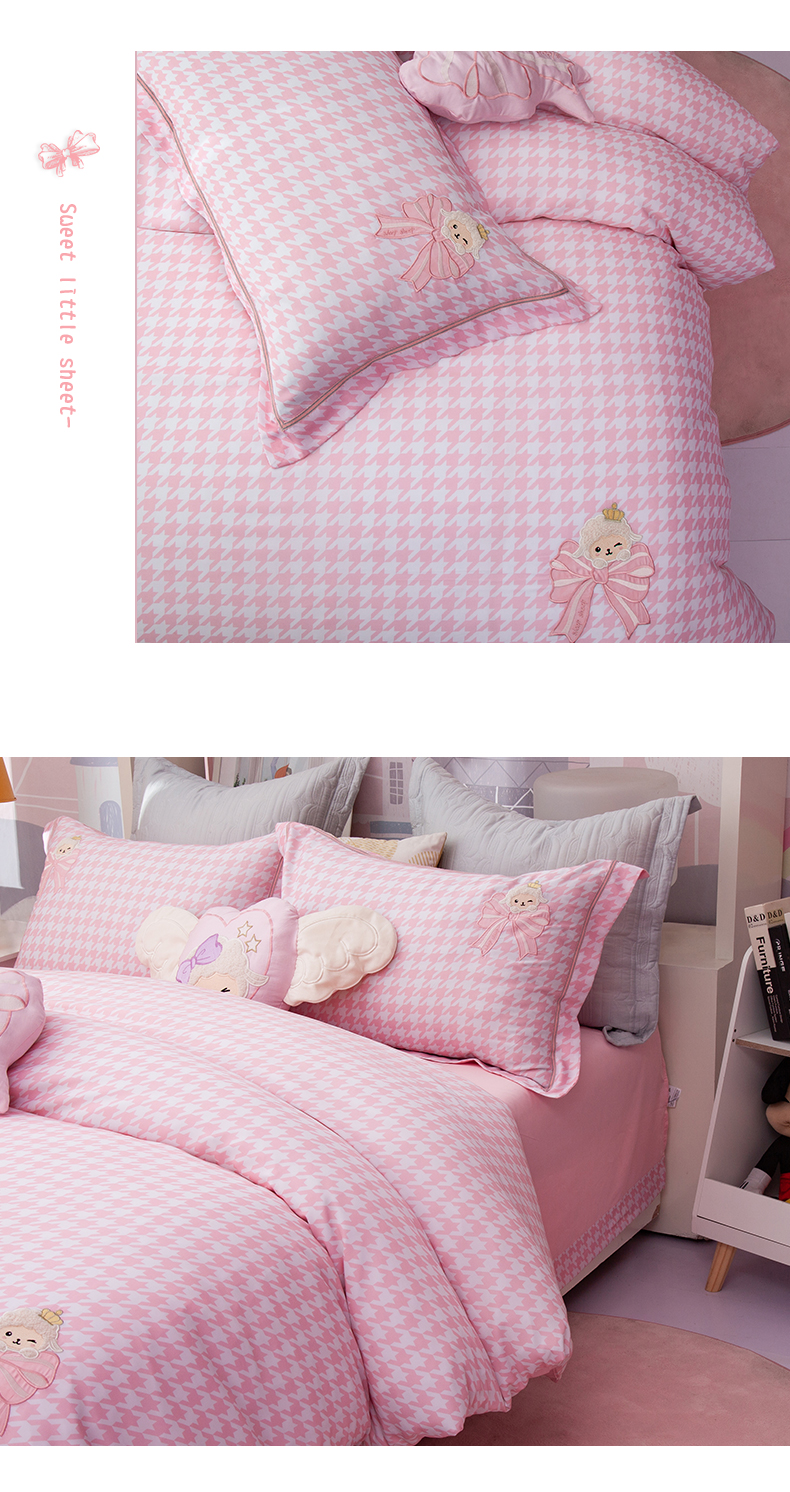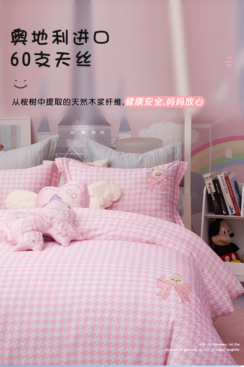 利路米2021夏季新款粉色千鸟格浪漫可爱公主粉天丝绣花四件套