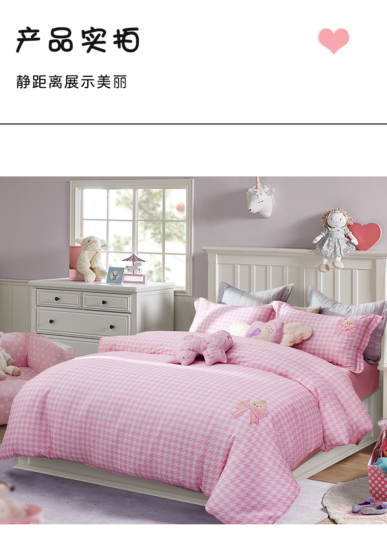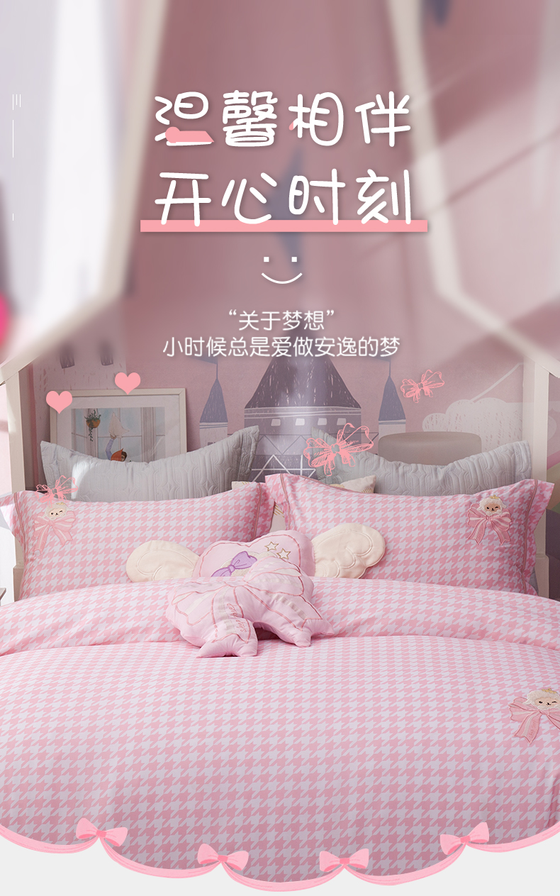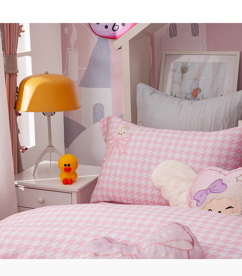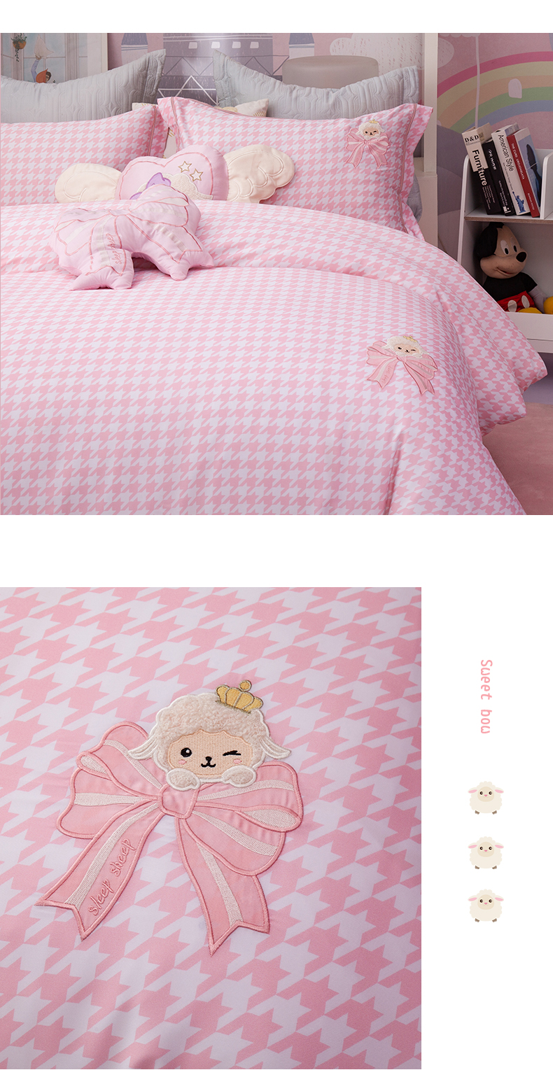 利路米2021夏季新款粉色千鸟格浪漫可爱公主粉天丝绣花四件套