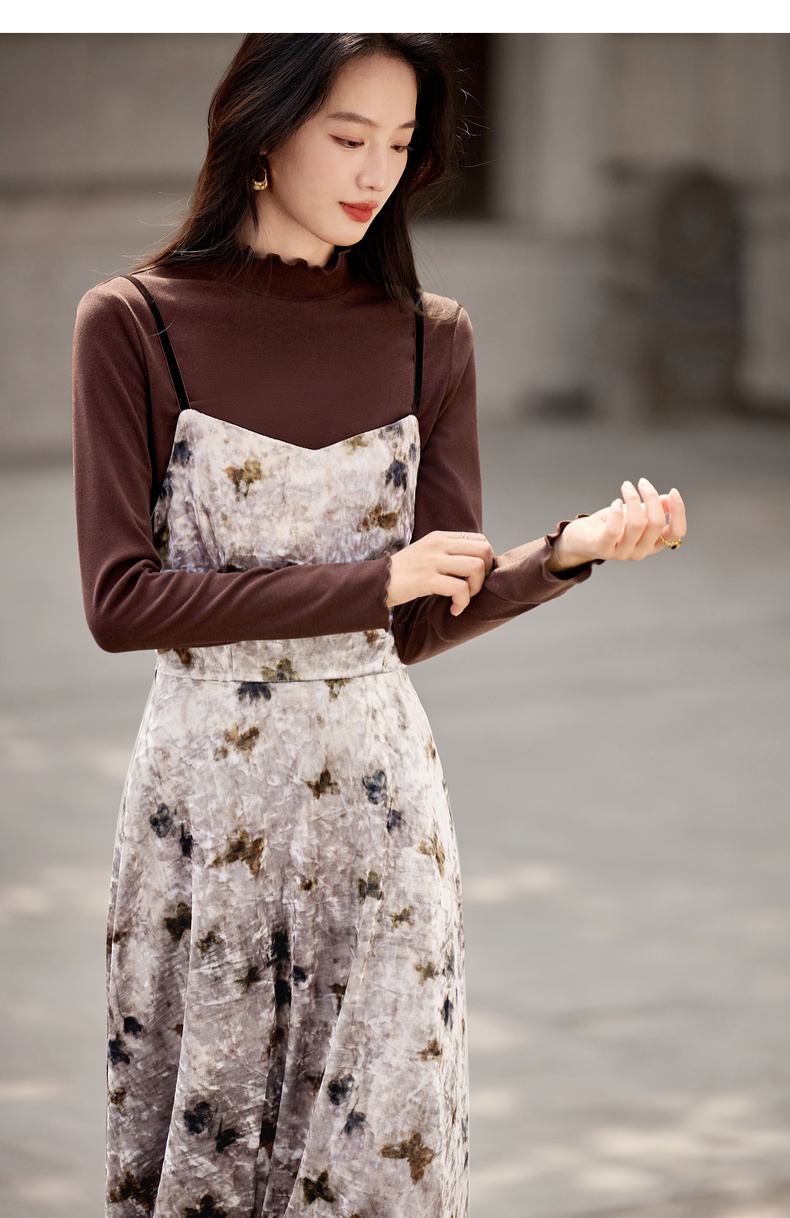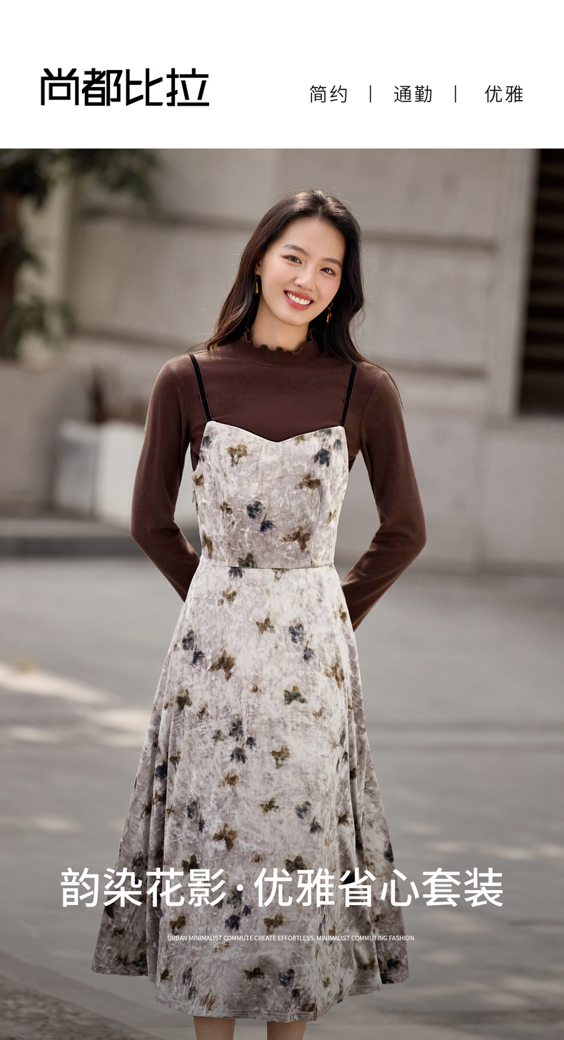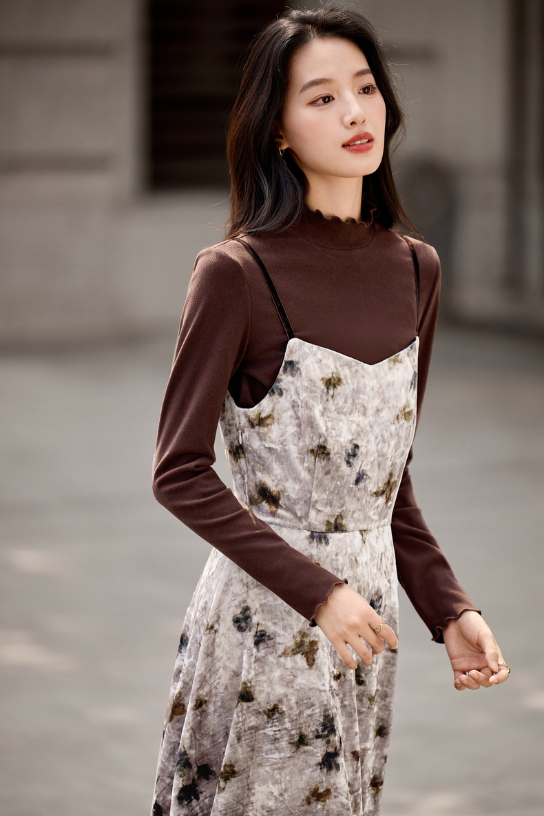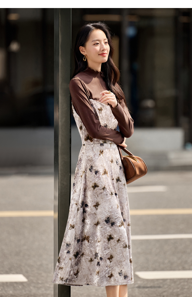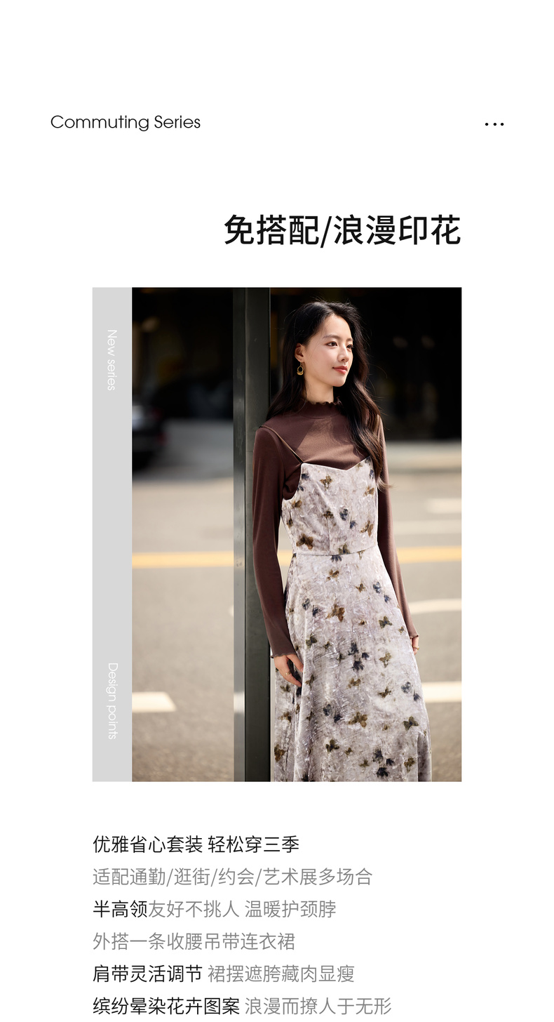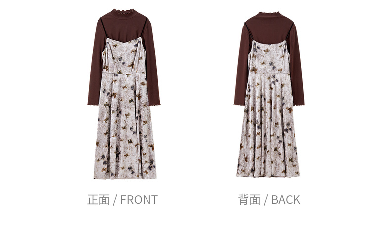 【内购】【免搭配套装】优雅半高领磨毛针织T恤&可调节肩带收腰吊带连衣裙-154ZB3447