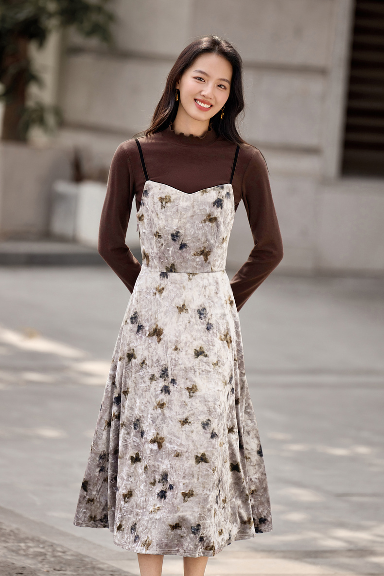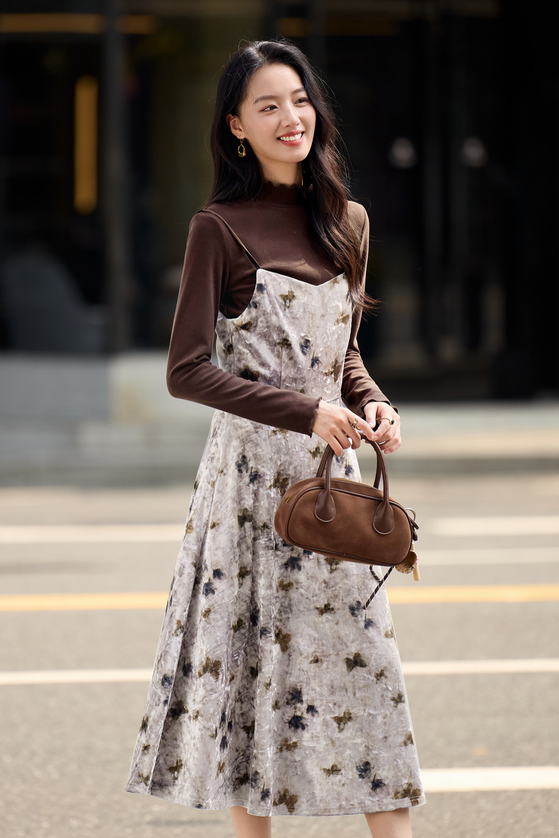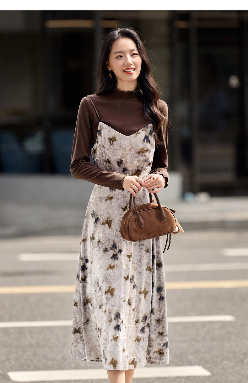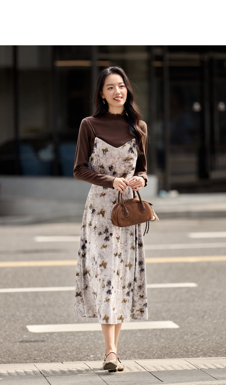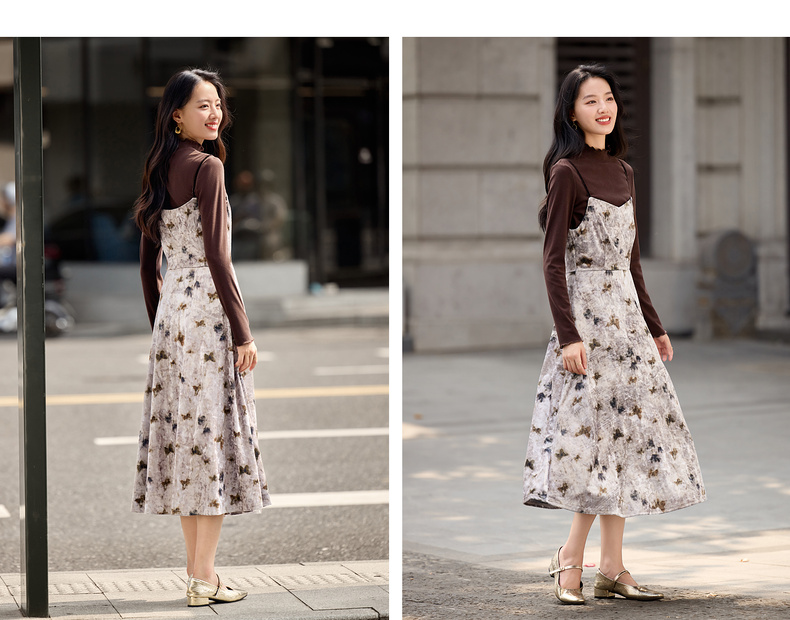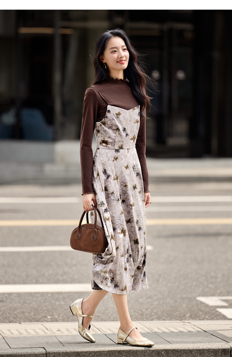 【内购】【免搭配套装】优雅半高领磨毛针织T恤&可调节肩带收腰吊带连衣裙-154ZB3447