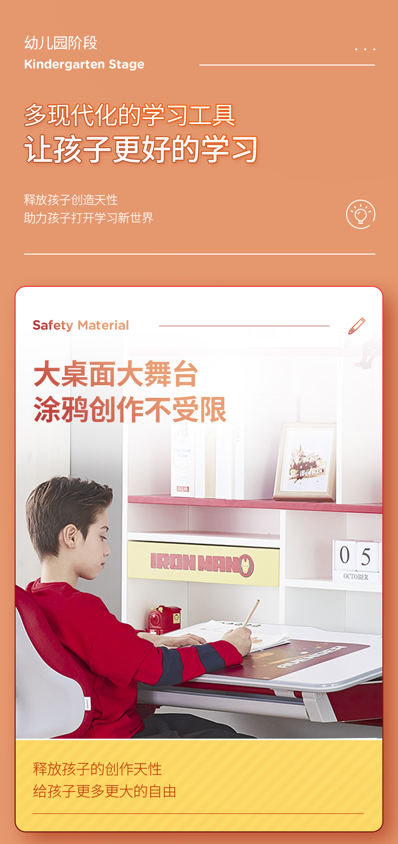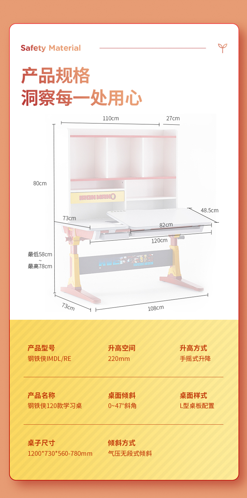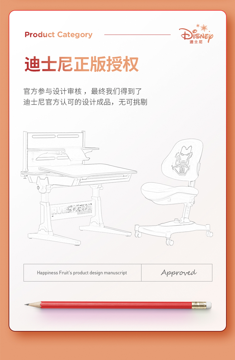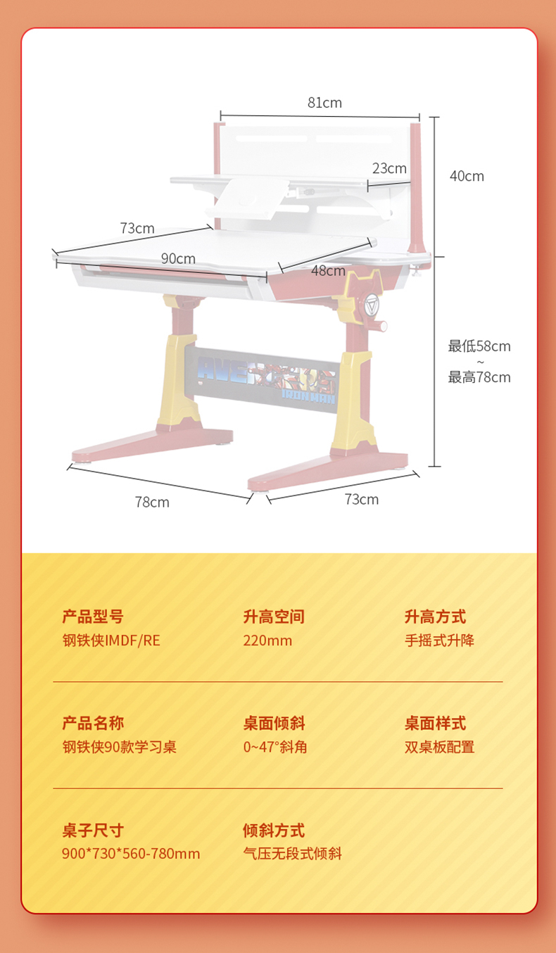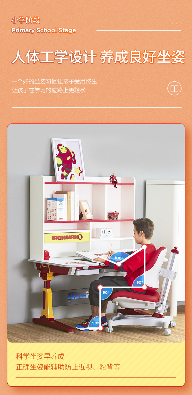 幸福果 迪士尼钢铁侠联名款儿童学习桌90*73cm 含书架&儿童坐椅套装