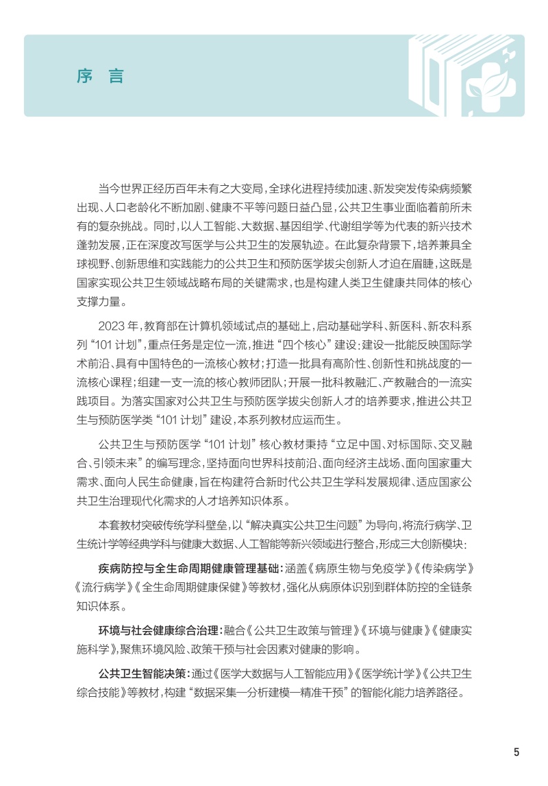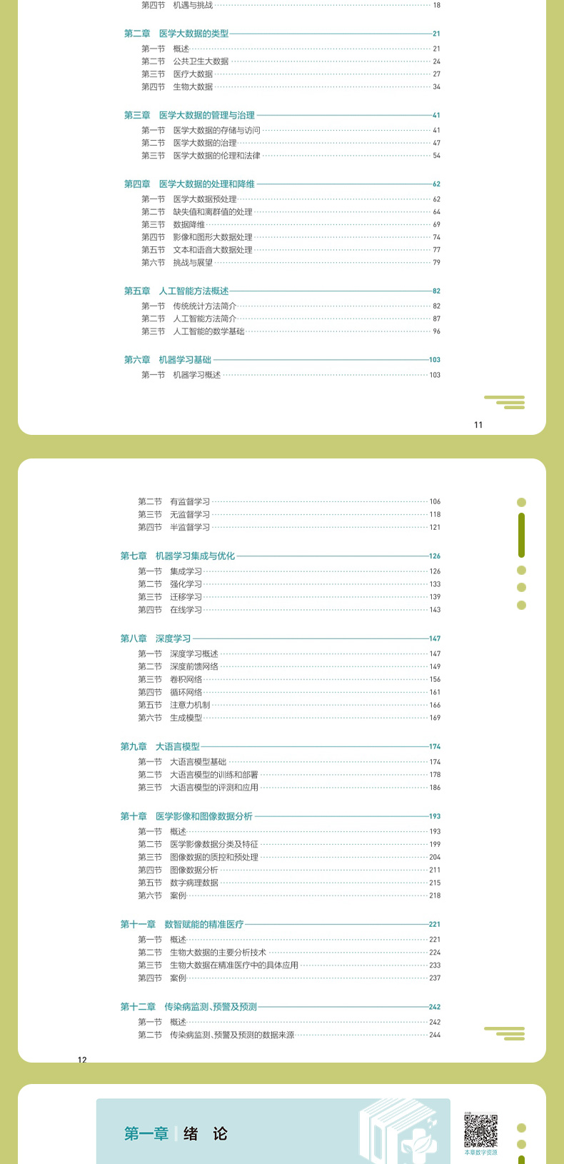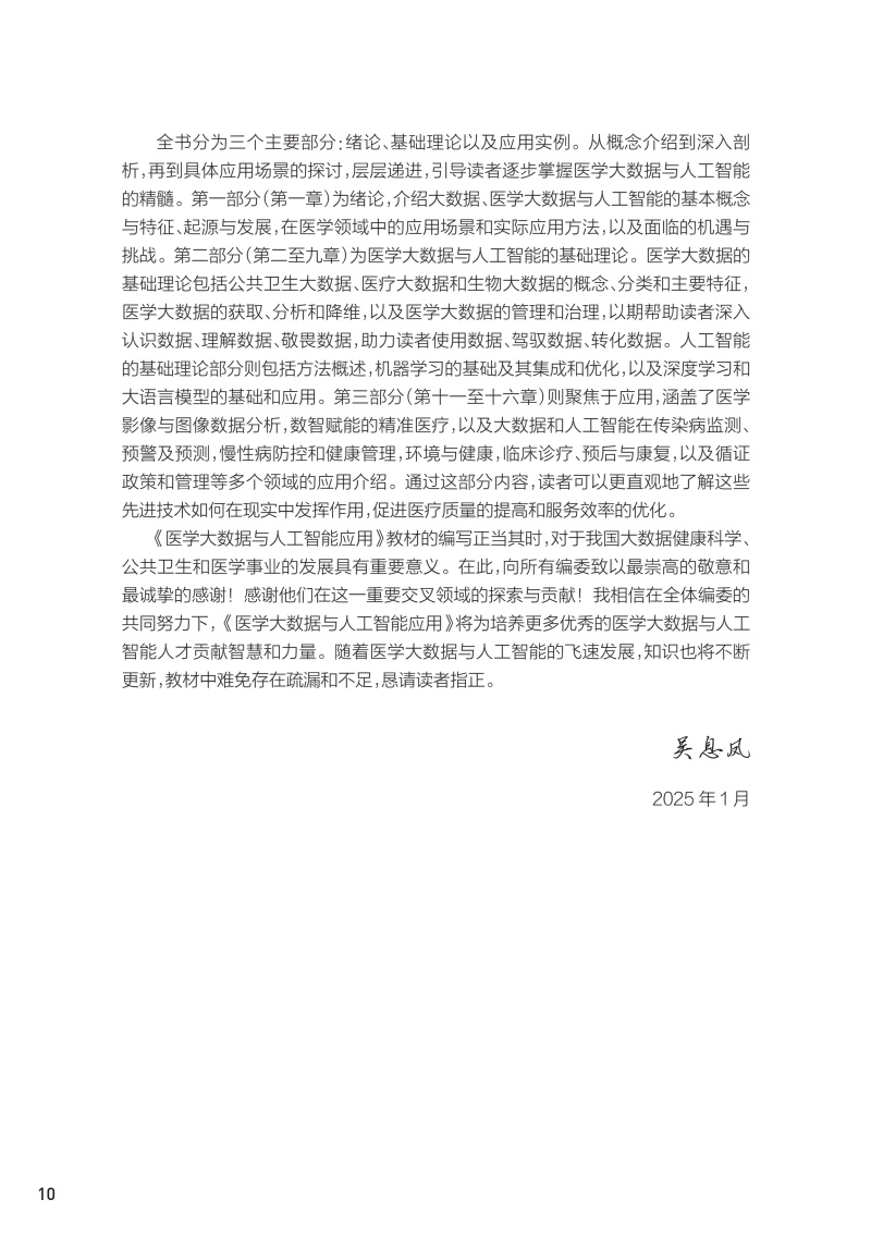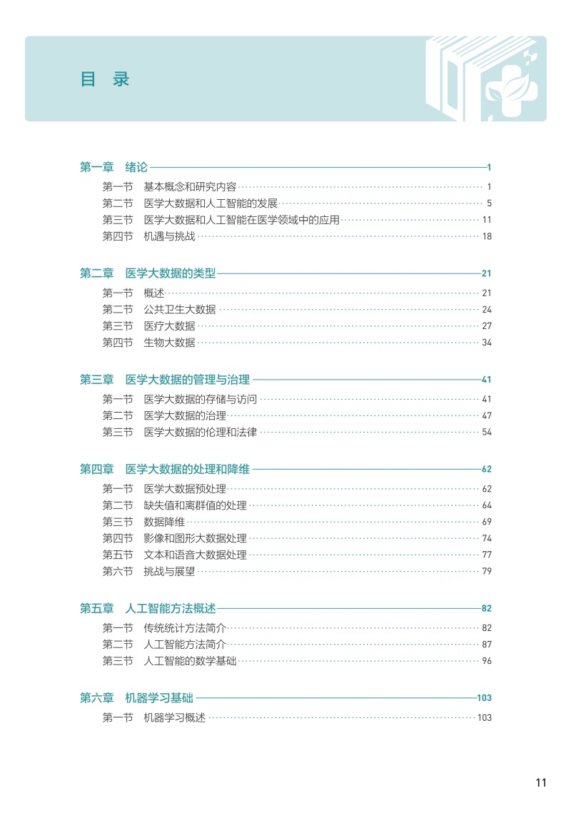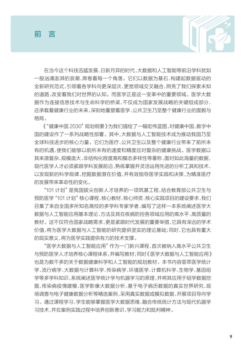 本教材共设置四部分内容。**部分以医学大数据基础知识为主线,阐述医学大数据的基本特点、研究及应用、所面临的挑战;以及公共卫生大数据、医疗健康大数据、生物大数据等三种主要的大数据类型。**部分重点介绍医学大数据处理、管理和治理,包括数据提取、处理、数据降维,医学大数据的管理、治理及伦理。第三部分介绍医学大数据分析技术,包括常见机器学习模型和常见深度学习模型等。第四部分介绍机器学习在医学大数据分析中的实际应用,包括多个精选案例的真实数据或模拟数据应用。